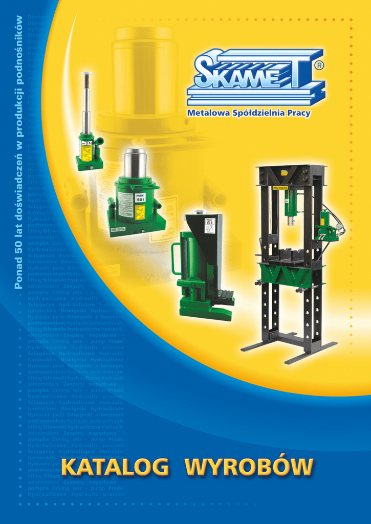 Ponad 50 lat doświadczeń w produkcji podnośników Metalowa Spółdzielnia Pracy Szanowni Państwo Z przyjemnością przedstawiamy Państwu nowy katalog dźwigników hydraulicznych i innych urządzeń hydrauliki siłowej produkowanych przez naszą firmę. Metalowa Spółdzielnia Pracy „SKAMET” powstała w 1950 r. i od wielu lat produkuje: dźwigniki hydrauliczne o udźwigu od 1,6 do 50 ton, siłowniki hydrauliczne, praski hydrauliczne z napędem ręcznym, ściągacze hydrauliczne i inne wyroby oparte o elementy dźwigników, takie jak: pompki z napędem ręcznym do siłowników i dźwigniki działające w pozycji odwróconej do prasek. Uznanie klientów i duże zainteresowanie sprawiły, że stale poszerzamy naszą ofertę uzupełniając ją o nowe propozycje. Wykonujemy również remonty i naprawy podnośników hydraulicznych i siłowników oraz wszystkie uszczelnienia do dźwigników. Produkowane przez naszą firmę dźwigniki posiadają Certyfikat na znak bezpieczeństwa wydany przez Państwowy Instytut Motoryzacji PIMOT w Warszawie. Potwierdza on wysoką jakość naszych wyrobów. W budowie dźwigników hydraulicznych zastosowano szereg rozwiązań konstrukcyjnych, które są przedmiotem wzorów użytkowych i patentem, zastrzeżonych w Urzędzie Patentowym. Mamy nadzieję, że katalog przybliży Państwu tę grupę naszych wyrobów i ułatwi dokonanie właściwego wyboru. W przypadku zainteresowania naszą ofertą, jesteśmy do Państwa dyspozycji służąc zarówno doradztwem technicznym, jak i sprawną obsługą przy dokonywaniu zakupu. Zapraszamy do współpracy bezpośrednio w naszej firmie oraz poprzez sieć naszych dystrybutorów. Listopad 2011 Dear Sir/Madam We have the pleasure to present you the new catalogue of hydraulic jacks and other hydraulic equipment manufactured by our firm. SKAMET Metal Cooperative was founded in 1950. For many years we have been manufacturing the following equipment: hydraulic jacks, having capacities from 1,6 t to 50 t, hydraulic cylinders, hydraulic hand presses, hydraulic pullers and other devices based on jack components, such as hand pumps for cylinders and jacks working in a reversed position towards presses. As our firm enjoys much interest and receives wide recognition among customers, we constantly try to broaden our production range, supplementing it with new items. We also recondition and repair hydraulic lifts and servomotors, and make all types of seals for jacks. The jacks manufactured by our firm have Safety Certificate given by PIMOT – the State Motorization in Warsaw. It confirms high quality of our products. In the construction of our hydraulic jacks we used some structural design and solutions which – as model Patent – are protected by Patent. We hope that with this catalogue we will acquaint you better with this set of our products, which enable you to make the best choice. If you are interested in our offer, we are at your disposal, offering you both technical advice and efficient service – here in our firm or through our local distributors. November 2011 Szymon Horosz Prezes Zarządu President of the Board 2 Metalowa Spółdzielnia Pracy tel./fax +48 41 251 39 32 Metal Cooperative Katalog pobrany z serwisu www.katalogi-narzedziowe.pl Producent: The producer of: Dźwigników hydraulicznych 4 Hydraulic jacks Dźwigników z bocznym podnoszeniem 6 5 Hydraulic jacks with side lifting Pomp hydraulicznych 7 8 Hydraulic pumps Prasek hydraulicznych 8 9 Hydraulic presses Siłowników hydraulicznych 10 6 Hydraulic cylinders Podnośników kanałowych 17 10 Pit jacks Podnośników pneumatycznych 20 10 Pneumatic jacks Ściągaczy hydraulicznych 21 10 Hydraulic pullers tel./fax +48 41 251 39 32 Metalowa Spółdzielnia Pracy Metal Cooperative 3 Dźwigniki hydrauliczne S S2 h H S S1 B A Dźwigniki przystosowane są do pracy w układzie pionowym i w pewnym zakresie w pozycji poziomej (~70% wysuwu). Do 30 T wykonane są także jako teleskopowe, standardowo wszystkie dźwigniki i pompy wyposażone są w zawór przeciążeniowy. Na zamówienie mogą być wykonane dźwigniki o innych parametrach niż podane w tabelce. Hydraulic jacks are adapted to work in vertical positions and, to some extent, in horizontal positions (~70% of the piston travel). All the jacks and pumps are equipped with an overload valve as a standard. Those up to 20 t are telescopic. Jacks with other parameters different those in the table can be made to order. CHARAKTERYSTYKA DŹWIGNIKÓ W • JACKS – TECHNICAL DATA Lp. No. Rodzaj/Type Dźwigniki Hydraulic jacks Udźwig nominalny Indeks Index Nominal lifting capacity Maks. wysokość dźwignika w stanie złożonym 16 (1,6) 2 W-2200 20 (2) 3 4 5 6 7 8 9 10 11 TELESKOPOWE \ TELESCOPIC W-1600 Ciężar Gabaryty podstawy Max. travel of piston (s) Weight Dimensions of the base „H” – mm „S”(S1+S2) – mm kg „A” x „B” – mm do 155 407 190 3,2 100 x 77 155 407 190 3,2 100 x 77 Height of a jack with Max. height of an assembled jack a protruding screw kN (t) 1 Wysokość dźwignika Maksymalny wysuw tłoka/tłoków z wykręconą śrubą „h” – mm W-6400 25 (2,5) 155 377 172 3,5 100 x 77 W-4700 35 (3,5) 155 400 180 4,7 113 x 90 W-750 50 (5) 183 460 195 7 125 x 100 W-5300 50 (5) 250 650 320 8,3 125 x 100 W-8100 50 (5) 250 650 320 12,6 191 x 120 W-5400 100 (10) 265 650 270 18,9 170 x 141 W-5500 160 (16) 285 720 325 23,2 205 x 145 W-6350 100 (10) 150 340 150 13,8 170 x 141 W-7720 160 (16) 160 350 150 16,2 183 x 150 W-7700 200 (20) 160 350 150 16,2 183 x 150 W-8045 300 (30) 130 230 100 33 270 x 200 W-7320 80 (8) 255 485 160 8,8 125 x 100 W-7300 100 (10) 255 485 160 8,8 125 x 100 14 15 16 17 18 19 20 21 22 23 JEDNOTŁOKOWE \ SINGLE-PISTON 12 13 W-7340 120 (12) 255 485 160 9 125 x 100 W-7400 160 (16) 257 480 154 11,7 143 x 120 W-7420 200 (20) 257 480 154 12,8 143 x 120 W-7500 250 (25) 257 475 152 13,8 156 x 120 W-7520 300 (30) 257 475 152 13,8 156 x 120 W-7760 300 (30) 200 360 100 12,5 144 x 140 W-8000 300 