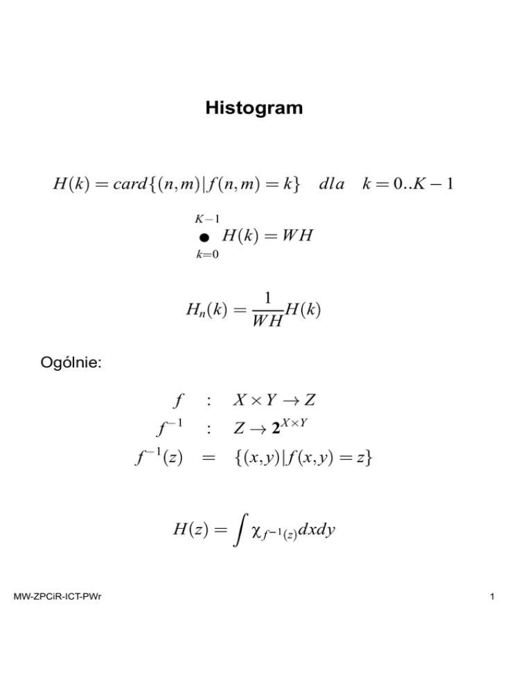 Histogram H k card n m f n m k dla k 0 K 1 K 1 ∑ H k WH k 0 1 H k WH Hn k Ogólnie: f f 1 f 1 z Y Z : Z 2X Y x y f x y z : H z MW-ZPCiR-ICT-PWr X χf dxdy 1 z 1 Transformacje punktowe obrazów Normalizacja dziedziny i przeciwdziedziny: 0 z 1 v T z 0 T z 1 z T 1 v Hn z – histogram obrazu oryginalnego Gn v – histogram obrazu po transformacji T Gn v Hn z dz dv z T 1 v Przykład T (negatyw): T z 1 z MW-ZPCiR-ICT-PWr 2 1 Gn v Rozciaganie histogramu (stretching) z l u 1 Hn z 1 0 T z uz 1 MW-ZPCiR-ICT-PWr l l gdy z l gdy l z u gdy z ! u 3 1 " Gn v Normalizacja histogramu z l u 1 Hn z 1 l % 0 Hn z dz εl # l u$ : % u1 Hn z dz εu MW-ZPCiR-ICT-PWr 4 Wyrównywanie histogramu (equalization) Gn dv 1 v & z 1 1 Hn z dz v T z % 0z Hn w dw dla 0 z 1 Gn v dv MW-ZPCiR-ICT-PWr 1 dv Hn z dz # Hn z dz$ z dv T 1 v 5 Wyrównywanie histogramu w przypadku dyskretnym Hn qk nk n 0 zk 1 k 0 K 1 K – ilość poziomów kwantyzacji, nk – ilość punktów o jasności qk , n – ilość wszystkich punktów obrazu. Dystrybuanta rozkładu dyskretnego Hn qk : vk dla MW-ZPCiR-ICT-PWr T qk 0 qk k nj ∑n j 0 k ∑ Hn q j j 0 1 k 0 K 1 6 Przykładowy wynik dyskretnego wyrównywania histogramu (Gonzales, Wintz) Obraz o ośmiu stopniach szarości i rozmiarach 64 K 64: 8, n 4096 qk nk 0 790 1023 850 656 329 245 122 81 1 7 2 7 3 7 4 7 5 7 6 7 1 MW-ZPCiR-ICT-PWr H qk nk n 0.19 0.25 0.21 0.16 0.08 0.06 0.03 0.02 wk ∑kj 0 H qk 0.19 0.44 0.65 0.81 0.89 0.95 0.98 1.00 vk wk 1 7 3 7 5 7 6 7 6 7 1 1 1 7 Przykład: obraz przed wyrównaniem histogramu MW-ZPCiR-ICT-PWr 8 MW-ZPCiR-ICT-PWr 9 Przykład: obraz po wyrównaniu histogramu MW-ZPCiR-ICT-PWr 10 Histogram dwuwymiarowy Y Z g : X Y V f 1 : Z 2X Y g 1 : V 2X Y f 1 z x y f x y z g 1 v x y g x y v f H f g z v MW-ZPCiR-ICT-PWr : X χf ' χg 1 v dxdy 1 z 11 Macierz sasiedztwa Cr z v card x y )( ξ ψ r , X * + xf yx ry ξ ψz + f ξ ψ v Y X Y Przykład dla sasiedztwa prawostronnego: r * x y - x . 1 y /0 Cr z v H f g z v g x y MW-ZPCiR-ICT-PWr f x . 1 y 12 Przykład numeryczny 0 0 0 0 obraz 1 0 0 1 1 1 2 1 2 1 2 1 0 obraz 2 3 2 0 1 0 2 0 1 0 1 2 3 z 0 1 2 3 H(z) 7 5 3 1 0 0 0 1 z 0 1 2 3 H(z) 7 5 3 1 0 1 2 3 0 3 0 0 0 1 3 2 0 0 2 0 2 1 0 3 0 0 1 0 0 1 2 3 0 1 2 3 0 1 2 1 0 0 2 1 0 0 1 3 0 1 0 0 1 Duże wyrazy Cr skupione w pobliżu przekatnej oznaczaja,1 że w sasiedztwie punktów o danej jasności sa1 przeważnie punkty o 1 jasnościach zbliżonych (obraz 1), co oznacza wolnozmienność jasności i mała1 ilość drobnych szczegółów. Oddalenie dużych wyrazów Cr od przekatnej (obraz 2) wiaże 1 1 sie1 z wystepowaniem dużej ilości gwałtownych zmian jasności 1 (krawedzi, drobnych szczegółów). 1 MW-ZPCiR-ICT-PWr 13 Ilustracja własności macierzy sasiedztwa obraz ostry MW-ZPCiR-ICT-PWr obraz nieostry 14