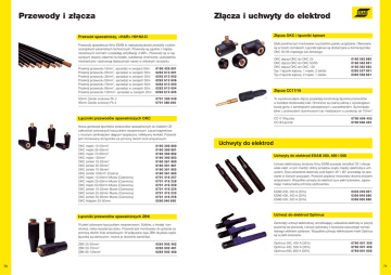 Przewody i złącza Złącza i uchwyty do elektrod Przewód spawalniczy, <HAR> H01N2-D Złącza OKC i łączniki kątowe Przewody spawalnicze firmy ESAB to najwyższej jakości produkty o pierwszorzędnych parametrach technicznych. Przewody są zgodne z międzynarodowymi normami i posiadają certyfikację <HAR>. Przewody są w najwyższym stopniu odporne na światło, substancje chemiczne, uszkodzenia mechaniczne i zachowują elastyczność nawet w chłodnym otoczeniu. Styki powinny być montowane na przednim panelu urządzenia. Oferowane są w trzech rozmiarach. Łączniki kątowe są dostarczane w formie łącznika OKC 50-95 męskiego lub żeńskiego. Przekrój przewodu 16mm2, sprzedaż w zwojach 50m Przekrój przewodu 25mm2, sprzedaż w zwojach 50m Przekrój przewodu 35mm2, sprzedaż w zwojach 50m Przekrój przewodu 50mm2, sprzedaż w zwojach 50m Przekrój przewodu 70mm2, sprzedaż w zwojach 50m Przekrój przewodu 95mm2, sprzedaż w zwojach 50m Przekrój przewodu 120mm2, sprzedaż w zwojach 25m 0190 0262 0262 0262 0262 0262 0262 50mm Zacisk oczkowy Pk 3 95mm Zacisk oczkowy Pk 3 0701 380 049 0701 380 050 429 613 613 613 613 613 613 OKC złącza OKC do OKC 25 OKC złącza OKC do OKC 50/95 OKC złącza OKC do OKC 120 Typ 1 łącznik kątowy, 1 męski, 2 żeński Typ 2 łącznik kątowy, 2 męski, 1 żeński 801 601 602 606 603 604 605 0160 362 880 0160 362 881 0160 362 882 0365 557 001 0365 558 001 Złącza CC17/18 Te wysokowydajne złącza posiadają konstrukcję łączenia przewodów w kształcie stożkowatej tulei. Chronione są czarną osłoną z wysokogatunkowej gumy z zamknięciem zatrzaskowym i uszczelnieniem. Są kompatybilne z przewodami aluminiowymi lub miedzianymi o przekroju do 70mm2. Łączniki przewodów spawalniczych OKC CC17 Wtyczka CC18 Łącznik 0700 606 402 0700 606 403 Nowa generacja łączników przewodów spawalniczych ze znakiem CE całkowicie izolowanych kauczukiem neoprenowym. Łącze bagnetowe z mocnym zamknięciem dającym bezpieczny i efektywny kontakt. Przewód jest montowany do łącznika za pomocą dwóch śrub ampulowych. OKC męski 10-25mm2 OKC męski 35-50mm2 OKC męski 70-95mm2 OKC męski 120mm2 OKC żeński 10-25mm2 OKC żeński 35-50mm2 OKC żeński 70-95mm2 OKC żeński 120mm2 (Czarny) OKC męski 10-25mm Murex (Czerwony) OKC męski 25-50mm Murex (Czerwony) OKC męski 50-95mm Murex (Czerwony) OKC żeński 10-25mm Murex (Czerwony) OKC żeński 25-50mm Murex (Czerwony) OKC żeński 50-95mm Murex (Czerwony) OKC Adapter 25-50mm 0160 360 880 0160 360 881 0160 360 882 0160 360 883 0160 361 880 0160 361 881 0160 361 882 0160 361 883 0701 416 257 0701 416 258 0701 416 259 0701 416 254 0701 416 255 0701 416 256 0590 046 800 W pełni izolowane kauczukiem neoprenowym. Solidne, o trwałej konstrukcji, niska rezystancja styku. Przewód jest montowany do gniazda za pomocą dwóch śrub ampulowych. W połączeniu typu ZBK obydwie części łącznika są identyczne i można je dowolnie zamieniać. 70 Uchwyty do elektrod ESAB 200, 400 i 500 Uchwyt elektrodowy śrubowy firmy ESAB posiada certyfikat CE i oferuje wiele zalet, w tym: bardzo dobry przepływ prądu między elektrodą a uchwytem. Dwa ustawienia elektrody pod kątem 45° i 90° pozwalają na spawanie w różnych pozycjach. Przewód prądowy mocowany dwoma śrubami ampulowymi. Wszystkie uchwyty do elektrod są w pełni izolowane, zapewniając maksymalną ochronę użytkownika. ESAB 200, 200 A (35%) ESAB 400, 400 A (35%) ESAB 500, 500 A (35%) 0333 249 001 0369 849 880 0369 850 880 Uchwyt do elektrod Optimus Łączniki przewodów spawalniczych ZBK ZBK 25-35mm2 ZBK 50-70mm2 ZBK 95-120mm2 Uchwyty do elektrod 0265 902 482 0265 902 481 0265 902 480 Zamknięty uchwyt elektrodowy umożliwiający ustawienie elektrody w pozycji poziomej lub pionowej. Uchwyt wykonany z tworzywa sztucznego wzmacnianego włóknem szklanym. Wszystkie uchwyty elektrodowe marki Optimus są w pełni izolowane. Optimus 300, 400 A (35%) Optimus 400, 500 A (35%) Optimus 600, 600 A (35%) 0760 001 300 0760 001 400 0760 001 600 71 Przewody i złącza Złącza i uchwyty do elektrod Przewód spawalniczy, <HAR> H01N2-D Złącza OKC i łączniki kątowe Przewody spawalnicze firmy ESAB to najwyższej jakości produkty o pierwszorzędnych parametrach technicznych. Przewody są zgodne z międzynarodowymi normami i posiadają certyfikację <HAR>. Przewody są w najwyższym stopniu odporne na światło, substancje chemiczne, uszkodzenia mechaniczne i zachowują elastyczność nawet w chłodnym otoczeniu. Styki powinny być montowane na przednim panelu urządzenia. Oferowane są w trzech rozmiarach. Łączniki kątowe są dostarczane w formie łącznika OKC 50-95 męskiego lub żeńskiego. Przekrój przewodu 16mm2, sprzedaż w zwojach 50m Przekrój przewodu 25mm2, sprzedaż w zwojach 50m Przekrój przewodu 35mm2, sprzedaż w zwojach 50m Przekrój przewodu 50mm2, sprzedaż w zwojach 50m Przekrój przewodu 70mm2, sprzedaż w zwojach 50m Przekrój przewodu 95mm2, sprzedaż w zwojach 50m Przekrój przewodu 120mm2, sprzedaż w zwojach 25m 0190 0262 0262 0262 0262 0262 0262 50mm Zacisk oczkowy Pk 3 95mm Zacisk oczkowy Pk 3 0701 380 049 0701 380 050 429 613 613 613 613 613 613 OKC złącza OKC do OKC 25 OKC złącza OKC do OKC 50/95 OKC złącza OKC do OKC 120 Typ 1 łącznik kątowy, 1 męski, 2 żeński Typ 2 łącznik kątowy, 2 męski, 1 żeński 801 601 602 606 603 604 605 0160 362 880 0160 362 881 0160 362 882 0365 557 001 0365 558 001 Złącza CC17/18 Te wysokowydajne złącza posiadają konstrukcję łączenia przewodów w kształcie stożkowatej tulei. Chronione są czarną osłoną z wysokogatunkowej gumy z zamknięciem zatrzaskowym i uszczelnieniem. Są kompatybilne z przewodami aluminiowymi lub miedzianymi o przekroju do 70mm2. Łączniki przewodów spawalniczych OKC CC17 Wtyczka CC18 Łącznik 0700 606 402 0700 606 403 Nowa generacja łączników przewodów spawalniczych ze znakiem CE całkowicie izolowanych kauczukiem neoprenowym. Łącze bagnetowe z m