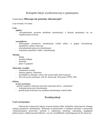 Konspekt lekcji wychowawczej w gimnazjum. Temat lekcji: Dlaczego nie jesteśmy tolerancyjni? Czas trwania: 45 minut Cele: ogólny: - uświadomienie uczniom problemu nietolerancji, z którym spotykamy się we współczesnym świecie. szczegółowe: - dostrzeganie przejawów nietolerancji wokół siebie, w grupie rówieśniczej, sąsiedztwie, prasie, telewizji - uświadomienie przyczyn nietolerancji - wskazanie sposobów walki z nietolerancją Metody: - drama - metoda trójkąta - dyskusja - praca w grupach Materiały i środki: - scenariusze scenek - arkusze papieru i flamastry - przykładowe artykuły z prasy lub wypowiedzi telewizyjnych - Słownik języka polskiego, red. M. Szymczak, Warszawa: PWN 1981 Efekty: uczeń/ uczennica: - potrafi wyjaśnić własnymi słowami znaczenie słowa „ tolerancja”, - wskazuje przyczyny nietolerancji - potrafi przeciwstawiać się oznakom nietolerancji wokół siebie Przebieg lekcji Część nawiązująca: Nauczyciel rozpoczyna lekcję od przeczytania kilku artykułów dotyczących róŜnego rodzaju przejawów nietolerancji. Wskazuje na doniesienia w mediach mówiące o protestach i demonstracjach przeciwko osobom o odmiennej orientacji seksualnej, poglądach politycznych, walkach pseudo kibiców, czy teŜ o konfliktach wybuchających na tle rasowym. Część właściwa: Nauczyciel zwraca się do uczniów, aby przytoczyli własne przykłady róŜnego reagowania ludzi na tą samą sytuację ( najlepiej, aby dotyczyła ona ich grupy rówieśniczej lub bliskiego otoczenia, sąsiedztwa). Zadaje pytanie: „Dlaczego ludzie reagują na tą samą sytuację w róŜny sposób i od jakich czynników taka reakcja zaleŜy?”(zapisuje pytanie na tablicy). Ćwiczenie 1 – odgrywanie scenek. Wychowawca prosi 4 chętnych uczniów do odegrania scenek. (Uczniowie odgrywają scenki na podstawie otrzymanych od nauczyciela scenariuszy, po zapoznaniu się z nimi). Wychowawca wyjaśnia klasie, Ŝe jeden z bohaterów scenki to człowiek chory na AIDS a drugo jest właścicielem mieszkania. Scenka 1. ( instrukcja dla ucznia odgrywającego rolę właściciela mieszkania) Sąsiad przychodzi poradzić się w sprawie kupna telewizora. Wiesz, Ŝe jest chory na AIDS, wiesz równieŜ, w jaki sposób moŜna się zarazić tą chorobą, dlatego bez oporów witasz się podając rękę. Zapraszasz go do siebie, proponujesz kawę. Siadacie na kanapie, traktujesz go tak jak kaŜdego innego znajomego. Chwilę rozmawiacie, po kilku minutach Ŝegnacie się, sąsiad idzie do siebie. Scenka 2. ( instrukcja dla ucznia odgrywającego rolę właściciela mieszkania) Sąsiad przychodzi poradzić się w sprawie kupna telewizora. Wiesz, Ŝe jest chory na AIDS, ociągasz się przed podaniem mu ręki ( udajesz, Ŝe nie widzisz wyciągniętej dłoni). Wprawdzie zapraszasz go do domu, ale nie proponujesz kawy. Wyjaśniasz, Ŝe bardzo się śpieszysz, Ŝe zaraz musisz wyjść. Sąsiad nie korzysta z zaproszenia, chwilę rozmawiacie w drzwiach, po czym kaŜdy wraca do siebie. Wychowawca prosi uczniów o analizę przedstawionych sytuacji, z czego wynikają róŜne zachowania właścicieli mieszkań. Uczniowie powinni określić, Ŝe w przypadku scenki 1 – właściciel mieszkania to człowiek świadomy, ale przede wszystkim tolerancyjny. W scence 2 – właściciel jest nieuświadomiony oraz nietolerancyjny. Odpowiedzi uczniów stanowią jednocześnie częściową odpowiedź na zapisane na tablicy pytanie. Wychowawca inspiruje dyskusję, czym jest tolerancja we współczesnym świecie. Uczniowie podejmują próby zdefiniowania tego pojęcia – praca w grupach ( zapisują przez 2 min. swoje wyjaśnienia na papierze) Nauczyciel prosi jednego z uczniów o odczytanie ze Słownika języka polskiego definicji tego słowa: „Tolerancja – uznawanie czyichś poglądów, wierzeń, upodobań, czyjegoś postępowania, róŜniących się od własnych; wyrozumiałość”. Uczniowie porównują swoje próby zdefiniowania słowa tolerancja z definicją słownikową. Nauczyciel stwierdza, Ŝe obecnie (na podstawie przytoczonych na początku lekcji przykładów własnych oraz uczniów) coraz częściej mamy do czynienia z postawami braku tolerancji. Proponuje, by zastanowić się, jakie są tego przyczyny. W trakcie rozmowy uzupełniany jest narysowany na arkuszu papieru schemat (metoda trójkąta). Nietolerancja - przyczyny ( metoda trójkąta) przyczyny podtrzymujące Dlaczego ludzie są nietolerancyjni? sposoby usunięcia przyczyn strach poczucie zagroŜenia brak wiedzy Nauczyciel prosi uczniów, aby wskazali grupę/grupy ludzi, którzy najczęściej są obiektem nietolerancji oraz określili, dlaczego są dyskryminowani lub budzą niechęć (praca w grupach, uczniowie zapisują na papierze swoje spostrzeŜenia przez ok. 5 min.). Liderzy grup odczytują swoje zapisy i uzasadniają je, np: - śydzi – chciwi, wzbogacający się kosztem Polaków, gromadzący duŜe majątki, rządzący finansami światowymi Murzyni, Arabowie – leniwi, brudasy, mało inteligentni Homoseksualiści (lesbijki, geje) - rozpustni, zboczeńcy, chorzy, niemoralni, nosiciele HIV Przedstawiciele innych narodów – mówią źle o Polakach, wywyŜszają się, poniŜają nas, wyzyskują w pracy Przedstawiciele innych religii i wyznań (muzułmanie, buddyści, Świadkowie Jehowy) lub osoby niewierzące – terroryści, zeszli na złą drogę, wrogowie narodu Nauczyciel pyta uczniów: „Czy te oceny są zgodne z rzeczywistością, czy dane grupy ludzi są rzeczywiście takie?” Rolą nauczyciela jest, tak pokierować dyskusją, aby uczniowie dostrzegli, Ŝe są to oceny krzywdzące i są to stereotypy. Nauczyciel rozdaje kaŜdej grupie karteczki z nazwami poszczególnych postaw nietolerancji i prosi o znalezienie ich wyjaśnienia w Słowniku języka polskiego (kaŜda grupa wyjaśnia jedną nazwę, a następnie liderzy grup głośno odczytują znalezione wyjaśnienie): • Antysemityzm – uprzedzenie, nienawiść, wrogość w stosunku do ś