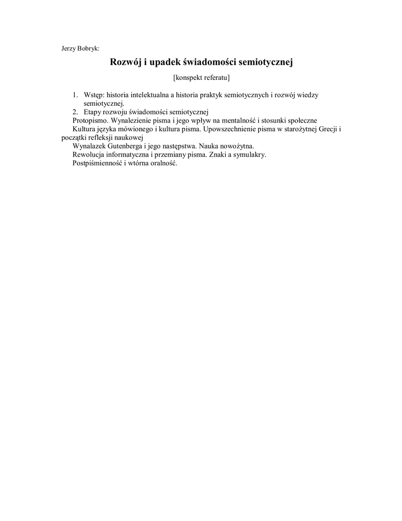Jerzy Bobryk: Rozwój i upadek świadomości semiotycznej [konspekt referatu] 1. Wstęp: historia intelektualna a historia praktyk semiotycznych i rozwój wiedzy semiotycznej. 2. Etapy rozwoju świadomości semiotycznej Protopismo. Wynalezienie pisma i jego wpływ na mentalność i stosunki społeczne Kultura języka mówionego i kultura pisma. Upowszechnienie pisma w starożytnej Grecji i początki refleksji naukowej Wynalazek Gutenberga i jego następstwa. Nauka nowożytna. Rewolucja informatyczna i przemiany pisma. Znaki a symulakry. Postpiśmienność i wtórna oralność.