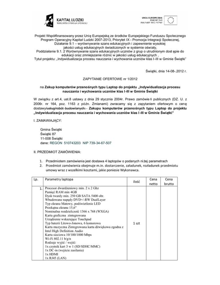 Projekt Współfinansowany przez Unię Europejską ze środków Europejskiego Funduszu Społecznego Program Operacyjny Kapitał Ludzki 2007-2013, Priorytet IX - Promocja Integracji Społecznej, Działanie 9.1 – wyrównywanie szans edukacyjnych i zapewnienie wysokiej jakości usług edukacyjnych świadczonych w systemie oświaty, Poddziałanie 9.1. 2 Wyrównywanie szans edukacyjnych uczniów z grup o utrudnionym dost ępie do edukacji oraz zmniejszanie różnic w jakości usług edukacyjnych , Tytuł projektu: „Indywidualizacja procesu nauczania i wychowania uczniów klas I -III w Gminie Świątki” Świątki, dnia 14-08-.2012 r. ZAPYTANIE OFERTOWE nr 1/2012 na Zakup komputerów przenośnych typu Laptop do projektu „Indywidualizacja procesu nauczania i wychowania uczniów klas I -III w Gminie Świątki W związku z art.4, ust.8 ustawy z dnia 29 stycznia 2004r. Prawo zamówie ń publicznych (DZ. U. z 2006r. nr 164, poz. 1163 z późn. Zmianami) zwracamy się z zapytaniem ofertowym o cenę dostawy/usług/robót budowlanych: Zakupu komputerów przenośnych typu Laptop do projektu „Indywidualizacja procesu nauczania i wychowania uczniów klas I -III w Gminie Świątki” I. ZAMAWIAJĄCY: Gmina Świątki Świątki 87 11-008 Świątki dane: REGON 510743203 NIP 739-34-67-507 II. PRZEDMIOT ZAMÓWIENIA: 1. Przedmiotem zamówienia jest dostawa 4 laptopów o podanych ni żej parametrach 2. Przedmiot zamówienia obejmuje m.in. dostarczenie, załadunek, rozładunek przedmiotu umowy wraz z wszelkimi kosztami, jakie poniesie Wykonawca. Lp. Parametry laptopa ilość 1. Procesor dwurdzeniowy min. 2 x 2 Ghz Pamięć RAM min 4GB Dysk twardy min. 250 GB SATA 5400 obr. Wbudowane napędy DVD+/-RW DualLayer Typ ekranu Matowy, podświetlenie LED Przekątna ekranu 15,6" Nominalna rozdzielczość 1366 x 768 (WXGA) Karta graficzna zintegrowana Urządzenie wskazujące Touchpad Typ baterii Litowo-Jonowa, 6 komorowa Karta muzyczna Zintegrowana karta dźwiękowa zgodna z Intel High Definition Audio Karta sieciowa 10/100/1000 Mbps Wi-Fi 802.11 b/g/n Rodzaje wyjść / wejść: 1x czytnik kart 3 w 1 (SD/SDHC/MMC) 1x DC-in (wejście zasilania) 1x HDMI 1x RJ45 (LAN) 1 szt Cena netto Cena brutto 1x VGA (D-sub) 1x wejście mikrofonowe 1x wyjście słuchawkowe/głośnikowe 3x USB Zainstalowany system operacyjny Microsoft Windows 7 Home Premium PL (wersja 64-bitowa) Wbudowana kamera internetowa 1,3 Mpix Wbudowane głośniki stereo (2 x 2 W) Wbudowany mikrofon Zasilacz w zestawie 2. Procesor dwurdzeniowy min. 2 x 2 Ghz Pamięć RAM min 2GB Dysk twardy min. 250 GB SATA 5400 obr. Wbudowane napędy DVD+/-RW DualLayer Typ ekranu Matowy, podświetlenie LED Przekątna ekranu 15,6" Nominalna rozdzielczość 1366 x 768 (WXGA) Karta graficzna zintegrowana Urządzenie wskazujące Touchpad Typ baterii Litowo-Jonowa, 6 komorowa Karta muzyczna Zintegrowana karta dźwiękowa zgodna z Intel High Definition Audio Karta sieciowa 10/100/1000 Mbps Wi-Fi 802.11 b/g/n Rodzaje wyjść / wejść: 1x czytnik kart 3 w 1 (SD/SDHC/MMC) 1x DC-in (wejście zasilania) 1x HDMI 1x RJ45 (LAN) 1x VGA (D-sub) 1x wejście mikrofonowe 1x wyjście słuchawkowe/głośnikowe 3x USB Zainstalowany system operacyjny Microsoft Windows 7 Home Premium PL (wersja 64-bitowa) Wbudowana kamera internetowa 1,3 Mpix Wbudowane głośniki stereo (2 x 2 W) Wbudowany mikrofon Zasilacz w zestawie 3. 3 szt Ponieważ Zamawiający nie może opisywać przedmiotu zamówienia poprzez wskazanie znaków towarowych, patentów lub znaków pochodzenia, chyba, że jest to uzasadnione specyfiką przedmiotu zamówienia a zamawiający nie może opisać przedmiotu zamówienia za pomocą dostatecznie dokładnych określeń, dlatego wszędzie gdzie z opisu przedmiotu zamówienia wynika wskazanie znaków towarowych, patentów lub znaków pochodzenia wykonawca przyjmie, że wskazaniu takiemu towarzyszą wyrazy „lub równoważny” i wykonawca może zaoferować przedmiot równoważny. Zatem wszystkie wskazane z nazwy materiały i przyjęte technologie użyte w specyfikacji technicznej należy rozumieć jako określenie wymaganych parametrów technicznych lub standardów jakościowych. Oznacza to, że Zamawiający dopuszcza składanie ofert równoważnych dla nazwanych urządzeń oraz proponowanej technologii wykonania, wymienionych w dokumentacji technicznej z zachowaniem jej wymogów w zakresie jakości i funkcjonalności. Materiały równoważne muszą być w ofercie wymienione z nazwy ciężar udowodnienia o zachowaniu parametrów wymaganych przez zamawiającego leży po stronie składającego ofertę. III. TERMIN REALIZACJI ZAMÓWIENIA: Termin realizacji przedmiotu zamówienia – 1wrzesień 2012r. Dokładny termin realizacji zostanie wskazany w umowie zawartej z Wykonawcą po wyborze oferty. IV. OPIS SPOSOBU PRZYGOTOWANIA OFERTY: Ofertę sporządzić należy w języku polskim, w formie pisemnej nieścieralnym atramentem lub długopisem, na maszynie, komputerze, w sposób czytelny i trwa ły. Każdy Wykonawca składa tylko jedną ofertę. Oferta winna: - posiadać datę sporządzenia na zapytanie ofertowe oraz nazw ę przedmiotu zamówienia, - być podpisana własnoręcznym czytelnym podpisem wykonawcy lub opiecz ętowana pieczątką firmową z własnoręcznym czytelnym podpisem osoby upoważnionej, - posiadać adres lub siedzibę oferenta, numer NIP, - posiadać numer telefonu kontaktowego, - określać cenę brutto podaną cyfrą i słownie za wykonanie przedmiotu zamówienia (w cenie brutto zwierają się koszty dostarczenia, przedmiotu umowy wraz z wszelkimi kosztami, jakie poniesie Wykonawca usługi), - określać warunki płatności, - określać termin realizacji zamówienia – początek i koniec realizacji przedmiotu zamówienia. Do oferty trzeba dołączyć: - termin gwarancji W przypadku składania ofert w siedzibie Zamawiającego lub pocztą/kurierem na kopercie nale ży umieścić napis: „Indywidualizacja procesu nauczania i wychowania uczniów klas I -III w Gminie Świątki