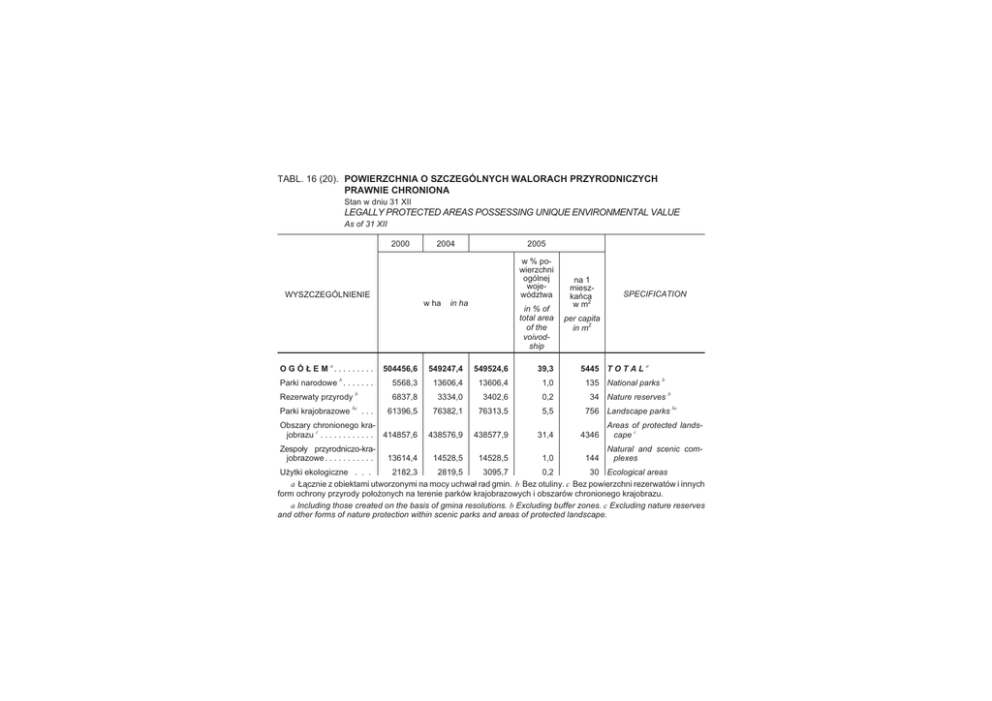 TABL. 16 (20). POWIERZCHNIA O SZCZEGÓLNYCH WALORACH PRZYRODNICZYCH PRAWNIE CHRONIONA Stan w dniu 31 XII LEGALLY PROTECTED AREAS POSSESSING UNIQUE ENVIRONMENTAL VALUE As of 31 XII 2000 2004 2005 w % powierzchni ogólnej województwa WYSZCZEGÓLNIENIE w ha in ha in % of total area of the voivodship na 1 mieszkañca w m2 SPECIFICATION per capita in m2 O G Ó £ E M a. . . . . . . . . 504456,6 549247,4 549524,6 39,3 Parki narodowe b . . . . . . . 5568,3 13606,4 13606,4 1,0 Rezerwaty przyrody b 6837,8 3334,0 3402,6 0,2 34 Nature reserves b 61396,5 76382,1 76313,5 5,5 756 Landscape parks bc Obszary chronionego krajobrazu c . . . . . . . . . . . . 414857,6 438576,9 438577,9 31,4 4346 Areas of protected landscape c 14528,5 14528,5 1,0 144 Natural and scenic complexes Parki krajobrazowe bc . . . Zespo³y przyrodniczo-krajobrazowe . . . . . . . . . . . 13614,4 5445 T O T A L a 135 National parks b U¿ytki ekologiczne . . . 2182,3 2819,5 3095,7 0,2 30 Ecological areas a £¹cznie z obiektami utworzonymi na mocy uchwa³ rad gmin. b Bez otuliny. c Bez powierzchni rezerwatów i innych form ochrony przyrody po³o¿onych na terenie parków krajobrazowych i obszarów chronionego krajobrazu. a Including those created on the basis of gmina resolutions. b Excluding buffer zones. c Excluding nature reserves and other forms of nature protection within scenic parks and areas of protected landscape.