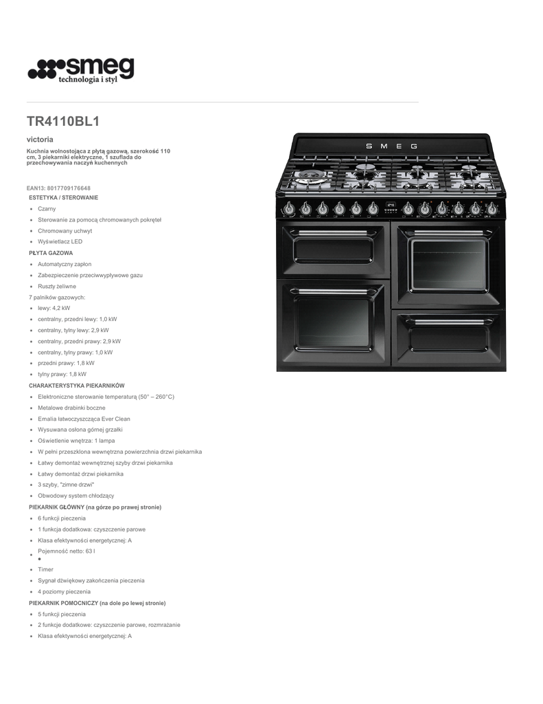 TR4110BL1 victoria Kuchnia wolnostojąca z płytą gazową, szerokość 110 cm, 3 piekarniki elektryczne, 1 szuflada do przechowywania naczyń kuchennych EAN13: 8017709176648 ESTETYKA / STEROWANIE Czarny Sterowanie za pomocą chromowanych pokręteł Chromowany uchwyt Wyświetlacz LED PŁYTA GAZOWA Automatyczny zapłon Zabezpieczenie przeciwwypływowe gazu Ruszty żeliwne 7 palników gazowych: lewy: 4,2 kW centralny, przedni lewy: 1,0 kW centralny, tylny lewy: 2,9 kW centralny, przedni prawy: 2,9 kW centralny, tylny prawy: 1,0 kW przedni prawy: 1,8 kW tylny prawy: 1,8 kW CHARAKTERYSTYKA PIEKARNIKÓW Elektroniczne sterowanie temperaturą (50° – 260°C) Metalowe drabinki boczne Emalia łatwoczyszcząca Ever Clean Wysuwana osłona górnej grzałki Oświetlenie wnętrza: 1 lampa W pełni przeszklona wewnętrzna powierzchnia drzwi piekarnika Łatwy demontaż wewnętrznej szyby drzwi piekarnika Łatwy demontaż drzwi piekarnika 3 szyby, "zimne drzwi" Obwodowy system chłodzący PIEKARNIK GŁÓWNY (na górze po prawej stronie) 6 funkcji pieczenia 1 funkcja dodatkowa: czyszczenie parowe Klasa efektywności energetycznej: A Pojemność netto: 63 l ● Timer Sygnał dźwiękowy zakończenia pieczenia 4 poziomy pieczenia PIEKARNIK POMOCNICZY (na dole po lewej stronie) 5 funkcji pieczenia 2 funkcje dodatkowe: czyszczenie parowe, rozmrażanie Klasa efektywności energetycznej: A Pojemność netto: 63 l ● 4 poziomy pieczenia PIEKARNIK Z GRILLEM (na górze po lewej stronie) 1 funkcja pieczenia: grill Pojemność netto: 36 l ● 2 poziomy pieczenia WYPOSAŻENIE STANDARDOWE Piekarnik główny: ruszt (2), ruszt do głębokiej blachy (1), głęboka blacha emaliowana (40 mm) (1), prowadnice teleskopowe z częściowym wysuwem (1) Piekarnik pomocniczy: ruszt (2), ruszt do głębokiej blachy (1), głęboka blacha emaliowana (40 mm) (1), prowadnice teleskopowe z częściowym wysuwem (1) Piekarnik z grillem: ruszt (1), głęboka blacha emaliowana (40 mm) (1) Płyta gazowa: ruszty żeliwne (4), pierścień żeliwny WOK (1), dysze do gazu G20 oraz G30 SPECYFIKACJA TECHNICZNA Moc przyłączeniowa: 8,4 kW Napięcie: 220-240 V lub 380-415 V Zabezpieczenie: 37 A Częstotliwość: 50/60 Hz Functions Piekarnik główny Piekarnik dodatkowy Smeg Polska Sp. z o.o. ul. Cybernetyki 9 02-677 Warszawa Tel. +48 22 276 14 00 TR4110BL1 victoria wolnostojące 110 cm czarny rodzaj płyty kuchennej: gazowa rodzaj piekarnika: elektryczny klasa energochłonności A Piekarnik główny GRZAŁKA DOLNA: Funkcja ta jest najbardziej odpowiednia do przygotowania potraw wymagających wysokiej temepratury od spodu, bez potrzeby przypiekania lub do powolnego pieczenia. Do ciast, pizzy, potrawek, lub zapiekanek. WENTYLATOR, GRZAŁKA DOLNA: Dodanie dolnej grzałki do wymuszonego obiegu podnosi temperaturę w dolnej części potrawy, zapewniając jej skuteczniejsze pieczenie środka bez przypiekania powierzchni. GRZAŁKA GÓRNA I DOLNA: Włączenie tych 2 grzałek stosuje się w pieczeniu tradycyjnym, odpowiednim do przygotowanie potraw wymagających delikatnego podgrzewania, jak np. pieczenie ciasta. Piekarnik powinien zostać wstępnie nagrzany do wymaganej temperatury, a naczynie ustawione po środku. Jest to metoda , która najlepiej sprawdza się w przypadku większych, pojedynczych wypieków. WENTYLATOR, GRZAŁKA PIERŚCIENIOWA: Grzałka w połączeniu z wentylatorem zapewniają równomierną temperaturę w całej komorze, na wszystkich półkach. Podczas pieczenia potraw ponad 20 minut, niepotrzebne jest stosowanie wstepnego rozgrzania piekarnika. Jest to metoda dająca oszczędność energii, kótszy czas podgrzewania. idealna do odgrzewania zimnych potraw. WENTYLATOR I GRZAŁKA GRILLA: Pieczenie przy uzyciu tej funkcji musi przebiegać przy zamkniętych drzwiczkach. Wentylator łagodzi silne grzanie grilla, jednocześnie zapewniając doskonałe grillowanie bez potrzeby odwracania pieczonej potrawy. Otrzymujemy potrawę doskonale przypieczoną, a zarazem soczystą. Najlepsze efekty zapewnia pieczenie na dwóch górnych półkach. Dolna część piekarnika może być w tym czasie wykorzystana do podgrzania innych potraw. GRZAŁKA GRILLA: Funkcja uzywana do szybkiego podgrzewania. Aby uzyskać najlepsze rezultaty należy małe potrawy umieścić na górnej półce, a potrawy większe - na dolnej (np. mięso, lub kiełbasę). Najlepsze efekty uzyskuje się przy zamkniętych drzwiczkach, chyba że przepis podpowiada co innego. CZYSZCZENIE PAROWE: Niektóre piekarniki firmy Smeg wyposażone są w funkcję czyszczenia parowego, co znacznie ułatwia czyszczenie piekarnika, za pomocą pary generowanej z niewielkiej ilości wody. Piekarnik dodatkowy GRZAŁKA DOLNA: Funkcja ta jest najbardziej odpowiednia do przygotowania potraw wymagających wysokiej temepratury od spodu, bez potrzeby przypiekania lub do powolnego pieczenia. Do ciast, pizzy, potrawek, lub zapiekanek. WENTYLATOR, GRZAŁKA DOLNA: Dodanie dolnej grzałki do wymuszonego obiegu podnosi temperaturę w dolnej części potrawy, zapewniając jej skuteczniejsze pieczenie środka bez przypiekania powierzchni. GRZAŁKA GÓRNA I DOLNA: Włączenie tych 2 grzałek stosuje się w pieczeniu tradycyjnym, odpowiednim do przygotowanie potraw wymagających delikatnego podgrzewania, jak np. pieczenie ciasta. Piekarnik powinien zostać wstępnie nagrzany do wymaganej temperatury, a naczynie ustawione po środku. Jest to metoda , która najlepiej sprawdza się w przypadku większych, pojedynczych wypieków. WENTYLATOR, GRZAŁKA GÓRNA I DOLNA: Grzałki w połączeniu z wentylatorem zapewniają równomierną temperaturę w całej komorze. Jest to metoda dająca podobne efekty do pieczenia tradycyjnego. Mniej wydajna od użycia wentylatora i 3 grzalek. Najlepsza do wypieku ciast. WENTYLATOR I GRZAŁKA GRILLA: Pieczenie przy uzyciu tej funkcji musi przebiegać przy zamkniętych drzwiczkach. Wentylator łagodzi silne grzanie grilla, jednocześnie zapewniając doskonałe grillowanie bez potrzeby odwracani