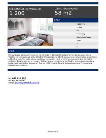 MIESZKANIE na WYNAJEM 1 200 Lublin, Konstantynów 58 m2 2266 1 200 PLN 21 PLN 58 Secondary HouseMultiPlaces 1980 2 2 Opis Do wynajęcia stylowe mieszkanie na parterze w domu jednorodzinnym na os. Konstantynów. Wejście na kondygnację jest oddzielne, Mieszkanie ma 58m2, dwa pokoje, w tym jeden przechodni, oddzielną kuchnię, łazienkę, na podłodze ma parkiet i jest w pełni umeblowane. Jest schludne i zadbane. Do mieszkania przynależy balkon wraz z zejściem na ogródek, z którego wynajmujący będą mogli swobodnie korzystać. Czynsz 1200+media. Kaucja jednomiesięczna. Preferowany dłuższy okres najmu. tel. 608 616 292 tel. 81 7436340 email: [email protected] RSPON LUBLIN Powered by TCPDF (www.tcpdf.org)