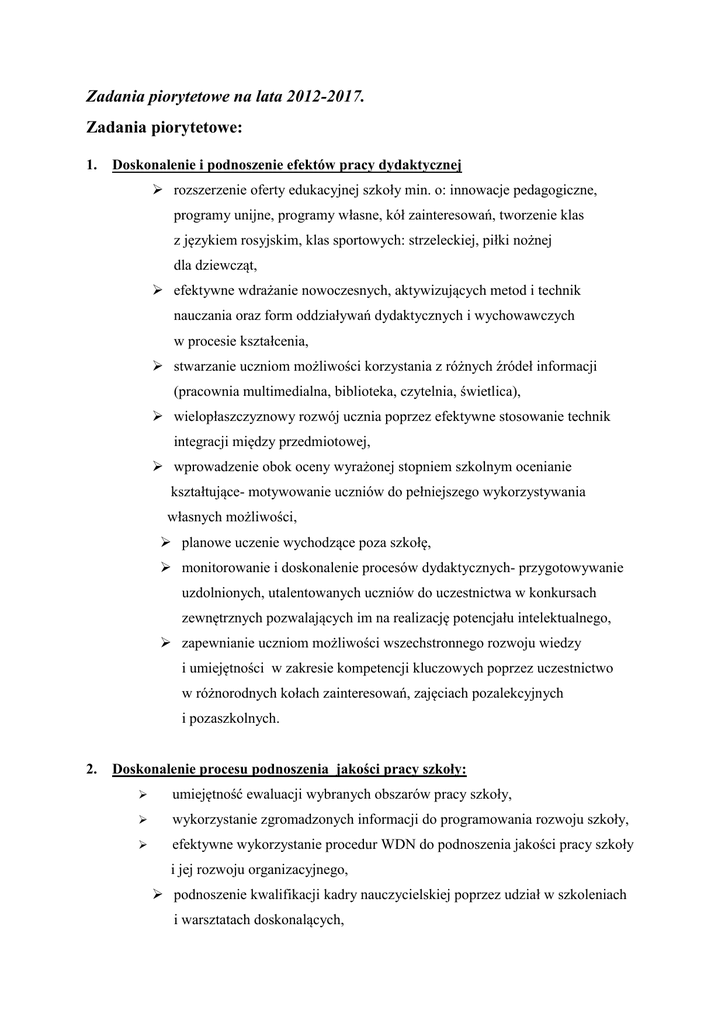 Zadania piorytetowe na lata 2012-2017. Zadania piorytetowe: 1. Doskonalenie i podnoszenie efektów pracy dydaktycznej rozszerzenie oferty edukacyjnej szkoły min. o: innowacje pedagogiczne, programy unijne, programy własne, kół zainteresowań, tworzenie klas z językiem rosyjskim, klas sportowych: strzeleckiej, piłki nożnej dla dziewcząt, efektywne wdrażanie nowoczesnych, aktywizujących metod i technik nauczania oraz form oddziaływań dydaktycznych i wychowawczych w procesie kształcenia, stwarzanie uczniom możliwości korzystania z różnych źródeł informacji (pracownia multimedialna, biblioteka, czytelnia, świetlica), wielopłaszczyznowy rozwój ucznia poprzez efektywne stosowanie technik integracji między przedmiotowej, wprowadzenie obok oceny wyrażonej stopniem szkolnym ocenianie kształtujące- motywowanie uczniów do pełniejszego wykorzystywania własnych możliwości, planowe uczenie wychodzące poza szkołę, monitorowanie i doskonalenie procesów dydaktycznych- przygotowywanie uzdolnionych, utalentowanych uczniów do uczestnictwa w konkursach zewnętrznych pozwalających im na realizację potencjału intelektualnego, zapewnianie uczniom możliwości wszechstronnego rozwoju wiedzy i umiejętności w zakresie kompetencji kluczowych poprzez uczestnictwo w różnorodnych kołach zainteresowań, zajęciach pozalekcyjnych i pozaszkolnych. 2. Doskonalenie procesu podnoszenia jakości pracy szkoły: umiejętność ewaluacji wybranych obszarów pracy szkoły, wykorzystanie zgromadzonych informacji do programowania rozwoju szkoły, efektywne wykorzystanie procedur WDN do podnoszenia jakości pracy szkoły i jej rozwoju organizacyjnego, podnoszenie kwalifikacji kadry nauczycielskiej poprzez udział w szkoleniach i warsztatach doskonalących, pozyskiwanie i wykorzystywanie funduszy unijnych przeznaczonych na rozwój intelektualny uczniów oraz realizację projektów dydaktycznych, pozyskiwanie oraz wykorzystywanie funduszy unijnych w celu unowocześnienia i poprawy stanu bazy dydaktycznej, udział w programie Sokrates-Comenius. 3. Program wychowawczy szkoły wspomaga rodzinę w wychowaniu ucznia na gruncie uniwersalnego systemu wartości - wdrażanie i doskonalenie przedsięwzięć na rzecz tworzenia w szkole efektywnego środowiska wychowawczego i edukacyjnego. kształtowanie postawy szacunku dla innych i samego siebie, wzbogacanie tradycji i obrzędowości szkoły- identyfikowanie się uczniów, rodziców i nauczycieli ze szkołą, rozwijanie umiejętności komunikowania się i współpracy, budowanie pozytywnego klimatu w szkole, pomoc i wsparcie w rozwiązywaniu problemów uczniów, stwarzanie warunków do wszechstronnego rozwoju osobowego. nawiązanie do tradycji Patrona szkoły- wychowanie uczniów w duchu ideałów patriotycznych i obywatelskich, współpraca z rodzicami i instytucjami wspierającymi szkołę w jej wychowawczych oddziaływaniach. 4. Wzbogacanie programów działań wychowawczych o takie oddziaływania aby szkoła była przyjazna i bezpieczna dla ucznia w tym również: propagowanie i promowanie działań szkoły w zakresie: zdrowego higienicznego, bezpiecznego stylu życia, dbałości o estetykę własną i otoczenia oraz w zakresie zachowań proekologicznych, zapewnienie uczniom poczucia bezpieczeństwa, integrowanie działań wychowawczych szkoły również wokół sportu - zwiększenie wpływu sportu szkolnego (w każdej postaci) na efekty wychowawcze, podejmowanie planowanych działań na rzecz edukacji europejskiej oraz edukacji samorządowej, prowadzenie w szkole nowoczesnych projektów wychowawczych, organizowanie uczniom wszechstronnej pomocy i opieki, organizowanie uczniom, rodzicom, środowisku imprez sportowych, rodzinnych turniejów, festynów sportowych, opracowanie szkolnego systemu identyfikacji i wspierania uzdolnień, realizowanie programów zapobiegających powstawaniu agresji i przemocy, propagowanie zachowań proekologicznych, otaczanie szczególną opieką dzieci potrzebujących pomocy dydaktycznej, wychowawczej i materialnej, przestrzeganie zasad demokratycznego funkcjonowania społeczności szkolnej, jasne definiowanie praw i obowiązków ucznia, wspieranie działań samorządu uczniowskiego, współpraca z rodzicami i instytucjami wspierającymi szkołę w jej wychowawczych oddziaływaniach. 5. Popularyzowanie działań szkoły w zakresie: promocji, organizowanie współpracy z rodzicami, organizowanie współpracy ze środowiskiem lokalnym, instytucjami, pozyskiwanie sojuszników, współdziałanie z mediami, prasą, udział w programach edukacyjnych np."Szkoła z klasą", "Super szkoła", "Inter klasa", inne, dbałość o prawidłową komunikację, pozyskiwanie środków finansowych z zewnątrz. powołanie do życia Uniwersytetu dla Rodziców, w ramach którego udzielana byłaby rodzicom profesjonalna pomoc w skomplikowanych problemach pedagogicznych, ale często także psychologicznych, zdrowotnych, osiągnięć uczniowskich poprzez przyznawanie materialnych czy prawnych, promowanie wysokich wyróżnień w postaci: stypendium Dyrektora, nagrody „W. Kazaneckiego”, listu gratulacyjnego, listu pochwalnego dla rodziców, wpisu do Złotej Księgi. organizowanie dni otwartych szkoły, kiermaszów, festynów sportowych, zawodów sportowych. konkursów, powołanie Szkolnego Ośrodka Kariery pełniącego funkcję informacyjną i doradczą opartą na ofercie szkół i analizie rynku pracy, związaną z wyborem dalszych możliwości kształcenia i drogi zawodowej, utworzenie Szkolnego Ośrodka Aktywności Artystycznej, który propagowałby wszelkiego rodzaju działalność artystyczną uczniów. 6. Doskonalenie warsztatu pracy nauczyciela poprzez spójny rozwój ich kompetencji zawodowych. rozwój zawodowy nauczyciela wpływa na rozwój szkoły, rozwój szkoły wspiera a czasami wymusza rozwój zawodowy nauczyciela, sukcesy własne nauczycieli przyczyniają się do sukcesu szkoły, doradzanie, motywowanie i pomoc w rozwoju istniej