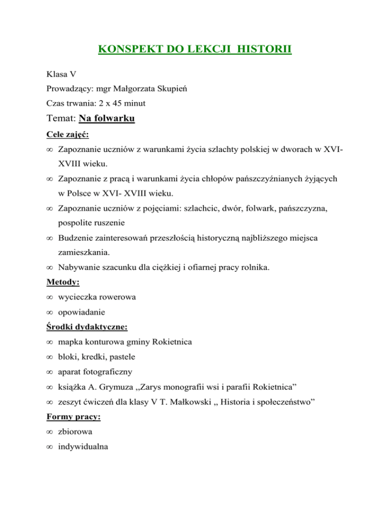 KONSPEKT DO LEKCJI HISTORII Klasa V Prowadzący: mgr Małgorzata Skupień Czas trwania: 2 x 45 minut Temat: Na folwarku Cele zajęć: • Zapoznanie uczniów z warunkami Ŝycia szlachty polskiej w dworach w XVIXVIII wieku. • Zapoznanie z pracą i warunkami Ŝycia chłopów pańszczyźnianych Ŝyjących w Polsce w XVI- XVIII wieku. • Zapoznanie uczniów z pojęciami: szlachcic, dwór, folwark, pańszczyzna, pospolite ruszenie • Budzenie zainteresowań przeszłością historyczną najbliŜszego miejsca zamieszkania. • Nabywanie szacunku dla cięŜkiej i ofiarnej pracy rolnika. Metody: • wycieczka rowerowa • opowiadanie Środki dydaktyczne: • mapka konturowa gminy Rokietnica • bloki, kredki, pastele • aparat fotograficzny • ksiąŜka A. Grymuza ,,Zarys monografii wsi i parafii Rokietnica” • zeszyt ćwiczeń dla klasy V T. Małkowski ,, Historia i społeczeństwo” Formy pracy: • zbiorowa • indywidualna Przygotowanie wycieczki: 1. Zapoznanie z trasą i celami wycieczki. 2. Przypomnienie zasad ruchu drogowego. 3. UwraŜliwienie na sposób zachowania się i poruszania w budynku i po terenie naleŜącym do osoby prywatnej. Zadania do wykonania w czasie wycieczki: 1. Zaznaczenie na mapce konturowej gminy Rokietnica, miejsca docelowego odbywanej wycieczki. 2. Zwrócenie uwagi na architekturę i połoŜenie odwiedzanego obiektu. 3. Wykonanie odręcznych rysunków kredkami i pastelami, pałacu Uznańskich. 4. Zapisanie wypowiedzi udzielonej przez osobę opiekującą się pałacem i znającą jego dzieje i burzliwą historię. 5. Wykonanie zdjęć dworu, jego wnętrza i zachowanych budynków gospodarczych, oraz otaczającego ich parku. Przebieg wycieczki: 1. Wyjazd sprzed budynku szkoły. 2. Dotarcie na miejsce i spotkanie z opiekunem pałacu. 3. Zwiedzanie wnętrza pałacu i wysłuchanie opowiadania ,, kustosza” 4. Wejście do wnętrza budynków gospodarczych. 5. Spacer po parku i wejście na kopiec widokowy, na którym rośnie potęŜna lipa. 6. Powrót do szkoły. Podsumowanie wycieczki: 1. Swobodne wypowiedzi uczniów na temat odbytej wycieczki – dzielenie się swoimi wraŜeniami i spostrzeŜeniami. Wypełnienie ankiety po odbytej wycieczce. 2. Usystematyzowanie zdobytych wiadomości. • Kim była polska szlachta? Szlachta to dawne rycerstwo, które zajęło się doglądaniem i pomnaŜaniem własnego majątku. Była to najliczniejsza i najbardziej wpływowa grupa ludzi w Polsce. Tylko szlachta uczestniczyła w sejmikach, wybierała posłów na sejm i króla. Na Ŝądanie władcy stawała do walki jako pospolite ruszenie. Jej zadaniem było teŜ pielęgnowanie polskiej tradycji i obyczajów. • Gdzie mieszkał szlachcic? Szlachcic mieszkał w dworku , czyli w duŜym drewnianym, a w późniejszym czasie równieŜ murowanym budynku, z charakterystycznym gankiem, opartym na kolumnach i z łamanym dachem. Dwór otaczały: ozdobny ogród od frontu, a na tyłach warzywnik i sad. • Jak wyglądało wnętrze dworu? W dworze znajdowało się wiele pomieszczeń: jadalnia, pokój kredensowy, w którym przechowywano nakrycia stołowe, pokoje gościnne, kilka sypialni, kuchnia z olbrzymim piecem chlebowym i wielkimi stołami, spiŜarnia- pomieszczenie do gromadzenia wszelkich przetworów i zapasów. Umeblowanie i wyposaŜenie dworu zaleŜało od zamoŜności szlachty. Bogata szlachta sprowadzała rzeźbione meble z Gdańska. Ściany ozdabiała tkaninami pochodzącymi z Turcji, portretami przodków, rodowymi herbami, trofeami myśliwskimi, bogato zdobioną bronią. Tak właśnie był urządzony dwór w Rokietnicy; jedna z sal nosiła nazwę ,, pokój myśliwski”. W takich warunkach szlachcicowi i jego rodzinie Ŝyło się bardzo wygodnie i dostatnio. • Czym był folwark? Folwark było to gospodarstwo wiejskie szlachcica, które składało się z dworu, budynków dla słuŜby, spichlerzy i pomieszczeń dla zwierząt, oraz duŜej ilości pól. Początkowo folwarki były niewielkie, bo wytwarzano tu produkty potrzebne szlachcicowi i jego rodzinie. Kiedy w XVI wieku ceny zbóŜ zaczęły rosnąć, właściciele folwarków zaczęli myśleć o zwiększeniu produkcji, aby coraz więcej zboŜa przeznaczyć na sprzedaŜ. W tamtych czasach jedynym sposobem zwiększenia plonów zbóŜ było zwiększenie obszaru zasiewów. • W jaki sposób pańszczyzna stała się obowiązkiem chłopa? Wraz ze zwiększeniem się powierzchni gospodarstwa, wzrosło zapotrzebowanie na siłę roboczą. Wtedy to właśnie szlachcie udało się tak zmienić prawo, Ŝe pańszczyzna, czyli darmowa praca chłopów, stała się ich obowiązkiem. Najpierw był to jeden dzień w tygodniu, a z czasem doszło do kilku dni, kiedy to chłop za darmo musiał pracować na pańskim folwarku. • Jakie były obowiązki chłopa w XVII wieku? Do obowiązków chłopa naleŜało pilnowanie dworu szlachcica, naprawianie drogi, odwoŜenie zboŜa do portu rzecznego, odrabianie pańszczyzny, płacenie księdzu dziesięciny. • Jak przedstawiała się sytuacja materialna polskich chłopów w XVI-XVII wieku? Polskie wsie były niewielkie, słabo zaludnione i ubogie. To ubóstwo wynikało z faktu, Ŝe chłop miał zbyt duŜo róŜnych obowiązków i obciąŜeń wobec szlachcica i niewiele czasu pozostawało mu na zajęcie się własnym gospodarstwem. Często nie udawało mu się zebrać plonów z pola, albo były one zbyt małe, aby wyŜywić swoją liczną rodzinę. • Jakie było poŜywienie chłopów? PoŜywienie było bardzo proste i dość monotonne. Chłopi spoŜywali duŜe ilości róŜnych kasz, ciemny chleb razowy, groch, kapustę, ryby solone, a potrawy słodzili miodem. 3. Utrwalenie i kontrola zdobytych podczas zajęć wiadomości. • Samodzielne uzupełnianie tematu ,, Na folwarku” w zeszycie ćwiczeń. 4. Wykonanie gazetki ściennej, przedstawiającej rysunki dzieci, wykonane w czasie wycieczki. Zadanie pracy domowej: • Samodzielne zredagowanie notatki z przebiegu wycieczki i zapisanie jej w zeszycie. ANKIE