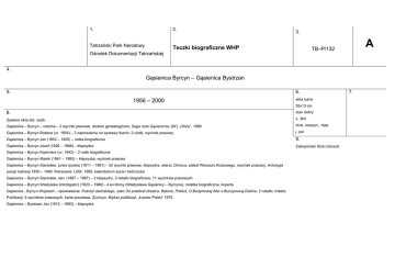 1. 2. Tatrzański Park Narodowy Teczki biograficzne WHP 3. A TB–P/132 Ośrodek Dokumentacji Tatrzańskiej 4. Gąsienica Byrcyn – Gąsienica Bystrzan 5. 6. 1956 – 2000 akta luźne 55x13 cm 8. stan dobry Zawiera akta dot. osób: s. 364 Gąsienica – Byrcyn – rodzina – 2 wycinki prasowe, drzewo genealogiczne, Saga rodu Gąsieniców. [W:] „Olivia”, 1999 druk, maszyn., rkps Gąsienica – Byrcyn Bożena (ur. 1954) – 3 zaproszenia na wystawy tkanin, 2 ulotki, wycinek prasowy j. pol. Gąsienica – Byrcyn Jan (1850 – 1925) – notka biograficzna 9. Gąsienica – Byrcyn Józef (1926 – 1988) – klepsydra Zakopiański Klub Literacki Gąsienica – Byrcyn Kazimierz (ur. 1942) – 2 notki biograficzne Gąsienica – Byrcyn Marek (1941 – 1985) – klepsydra, wycinek prasowy Gąsienica – Byrcyn Stanisław, junior (poeta) (1911 – 1991) – 52 wycinki prasowe, klepsydra, wiersz Chmura, plakat Wieczoru Klubowego, wycinek prasowy, Antologia poezji ludowej 1830 – 1980. Warszawa: LSW, 1985, kalendarium życia i twórczości Gąsienica – Byrcyn Stanisław, sen. (1887 – 1967) – 2 klepsydry, 2 notatki biograficzne, 11 wycinków prasowych Gąsienica – Byrcyn Władysław (introligator) (1923 – 1980) - 4 ex librisy (Władysława Gąsienicy – Byrcyna), notatka biograficzna, koperta Gąsienica - Byrcyn Wojciech – opowiadania: Pościel Jasińskiego, Jako On przebrał strzelca, Babroś, Polduś, O Budymowej Abo o Buczynowej Dolinie, 2 notatki, Indeks Publikacji, 5 wycinków prasowych, karta pocztowa, Życiorys, Wykaz publikacji, „Łowiec Polski” 1975. Gąsienica – Bystrzan Jan (1912 – 1983) – klepsydra 7.