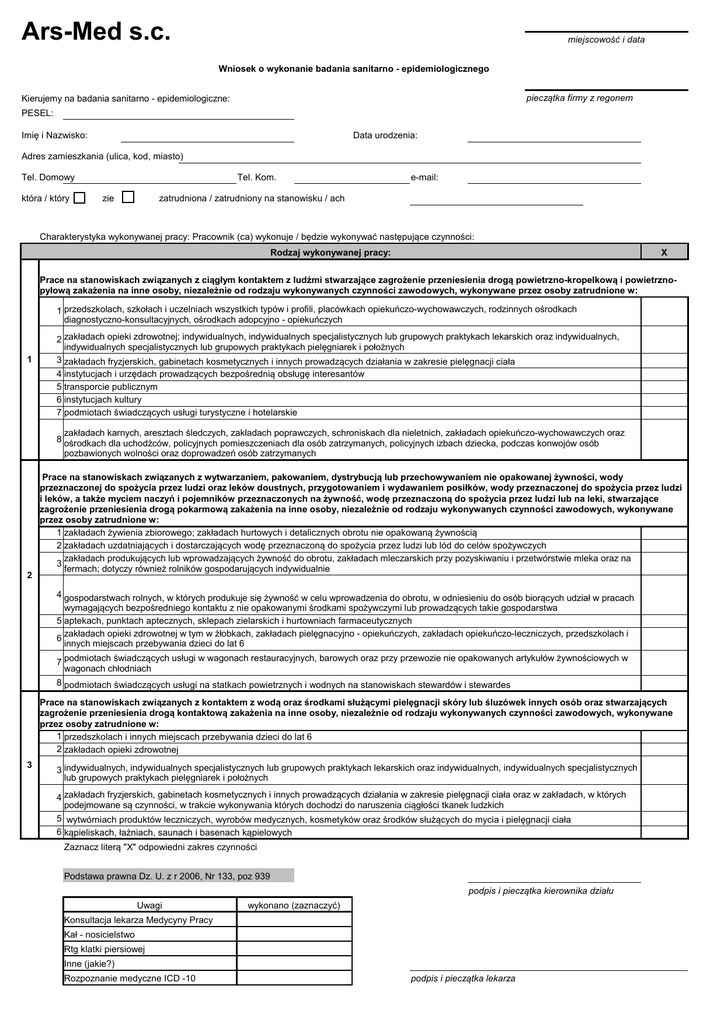 Ars-Med s.c. miejscowość i data Wniosek o wykonanie badania sanitarno - epidemiologicznego pieczątka firmy z regonem Kierujemy na badania sanitarno - epidemiologiczne: PESEL: Imię i Nazwisko: Data urodzenia: Adres zamieszkania (ulica, kod, miasto) Tel. Domowy która / który Tel. Kom. będzie jest e-mail: zatrudniona / zatrudniony na stanowisku / ach Charakterystyka wykonywanej pracy: Pracownik (ca) wykonuje / będzie wykonywać następujące czynności: Rodzaj wykonywanej pracy: X Prace na stanowiskach związanych z ciągłym kontaktem z ludźmi stwarzające zagrożenie przeniesienia drogą powietrzno-kropelkową i powietrznopyłową zakażenia na inne osoby, niezależnie od rodzaju wykonywanych czynności zawodowych, wykonywane przez osoby zatrudnione w: 1 przedszkolach, szkołach i uczelniach wszystkich typów i profili, placówkach opiekuńczo-wychowawczych, rodzinnych ośrodkach diagnostyczno-konsultacyjnych, ośrodkach adopcyjno - opiekuńczych 1 2 zakładach opieki zdrowotnej; indywidualnych, indywidualnych specjalistycznych lub grupowych praktykach lekarskich oraz indywidualnych, indywidualnych specjalistycznych lub grupowych praktykach pielęgniarek i położnych 3 zakładach fryzjerskich, gabinetach kosmetycznych i innych prowadzących działania w zakresie pielęgnacji ciała 4 instytucjach i urzędach prowadzących bezpośrednią obsługę interesantów 5 transporcie publicznym 6 instytucjach kultury 7 podmiotach świadczących usługi turystyczne i hotelarskie zakładach karnych, aresztach śledczych, zakładach poprawczych, schroniskach dla nieletnich, zakładach opiekuńczo-wychowawczych oraz 8 ośrodkach dla uchodźców, policyjnych pomieszczeniach dla osób zatrzymanych, policyjnych izbach dziecka, podczas konwojów osób pozbawionych wolności oraz doprowadzeń osób zatrzymanych 2 Prace na stanowiskach związanych z wytwarzaniem, pakowaniem, dystrybucją lub przechowywaniem nie opakowanej żywności, wody przeznaczonej do spożycia przez ludzi oraz leków doustnych, przygotowaniem i wydawaniem posiłków, wody przeznaczonej do spożycia przez ludzi i leków, a także myciem naczyń i pojemników przeznaczonych na żywność, wodę przeznaczoną do spożycia przez ludzi lub na leki, stwarzające zagrożenie przeniesienia drogą pokarmową zakażenia na inne osoby, niezależnie od rodzaju wykonywanych czynności zawodowych, wykonywane przez osoby zatrudnione w: 1 zakładach żywienia zbiorowego; zakładach hurtowych i detalicznych obrotu nie opakowaną żywnością 2 zakładach uzdatniających i dostarczających wodę przeznaczoną do spożycia przez ludzi lub lód do celów spożywczych zakładach produkujących lub wprowadzających żywność do obrotu, zakładach mleczarskich przy pozyskiwaniu i przetwórstwie mleka oraz na 3 fermach; dotyczy również rolników gospodarujących indywidualnie 4 gospodarstwach rolnych, w których produkuje się żywność w celu wprowadzenia do obrotu, w odniesieniu do osób biorących udział w pracach wymagających bezpośredniego kontaktu z nie opakowanymi środkami spożywczymi lub prowadzących takie gospodarstwa 5 aptekach, punktach aptecznych, sklepach zielarskich i hurtowniach farmaceutycznych zakładach opieki zdrowotnej w tym w żłobkach, zakładach pielęgnacyjno - opiekuńczych, zakładach opiekuńczo-leczniczych, przedszkolach i 6 innych miejscach przebywania dzieci do lat 6 7 podmiotach świadczących usługi w wagonach restauracyjnych, barowych oraz przy przewozie nie opakowanych artykułów żywnościowych w wagonach chłodniach 8 podmiotach świadczących usługi na statkach powietrznych i wodnych na stanowiskach stewardów i stewardes Prace na stanowiskach związanych z kontaktem z wodą oraz środkami służącymi pielęgnacji skóry lub śluzówek innych osób oraz stwarzających zagrożenie przeniesienia drogą kontaktową zakażenia na inne osoby, niezależnie od rodzaju wykonywanych czynności zawodowych, wykonywane przez osoby zatrudnione w: 1 przedszkolach i innych miejscach przebywania dzieci do lat 6 2 zakładach opieki zdrowotnej 3 3 indywidualnych, indywidualnych specjalistycznych lub grupowych praktykach lekarskich oraz indywidualnych, indywidualnych specjalistycznych lub grupowych praktykach pielęgniarek i położnych 4 zakładach fryzjerskich, gabinetach kosmetycznych i innych prowadzących działania w zakresie pielęgnacji ciała oraz w zakładach, w których podejmowane są czynności, w trakcie wykonywania których dochodzi do naruszenia ciągłości tkanek ludzkich 5 wytwórniach produktów leczniczych, wyrobów medycznych, kosmetyków oraz środków służących do mycia i pielęgnacji ciała 6 kąpieliskach, łaźniach, saunach i basenach kąpielowych Zaznacz literą "X" odpowiedni zakres czynności Podstawa prawna Dz. U. z r 2006, Nr 133, poz 939 podpis i pieczątka kierownika działu Uwagi wykonano (zaznaczyć) Konsultacja lekarza Medycyny Pracy Kał - nosicielstwo Rtg klatki piersiowej Inne (jakie?) Rozpoznanie medyczne ICD -10 podpis i pieczątka lekarza