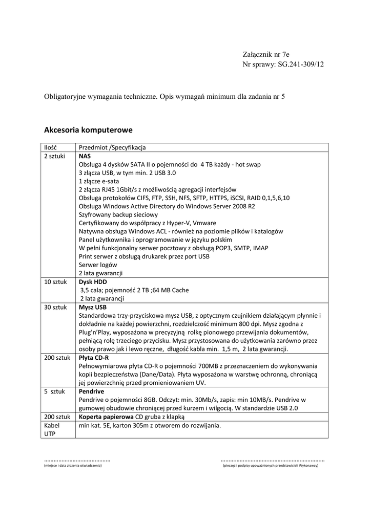 Załącznik nr 7e Nr sprawy: SG.241-309/12 Obligatoryjne wymagania techniczne. Opis wymagań minimum dla zadania nr 5 Akcesoria komputerowe Ilość 2 sztuki 10 sztuk 30 sztuk 200 sztuk 5 sztuk 200 sztuk Kabel UTP Przedmiot /Specyfikacja NAS Obsługa 4 dysków SATA II o pojemności do 4 TB każdy - hot swap 3 złącza USB, w tym min. 2 USB 3.0 1 złącze e-sata 2 złącza RJ45 1Gbit/s z możliwością agregacji interfejsów Obsługa protokołów CIFS, FTP, SSH, NFS, SFTP, HTTPS, iSCSI, RAID 0,1,5,6,10 Obsługa Windows Active Directory do Windows Server 2008 R2 Szyfrowany backup sieciowy Certyfikowany do współpracy z Hyper-V, Vmware Natywna obsługa Windows ACL - również na poziomie plików i katalogów Panel użytkownika i oprogramowanie w języku polskim W pełni funkcjonalny serwer pocztowy z obsługą POP3, SMTP, IMAP Print serwer z obsługą drukarek przez port USB Serwer logów 2 lata gwarancji Dysk HDD 3,5 cala; pojemność 2 TB ;64 MB Cache 2 lata gwarancji Mysz USB Standardowa trzy-przyciskowa mysz USB, z optycznym czujnikiem działającym płynnie i dokładnie na każdej powierzchni, rozdzielczość minimum 800 dpi. Mysz zgodna z Plug’n’Play, wyposażona w precyzyjną rolkę pionowego przewijania dokumentów, pełniącą rolę trzeciego przycisku. Mysz przystosowana do użytkowania zarówno przez osoby prawo jak i lewo ręczne, długość kabla min. 1,5 m, 2 lata gwarancji. Płyta CD-R Pełnowymiarowa płyta CD-R o pojemności 700MB z przeznaczeniem do wykonywania kopii bezpieczeństwa (Dane/Data). Płyta wyposażona w warstwę ochronną, chroniącą jej powierzchnię przed promieniowaniem UV. Pendrive Pendrive o pojemności 8GB. Odczyt: min. 30Mb/s, zapis: min 10MB/s. Pendrive w gumowej obudowie chroniącej przed kurzem i wilgocią. W standardzie USB 2.0 Koperta papierowa CD gruba z klapką min kat. 5E, karton 305m z otworem do rozwijania. …………………………………… (miejsce i data złożenia oświadczenia) ………………………………………………………… (pieczęć i podpisy upoważnionych przedstawicieli Wykonawcy)