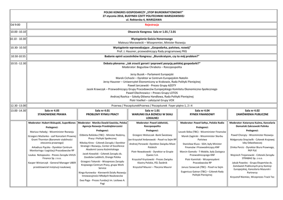 POLSKI KONGRES GOSPODARCZY „STOP BIUROKRATYZMOWI!” 27 stycznia 2016, BUDYNEK CZIiTT POLITECHNIKI WARSZAWSKIEJ ul. Rektorska 4, WARSZAWA Od 9:00 Rejestracja 10.00 -10.10 Otwarcie Kongresu Sala nr 1.01 / 2.01 10.10 - 10.30 Wystąpienie Gościa Honorowego Mateusz Morawiecki – Wicepremier, Minister Rozwoju 10.30- 10.50 Wystąpienie wprowadzające: „Gospodarka, państwo, rozwój” Prof. J. Hausner, przewodniczący Rady programowej PKG 10.50-10.55 Badanie opinii uczestników Kongresu: „Biurokratyzm, czy to mój problem?” 10:55 -12.30 Debata plenarna: „Jak zrzucić gorset i poprawić pozycję polskiej gospodarki?” Moderator: Bogusław Chrabota – Rzeczpospolita Jerzy Buzek – Parlament Europejski Marek Cichocki – Dyrektor w Centrum Europejskim Natolin Jerzy Hausner – Uniwersytet Ekonomiczny w Krakowie, Rada Polityki Pieniężnej Paweł Jarczewski - Prezes Grupy AZOTY Jacek Krawczyk – Przewodniczący Grupy Pracodawców Europejskiego Komitetu Ekonomiczno-Społecznego Paweł Olechnowicz – Prezes Grupy LOTOS Andrzej Rzońca – Szkołą Główna Handlowa, Rada Polityki Pieniężnej Piotr Voelkel – założyciel Grupy VOX 12.30 -13.00 13.00 -14.30 Przerwa / PoczęstunekPrzerwa / Poczęstunek Foyer piętro 1, 2 i 4 Sala nr 4.05 STANOWIENIE PRAWA Sala nr 4.01 PROBLEMY RYNKU PRACY Moderator: Hubert Biskupski, SuperBiznes Moderator: Monika Dawid-Sawicka, Polska Agencja Rozwoju Przedsiębiorczości Prelegenci: Sala nr 1.01 WARUNKI DLA BIZNESU W SKALI LOKALNEJ Sala nr 4.04 RYNEK FINANSOWY Sala nr 4.02 ZAMÓWIENIA PUBLICZNE Moderator: Paweł Jabłoński, Rzeczpospolita Moderator: Paweł Sołtys, Polskie Radio Prelegenci: Moderator: Katarzyna Kuźma, Kancelaria Domański Zakrzewski Palinka Prelegenci: Mariusz Haładyj - Wiceminister Rozwoju Prelegenci: Prelegenci: Leszek Skiba (TBC) - Wiceminister Finansów Grzegorz Maślanko - szef Kancelarii Prawnej Grant Thornton (Barometr stabilności otoczenia prawnego) Elżbieta Rafalska (TBC) - Minister Rodziny, Pracy i Polityki Społecznej Grzegorz Wolszczak -Bank Światowy Jan Krzysztof Ardanowski - Poseł na Sejm RP Marek Zagórski - Wiceminister Skarbu Państwa Andrzej Porawski -Dyrektor Związku Miast Polskich Stanisław Kluza - SGH, były Minister Finansów i Przewodniczący KNF Piotr Nowakowski - Dyrektor w Grupie Żywiec S.A. Marcin Gomoła - T-Mobile, były Zastępca Przewodniczącego KNF Krzysztof Krystowski - Prezes Związku Klastry Polskie, PZL Świdnik Piotr Kamiński - Wiceprezydent Pracodawców RP Arkadiusz Pączka - Dyrektor Centrum Monitoringu i Legislacji Pracodawców RP Nikolay Kirov - Członek Zarządu i Dyrektor Strategii i Rozwoju, Center of Excellence Akademii Leona Koźmińskiego Loukas Notopoulos - Prezes Zarządu VIVUS Finance Sp. z o.o. Jacek Kowalski - Członek Zarządu ds. Zasobów Ludzkich, Orange Polska Kacper Winiarczyk - General Manager UBER Grzegorz Tokarski - Wiceprezes Zarządu Krajowego Centrum Pracy, grupa Work Service przedstawiciel instytucji naukowej Kinga Kurowska - Kierownik Działu Rozwoju Innowacyjności Młodych Naukowców Ewa Paga - Prezes Fundacji im. Lesława A. Pagi Krzysztof Maurer – Tłocznia Maurer Janusz Szewczak (TBC) - Poseł na Sejm Eugeniusz Gatnar (TBC) – Członek Rady Polityki Pieniężnej Paweł Chorąży - Wiceminister Rozwoju Małgorzata Stręciwilk - Członek Krajowej Izby Odwoławczej Zrinka Percic - Dyrektor Biura Prawnego, PKP PLK Wojciech Trojanowski - Członek Zarządu STRABAG Sp. z o.o. Jakub Pawelec - Grupa Ekspertów ds. Zamówień Publicznych przy Komisji Europejskiej, Kancelaria Mazurek i Partnerzy Krzysztof Niemiec, Wiceprezes Track Tec 14.30 -14.45 14.45 -16.15 Przerwa Sala nr 4.01 Sala nr 1.01 Sala nr 4.02 Sala nr 4.04 SYSTEM OCHRONY ZDROWIA POTENCJAŁ INNOWACJI PRAWO BUDOWLANE PRAWO PODATKOWE Moderator : Jacek Krajewski, Porozumienie Zielonogórskie Moderator: Krzysztof Kowalczyk, Rzeczpospolita Moderator: Grażyna Błaszczak, Rzeczpospolita Moderator: Przemysław Talkowski, Polsat Prelegenci: Prelegenci: Prelegenci: Piotr Dardziński - Wiceminister Nauki i Szkolnictwa Wyższego Tomasz Żuchowski - Wiceminister Infrastruktury i Budownictwa Robert Oliwa - Pracodawcy RP, Przewodniczący Komitetu Podatkowego Michał Szaniawski - Wiceprezes Zarządu Agencji Rozwoju Przemysłu Konrad Płochocki - Dyrektor w Polskim Związku Firm Deweloperskich Mariusz Korzeb - Pracodawcy RP Łukasz Kręski - Invento Sp. z o.o. Zbigniew Kledyński - Wiceprezes Krajowej Rady Polskiej Izby Inżynierów Budownictwa Prelegenci: Jarosław Pinkas - Wiceminister Zdrowia Andrzej Mądrala - Wiceprezydent Pracodawców RP, Wiceprezes Zarządu Ogólnopolskiego Stowarzyszenia Szpitali Prywatnych Anna Rulkiewicz - Prezes Zarządu Związku Pracodawców Medycyny Prywatnej, Prezes Zarządu LUX MED Sp. z o.o. Jarosław Fedorowski - Prezes Polskiej Federacji Szpitali, Członek Prezydium Europejskiej Federacji Szpitali HOPE Tomasz Zieliński - przedstawiciel Federacji Związków Pracodawców Ochrony Zdrowia Porozumienie Zielonogórskie Paweł Sztwiertnia – Dyrektor Zarządzający Związku Pracodawców Innowacyjnych Firm Farmaceutycznych INFARMA Arkadiusz Lewicki - Krajowy Punkt Kontaktowy ds. Instrumentów Finansowych Programów UE Wiesław Bielawski - Wiceprezydent Gdańska Mariusz Andrzejczak - VP Creotech Instruments S.A. Andrzej Zwara - Prezes Naczelnej Rady Adwokackiej Grzegorz Wolszczak - Bank Światowy Mariusz Ścisło - Prezes Stowarzyszenia Architektów Polskich SARP Marcin Postawka - Zastępca Dyrektora Centrum Zarządzania Innowacjami i Transferu Technologii, Politechnika Warszawska Grzegorz Kubalski - Związek Powiatów Polskich Bohdan Szułczyński - Wiceprezes Zarządu Profbud Marcin Łata, Dyrektor Departamentu Konkurencyjności i Innowacyjności w Ministerstwie Rozwoju Leszek Cieśla, Dyrektor Działu Komunikacji i Promocji NCBiR 16.15-16.30 Podsumowanie Kongresu Sala nr 1.01 / 2.01 Prezentacja wyników badania opinii uczestników Kongresu 16.30 Poczęstunek – Foyer parter * Organi