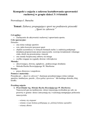 Konspekt z zajęcia z zakresu kształtowania sprawności ruchowej w grupie dzieci 3 i 4-letnich Prowadząca I. Barucha Temat: Zabawy propagujące sport na podstawie piosenki „Sport to zdrowie” Cel ogólny: Zachęcenie do aktywności ruchowej i uprawiania sportu. Cele operacyjne: Dziecko: zna różne rodzaje sportów wie, jakie korzyści przynosi sport chętnie uczestniczy w różnych formach ruchu i z radością podejmuje działania proponowane przez nauczyciela -rozwija świadomość własnego ciała, dzieli się przestrzenią z innymi zna zasady bezpiecznej zabawy na śniegu szybko reaguje na sygnały słowne i dźwiękowe Metody: aktywizująca, słowna, oglądowa , praktycznego działania Metoda Ruchu Rozwijającego W. Sherborne Formy: praca zbiorowa i zespołowa Pomoce i materiały: Piosenka pt.: „Sport to zdrowie", ilustracje przedstawiające różne rodzaje sportów, tamburyno, puzzle „Dyscypliny sportowe” dla każdego dziecka, klej, kredki. Przebieg zajęcia 1. Przywitanie wg. Metody Ruchu Rozwijającego W. Sherborne. Nauczyciel gra na tamburynie- dzieci maszerują swobodnie po sali, na przerwę w graniu- dzieci zatrzymują się i wykonują następujące polecenia nauczyciela: - witamy się stopami - witamy swoje kolana poklepując je, później kolana sąsiadów - witamy dłonie - witamy łokcie - witamy plecy - rękoma głaszczemy, poklepujemy - witamy swoje uszy, później uszy sąsiadów itp. - witamy oczami wszystkich. 2. Zabawa dydaktyczna „Dokończ zadanie- Sport to …” Wprowadzenie do tematyki zajęć. Wyjaśnienie pojęcia "sport". 3. Ilustrowanie treści wiersza ruchem ciała. Na paluszki się wspinamy (dz. stają na palcach) W górę rączki wyciągamy (dz. wyciągają ręce do góry) Do podłogi dotykamy (dz. wykonują przysiad, dotykają rękami do podłogi) I ze sobą się witamy.(dz. podają sobie dłonie na powitanie) Dzień dobry.(wypowiadają słowo „dzień dobry”) 4. Uważne słuchanie piosenki pt.: „Sport to zdrowie" I. Co dzień biegam z moim tatą Gram w tenisa z moją mamą Co dzień jeżdżę na rowerze Bo sport kocham mówię szczerze Pływam często na pływalni W koszykówkę lubię grać Sport to zdrowa rzecz jak wiecie Więc polecam go i wam. Ref. Bo sportowcy są silni i zdrowi Bo sportowcy są zawsze gotowi Do biegu, do skoku, do gry W sporcie nasza siła tkwi. II. Kiedy tylko rano wstanę Gimnastykę już uprawiam Bo być zdrowym, rześkim, silnym To jest bardzo ważna sprawa Kiedy biały puszek spadnie To na nartach jeżdżę też Sport jest zdrowy to już wiecie No a zdrowie ważna rzecz. Ref. Bo sportowcy są silni i zdrowi Bo sportowcy są zawsze gotowi Do biegu, do skoku, do gry W sporcie nasza siła tkwi. 5. Rozmowa w oparciu o wysłuchaną piosenkę i ilustracje, umieszczone wcześniej przez nauczyciela. Nauczyciel zadaje dzieciom pytania, dzieci próbują na nie odpowiedzieć. - Co robiła dziewczynka z tatą, a co z mamą? - Jakie jeszcze inne czynności wykonywała? - Na czym dziewczynka jeździła zimą? - O czym należy pamiętać jeżdżąc zimą na sankach, nartach, łyżwach? - Jacy są sportowcy? Dlaczego? - Jakie znacie dyscypliny sportowe?(w oparciu o ilustrację) - Dlaczego tak ważne jest aby bawić się na dworze? 6. Ćwiczenia inhibicyjno-incytacyjne- „Sporty". Kiedy nauczyciel gra na instrumencie muzycznym, dzieci naśladują różne rodzaje sportów: jazdę na łyżwach, bieganie, zjeżdżanie na nartach itp. Na przerwę w graniu dzieci szybko ustawiają się w sposób podany przez nauczyciela: - "siad korekcyjny" - siadają prosto na dywanie, po turecku. - "para" - ustawiają się parami przed nauczycielką. - "figurka" - stają nieruchomo w wymyślonej przez siebie pozie. - "koło" - tworzą koło na dywanie. 7. Puzzle „Dyscypliny sportowe”. Nauczyciel rozdaje każdemu dziecku obrazek pocięty na 3 lub 4 części. Dzieci składają obrazek w całość i przyklejają na kartkę. Chętne dzieci kolorują powstały obrazek. 8. Podsumowanie zajęć - Jakie poznaliście sporty? - W co można bawić się na dworze? - Dlaczego warto uprawiać sport? - Co trzeba jeszcze robić aby być silnym i zdrowym? Nauczyciel zachęca dzieci do aktywności ruchowej w przedszkolu i w domu takiej jak: jazda na rowerze, spacery, pływanie, uprawianie sportów zimowych i letnich.