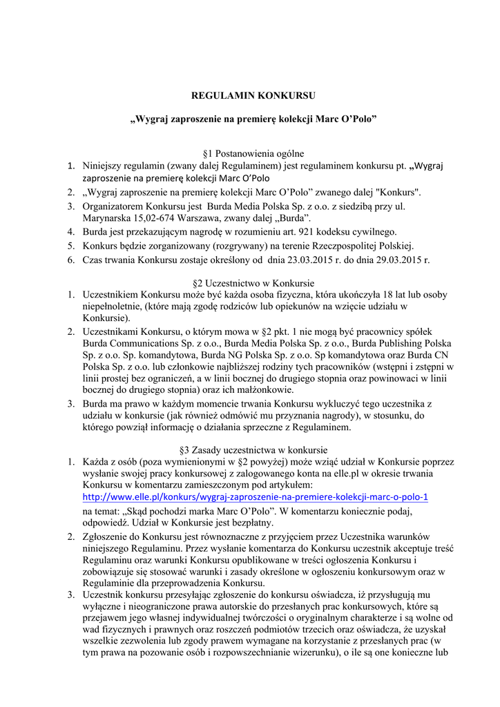 REGULAMIN KONKURSU „Wygraj zaproszenie na premierę kolekcji Marc O’Polo” 1. 2. 3. 4. 5. 6. §1 Postanowienia ogólne Niniejszy regulamin (zwany dalej Regulaminem) jest regulaminem konkursu pt. „Wygraj zaproszenie na premierę kolekcji Marc O’Polo „Wygraj zaproszenie na premierę kolekcji Marc O’Polo” zwanego dalej "Konkurs". Organizatorem Konkursu jest Burda Media Polska Sp. z o.o. z siedzibą przy ul. Marynarska 15,02-674 Warszawa, zwany dalej „Burda”. Burda jest przekazującym nagrodę w rozumieniu art. 921 kodeksu cywilnego. Konkurs będzie zorganizowany (rozgrywany) na terenie Rzeczpospolitej Polskiej. Czas trwania Konkursu zostaje określony od dnia 23.03.2015 r. do dnia 29.03.2015 r. §2 Uczestnictwo w Konkursie 1. Uczestnikiem Konkursu może być każda osoba fizyczna, która ukończyła 18 lat lub osoby niepełnoletnie, (które mają zgodę rodziców lub opiekunów na wzięcie udziału w Konkursie). 2. Uczestnikami Konkursu, o którym mowa w §2 pkt. 1 nie mogą być pracownicy spółek Burda Communications Sp. z o.o., Burda Media Polska Sp. z o.o., Burda Publishing Polska Sp. z o.o. Sp. komandytowa, Burda NG Polska Sp. z o.o. Sp komandytowa oraz Burda CN Polska Sp. z o.o. lub członkowie najbliższej rodziny tych pracowników (wstępni i zstępni w linii prostej bez ograniczeń, a w linii bocznej do drugiego stopnia oraz powinowaci w linii bocznej do drugiego stopnia) oraz ich małżonkowie. 3. Burda ma prawo w każdym momencie trwania Konkursu wykluczyć tego uczestnika z udziału w konkursie (jak również odmówić mu przyznania nagrody), w stosunku, do którego powziął informację o działania sprzeczne z Regulaminem. §3 Zasady uczestnictwa w konkursie 1. Każda z osób (poza wymienionymi w §2 powyżej) może wziąć udział w Konkursie poprzez wysłanie swojej pracy konkursowej z zalogowanego konta na elle.pl w okresie trwania Konkursu w komentarzu zamieszczonym pod artykułem: http://www.elle.pl/konkurs/wygraj-‐zaproszenie-‐na-‐premiere-‐kolekcji-‐marc-‐o-‐polo-‐1 na temat: „Skąd pochodzi marka Marc O’Polo”. W komentarzu koniecznie podaj, odpowiedź. Udział w Konkursie jest bezpłatny. 2. Zgłoszenie do Konkursu jest równoznaczne z przyjęciem przez Uczestnika warunków niniejszego Regulaminu. Przez wysłanie komentarza do Konkursu uczestnik akceptuje treść Regulaminu oraz warunki Konkursu opublikowane w treści ogłoszenia Konkursu i zobowiązuje się stosować warunki i zasady określone w ogłoszeniu konkursowym oraz w Regulaminie dla przeprowadzenia Konkursu. 3. Uczestnik konkursu przesyłając zgłoszenie do konkursu oświadcza, iż przysługują mu wyłączne i nieograniczone prawa autorskie do przesłanych prac konkursowych, które są przejawem jego własnej indywidualnej twórczości o oryginalnym charakterze i są wolne od wad fizycznych i prawnych oraz roszczeń podmiotów trzecich oraz oświadcza, że uzyskał wszelkie zezwolenia lub zgody prawem wymagane na korzystanie z przesłanych prac (w tym prawa na pozowanie osób i rozpowszechnianie wizerunku), o ile są one konieczne lub potrzebne dla ich wykorzystywania przez Organizatora. W przypadku, gdyby oświadczenia, o których mowa powyżej okazały się niezgodne ze stanem faktycznym i/lub prawnym osoba, która nadesłała zgłoszenie, w przypadku ewentualnych roszczeń osób trzecich, ponosi wyłączną i całkowitą odpowiedzialność oraz oświadcza, że ureguluje wszystkie związane z tym faktem poniesione przez Organizatora szkody. Ponadto, w sytuacji o której mowa powyżej, osoba ta podlega dyskwalifikacji z konkursu i zobowiązana jest do niezwłocznego zwrotu przyznanej przez Organizatora nagrody. Uczestnik oświadcza, że wyraża zgodę na wielokrotne (nieograniczone ilościowo, czasowo i terytorialnie) oraz nieodpłatne korzystanie w całości jak i w dowolnie wybranych fragmentach z jego pracy konkursowej (zgłoszenia) przez Organizatora oraz firmy powiązane z Organizatorem kapitałowo lub osobowo w sposób pośredni lub bezpośredni jak również przez podmioty wskazane przez Organizatora na wszystkich znanych polach eksploatacji, a w szczególności: a. Utrwalanie i zwielokrotnianie drukiem lub podobną techniką, w tym fotokopiowanie i mikrokopiowanie; b. Wydawanie (publikowanie) i rozpowszechnianie we wszystkich wydaniach, niezależnie od formy, standardu, systemu lub formatu, bez ograniczenia liczby nakładów, wydań oraz egzemplarzy; obejmuje to także prawo do częściowego lub całkowitego przedruku (przed i po produkcji), w tym na fotokopiach, mikrokopiach i mikroreprodukcjach, a także do powielania w inny sposób; c. Wprowadzanie do pamięci komputera i sporządzanie kopii takich zapisów dla potrzeb eksploatacji oraz trwała lub czasowe zwielokrotnianie komputerowego zapisu w całości lub w części dowolnymi środkami i w dowolnej formie; d. Wykorzystywanie do celów marketingowych, w tym reklamy, promocji, oznaczenia lub identyfikacji Organizatora; obejmuje to również utrwalanie i zwielokrotnianie poligraficzne oraz wykorzystanie tych utrwaleń; utrwalanie audiowizualne dowolną techniką niezależnie do standardu, systemu i formatu; nadanie za pomocą wizji lub fonii przewodowej lub bezprzewodowej przy pomocy dowolnych środków technicznych, w tym nadawanie za pośrednictwem satelity; nagrywanie na urządzeniach służących do wielokrotnego odtwarzania za pomocą nośników dźwięku i obrazu, w tym powielania, rozpowszechniania i odtwarzania nagrań, przekazywanie, odtwarzanie i emitowanie w audycjach w środkach masowego przekazu, po utrwaleniu na nośnikach dźwięku i/lub obrazu; e. Publiczne udostępnianie w taki sposób, aby każdy mógł mieć do niego dostęp w miejscu i czasie przez siebie wybranym w tym w dowolnych – elektronicznym, cyfrowym itp. kanale komunikacji publicznej; f. Wprowadzanie do obrotu, rozpowszechnianie egzemplarzy oraz ich kopii. Uczestnik Konkursu udziela Organizatorowi na podstawie niniejszego