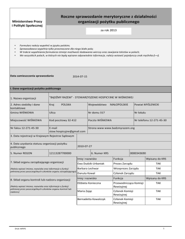 ZŽĐnjŶĞƐƉƌĂǁŽnjĚĂŶŝĞŵĞƌLJƚŽƌLJĐnjŶĞnjĚnjŝĂųĂůŶŽƑĐŝ ŽƌŐĂŶŝnjĂĐũŝƉŽǏLJƚŬƵƉƵďůŝĐnjŶĞŐŽ Ministerstwo Pracy ŝWŽůŝƚLJŬŝ^ƉŽųĞĐnjŶĞũ za rok 2013 • • • • &ŽƌŵƵůĂƌnjŶĂůĞǏLJǁLJƉĞųŶŝđǁũħnjLJŬƵƉŽůƐŬŝŵ͖ ^ƉƌĂǁŽnjĚĂǁĐĂǁLJƉĞųŶŝĂƚLJůŬŽƉƌnjĞnjŶĂĐnjŽŶĞĚůĂŶŝĞŐŽďŝĂųĞƉŽůĂ͖ tƚƌĂŬĐŝĞǁLJƉĞųŶŝĂŶŝĂĨŽƌŵƵůĂƌnjĂŝƐƚŶŝĞũĞŵŽǏůŝǁŽƑđĚŽĚĂǁĂŶŝĂǁŝĞƌƐnjLJŽƌĂnjnjĂǁŝũĂŶŝĂƚĞŬƐƚſǁǁƉŽůĂĐŚ͖ tĞǁƐnjLJƐƚŬŝĐŚƉŽůĂĐŚ͕ǁŬƚſƌLJĐŚŶŝĞďħĚČǁƉŝƐĂŶĞŽĚƉŽǁŝĞĚŶŝĞŝŶĨŽƌŵĂĐũĞ͕ŶĂůĞǏLJǁƐƚĂǁŝđƉŽũĞĚLJŶĐnjLJnjŶĂŬŵLJƑůŶŝŬĂ (--–). Data zamieszczenia sprawozdania 2014-07-15 /͘ĂŶĞŽƌŐĂŶŝnjĂĐũŝƉŽǏLJƚŬƵƉƵďůŝĐnjŶĞŐŽ 1. Nazwa organizacji ΗDzZDΗͲ^dKtZz^E/,K^W/z:Ett/_E/Kt: 2. Adres siedziby i dane kontaktowe Kraj 'ŵŝŶĂt/_E/Kt POLSKA tŽũĞǁſĚnjƚǁŽDBKWK>^</ WŽǁŝĂƚDz_>E/</ Ulica Nr domu 317 Nr lokalu DŝĞũƐĐŽǁŽƑđt/_E/Kt Kod pocztowy 32-412 WŽĐnjƚĂt/_E/Kt Nr telefonu 12-271-45-30 Nr faksu 12-271-45-30 E-mail Strona www www.badzmyrazem.org [email protected] ϯ͘ĂƚĂƌĞũĞƐƚƌĂĐũŝǁ<ƌĂũŽǁLJŵZĞũĞƐƚƌnjĞ^ČĚŽǁLJŵ ϰ͘ĂƚĂƵnjLJƐŬĂŶŝĂƐƚĂƚƵƐƵŽƌŐĂŶŝnjĂĐũŝƉŽǏLJƚŬƵ publicznego 5. Numer REGON 12113287700000 ϳ͘^ŬųĂĚŽƌŐĂŶƵnjĂƌnjČĚnjĂũČĐĞŐŽŽƌŐĂŶŝnjĂĐũŝ ;EĂůĞǏLJǁƉŝƐĂđŝŵŝŽŶĂ͕ŶĂnjǁŝƐŬĂŽƌĂnjŝŶĨŽƌŵĂĐũĞŽĨƵŶŬĐũŝ ƉĞųŶŝŽŶĞũƉƌnjĞnjƉŽƐnjĐnjĞŐſůŶLJĐŚĐnjųŽŶŬſǁŽƌŐĂŶƵnjĂƌnjČĚnjĂũČĐĞŐŽͿ ϴ͘^ŬųĂĚŽƌŐĂŶƵŬŽŶƚƌŽůŝůƵďŶĂĚnjŽƌƵŽƌŐĂŶŝnjĂĐũŝ ;EĂůĞǏLJǁƉŝƐĂđŝŵŝŽŶĂ͕ŶĂnjǁŝƐŬĂŽƌĂnjŝŶĨŽƌŵĂĐũĞŽĨƵŶŬĐũŝ ƉĞųŶŝŽŶĞũƉƌnjĞnjƉŽƐnjĐnjĞŐſůŶLJĐŚĐnjųŽŶŬſǁŽƌŐĂŶƵŬŽŶƚƌŽůŝůƵď nadzoru) Druk: MPiPS 2010-07-27 6. Numer KRS 0000343690 /ŵŝħŝŶĂnjǁŝƐŬŽ Funkcja Wpisany do KRS Ewa Dudzik-Urbaniak WƌĞnjĞƐĂƌnjČĚƵ TAK Barbara Lechwar tŝĐĞƉƌĞnjĞƐĂƌnjČĚƵ TAK Danuta Kowal njųŽŶĞŬĂƌnjČĚƵ TAK /ŵŝħŝŶĂnjǁŝƐŬŽ Funkcja ůǏďŝĞƚĂ<ŽŶŝĞĐnjŶĂ WƌnjĞǁŽĚŶŝĐnjČĐĂ<ŽŵŝƐũŝ Rewizyjnej TAK DĂƌŝĂĂũČĐ njųŽŶĞŬ<ŽŵŝƐũŝ Rewizyjnej TAK Bernadetta Kowalczyk njųŽŶĞŬ<ŽŵŝƐũŝ Rewizyjnej TAK Wpisany do KRS 1 Zgodnie z §6. Statutu 9. Cele statutowe organizacji ;EĂůĞǏLJŽƉŝƐĂđĐĞůĞŶĂƉŽĚƐƚĂǁŝĞƐƚĂƚƵƚƵŽƌŐĂŶŝnjĂĐũŝͿ 1. Celem Stowarzyszenia jest: ĂͿŶŝĞƐŝĞŶŝĞƉŽŵŽĐLJƐƉŽųĞĐnjŶĞũŽƐŽďŽŵǁƚƌƵĚŶĞũƐLJƚƵĂĐũŝǏLJĐŝŽǁĞũŝŝĐŚ rodzinom oraz wyrównywanie szans tych rodzin i osób, ďͿƉŽŵŽĐƐŽĐũĂůŶĂĚůĂĚŽƌŽƐųLJĐŚ͕ĚnjŝĞĐŝŝŵųŽĚnjŝĞǏLJnjĂŶŝĞĚďĂŶLJĐŚ ƐƉŽųĞĐnjŶŝĞ͕ ĐͿĚnjŝĂųĂůŶŽƑđĐŚĂƌLJƚĂƚLJǁŶĂ͕ ĚͿŽĐŚƌŽŶĂŝƉƌŽŵŽĐũĂnjĚƌŽǁŝĂ͕ǁƚLJŵŬƐnjƚĂųƚŽǁĂŶŝĞǁųĂƑĐŝǁLJĐŚƉŽƐƚĂǁŝ njĂĐŚŽǁĂŷƉƌŽnjĚƌŽǁŽƚŶLJĐŚŝƉƌŽĞŬŽůŽŐŝĐnjŶLJĐŚ͕ ĞͿĚnjŝĂųĂŶŝĞŶĂƌnjĞĐnjŽƐſďŶŝĞƉĞųŶŽƐƉƌĂǁŶLJĐŚ͕ ĨͿŶĂƵŬĂ͕ĞĚƵŬĂĐũĂŝŽƑǁŝĂƚĂ͕ǁƐnjĐnjĞŐſůŶŽƑĐŝǁnjĂŬƌĞƐŝĞŽĐŚƌŽŶLJnjĚƌŽǁŝĂ͕ ŐͿĚnjŝĂųĂŶŝĂŶĂƌnjĞĐnjŝŶƚĞŐƌĂĐũŝĞƵƌŽƉĞũƐŬŝĞũŽƌĂnjƌŽnjǁŝũĂŶŝĂŬŽŶƚĂŬƚſǁŝ ǁƐƉſųƉƌĂĐLJŵŝħĚnjLJƐƉŽųĞĐnjĞŷƐƚǁĂŵŝ͕ h) promocja i organizacja wolontariatu. 2͘^ƚŽǁĂƌnjLJƐnjĞŶŝĞƉƌŽǁĂĚnjŝĚnjŝĂųĂůŶŽƑđŶĂƌnjĞĐnjŽƐſďĐŝħǏŬŽĐŚŽƌLJĐŚ͕ njǁųĂƐnjĐnjĂŶĂŶŽǁŽƚǁŽƌLJ͕ĂƚĂŬǏĞƉƌnjĞǁůĞŬůĞĐŚŽƌLJĐŚŝƐƚĂƌƐnjLJĐŚŽƌĂnjŶĂ rzecz rodzin tych osób w czasie sprawowania nad nimi opieki i po ich ƑŵŝĞƌĐŝ͘ 3͘^ƚŽǁĂƌnjLJƐnjĞŶŝĞƉƌŽƉĂŐƵũĞŝĚĞħŝŵĞƚŽĚLJŽƉŝĞŬŝŚŽƐƉŝĐLJũŶĞũ͕ƌĞĂůŝnjƵũĞƚČ ŽƉŝĞŬħŽƌĂnjƉŽnjLJƐŬƵũĞůƵĚnjŝĚŽďƌĞũǁŽůŝŐŽƚŽǁLJĐŚďĞnjŝŶƚĞƌĞƐŽǁŶŝĞ ƵĚnjŝĞůĂđƉŽŵŽĐLJŝŽƉŝĞŬŝŽƐŽďŽŵŽďũħƚLJŵũĞŐŽĚnjŝĂųĂůŶŽƑĐŝČ͘ Zgodnie z §7. Statutu 1͘^ƚŽǁĂƌnjLJƐnjĞŶŝĞƌĞĂůŝnjƵũĞƐǁŽũĞĐĞůĞǁƐnjĐnjĞŐſůŶŽƑĐŝƉŽƉƌnjĞnj͗ 10. Sposób realizacji celów statutowych organizacji a) prowadzenie Domowej Opieki Hospicyjnej, b) prowadzenie domów hospicyjnych, ;EĂůĞǏLJŽƉŝƐĂđƐƉŽƐſďƌĞĂůŝnjĂĐũŝĐĞůſǁƐƚĂƚƵƚŽǁLJĐŚŽƌŐĂŶŝnjĂĐũŝŶĂ ĐͿƉƌŽǁĂĚnjĞŶŝĞŶŝĞƉƵďůŝĐnjŶLJĐŚnjĂŬųĂĚſǁŽƉŝĞŬŝnjĚƌŽǁŽƚŶĞũ͗ • hospicjów stacjonarnych, podstawie statutu organizacji) ͻƉŽƌĂĚŶŝƵƑŵŝĞƌnjĂŶŝĂďſůƵ͕ • poradni ozonoterapii, ͻƉŽƌĂĚŶŝůĞĐnjĞŶŝĂŽďƌnjħŬƵůŝŵĨĂƚLJĐnjŶĞŐŽ͕ • poradni opieki hospicyjnej (specjalistyczne porady w zakresie onkologii, ĐŚŽƌſďǁĞǁŶħƚƌnjŶLJĐŚ͕ƉƐLJĐŚŝĂƚƌŝŝ͕ƉƐLJĐŚŽůŽŐŝŝ͕ƉŽƌĂĚLJƉŝĞůħŐŶŝĂƌƐŬŝĞ͕ ƉŝĞůħŐŶĂĐLJũŶĞŝŝŶŶĞͿ͕ ͻƉŽƌĂĚŶŝƉƌŽĨŝůĂŬƚLJŬŝŝůĞĐnjĞŶŝĂŽĚůĞǏLJŶ͕ • poradni dla osieroconych, • poradni psychologiczno-rehabilitacyjnych, ĚͿƉƌŽǁĂĚnjĞŶŝĞǁLJƉŽǏLJĐnjĂůŶŝƐƉƌnjħƚƵƉŝĞůħŐŶĂĐLJũŶŽͲƌĞŚĂďŝůŝƚĂĐLJũŶĞŐŽ͕ ĞͿƉƌŽǁĂĚnjĞŶŝĞƉŽƐųƵŐŵĞĚLJĐnjŶLJĐŚ͕ĚƵĐŚŽǁŶLJĐŚ͕ƉƐLJĐŚŽůŽŐŝĐnjŶLJĐŚ͕ socjalnych w domach chorych, ĨͿƉƌŽǁĂĚnjĞŶŝĞƉŽƐųƵŐĚƵĐŚŽǁLJĐŚ͕ƉƐLJĐŚŽůŽŐŝĐnjŶLJĐŚ͕ƐŽĐũĂůŶLJĐŚŝ medycznych dla rodzin osób chorych i osieroconych, g) prowadzenie przedszkoli,
