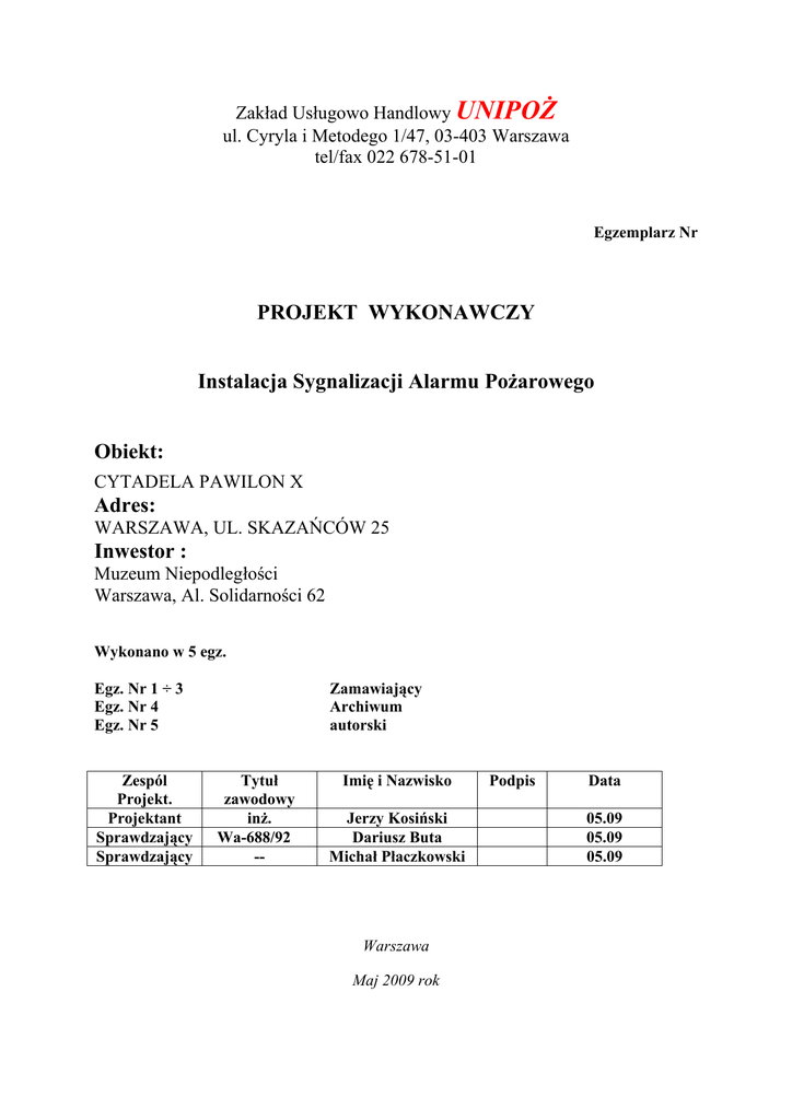 Zakład Usługowo Handlowy UNIPOŻ ul. Cyryla i Metodego 1/47, 03-403 Warszawa tel/fax 022 678-51-01 Egzemplarz Nr PROJEKT WYKONAWCZY Instalacja Sygnalizacji Alarmu Pożarowego Obiekt: CYTADELA PAWILON X Adres: WARSZAWA, UL. SKAZAŃCÓW 25 Inwestor : Muzeum Niepodległości Warszawa, Al. Solidarności 62 Wykonano w 5 egz. Egz. Nr 1 ÷ 3 Egz. Nr 4 Egz. Nr 5 Zespól Projekt. Projektant Sprawdzający Sprawdzający Zamawiający Archiwum autorski Tytuł zawodowy inż. Wa-688/92 -- Imię i Nazwisko Jerzy Kosiński Dariusz Buta Michał Płaczkowski Warszawa Maj 2009 rok Podpis Data 05.09 05.09 05.09 PROJEKT SYSTEMU POWIADOMIENIA O POŻARZE CYTADELA – PAWILON X Warszawa, ul. Skazańców 25 SPIS TREŚCI 1. Zakres opracowania str. 3 2. Część ogólna str. 3 3. Charakterystyka budowlano-pożarowa str. 4 4. Opis techniczny systemu str. 4 5. Obliczanie parametrów technicznych str. 7 6. Opis działania systemu str. 7 7. Zalecenia dla Użytkownika str. 10 8. Zalecenia dla Wykonawcy str. 11 9. Konserwacja str. 11 10. Uwagi końcowe str. 13 11. Wykaz urządzeń i materiałów str. 15 12. Wykaz elementów na liniach dozorowych str. 16 13. Dane techniczne urządzeń str. 17 14. Atesty str. 18 15. Rysunki str. 19 I.Rys. 1 – INSTALACJA SAP – skrzydło północne – rzut parteru II.Rys. 2 – INSTALACJA SAP – skrzydło wschodnie – rzut parteru III.Rys. 3 – INSTALACJA SAP – skrzydło zachodnie – rzut parteru IV.Rys. 4 – INSTALACJA SAP – skrzydło północne – rzut 1 piętra V.Rys. 5 – INSTALACJA SAP – skrzydło wschodnie – rzut 1 piętra VI.Rys. 6 – INSTALACJA SAP – skrzydło zachodnie – rzut 1 piętra VII.Rys. 7 – INSTALACJA SAP – skrzydło północne – rzut poddasza VIII.Rys. 8 – INSTALACJA SAP – skrzydło wschodnie – rzut poddasza IX.Rys. 9 – INSTALACJA SAP – skrzydło zachodnie – rzut poddasza X.Rys. 10 – INSTALACJA SAP – skrzydło zachodnie – rzut piwnic XI.Rys. 11 – INSTALACJA SAP – skrzydło wschodnie – rzut piwnic XII.Rys. 12 – INSTALACJA SAP – schemat blokowy 2 Zakład Usługowo Handlowy UNIPOŻ ul. Cyryla i Metodego 1/47, 03-403 Warszawa tel/fax 022 678-51-01 PROJEKT SYSTEMU POWIADOMIENIA O POŻARZE CYTADELA – PAWILON X Warszawa, ul. Skazańców 25 1. ZAKRES OPRACOWANIA Praca stanowi projekt techniczny, jednostadiowy, automatycznego urządzenia sygnalizacji pożarowej dla obiektu Cytadela – Pawilon X. Projekt zawiera wytyczne organizacji systemu, wskazówki instalatorskie, dobór urządzeń, parametry techniczne, oraz rysunki rozmieszczenia elementów systemu. 2. CZĘŚĆ OGÓLNA 2.1. Opracowanie niniejsze stanowi Projekt Techniczny, wykonawczy Systemu Powiadomienia o Pożarze (SPP) w obiekcie Cytadela – Pawilon X, położonym w Warszawie przy ul. Skazańców 25. 2.2. Zadaniem funkcjonowania w/w systemu, ma być wykrycie i sygnalizacja pojawienia się zjawisk fizycznych, mogących być wynikiem powstania pożaru w zabezpieczonym obiekcie. 2.3. Podstawy opracowania projektu: - zamówienie wykonania projektu, nr 20/2009 z 31.03.2009 roku. - udostępniona dokumentacja techniczno-budowlana - oględziny obiektu przeprowadzone w okresie kwiecień i maj 2009 r., - Rozporządzenie Ministra Gospodarki Przestrzennej i Budownictwa z dnia 14 grudnia 1994 r. w sprawie warunków, jakim powinny odpowiadać budynki i ich usytuowanie (Dz. U. 1995 nr 10, poz. 46), - Ustawa z dnia 24 sierpnia 1991 r. o ochronie przeciwpożarowej (Dz. U. 1991 nr 81,poz. 351), - Rozporządzenie Ministra Spraw Wewnętrznych z dnia 2 listopada 1992 r. w sprawie ochrony przeciwpożarowej budynków, innych obiektów budowlanych i terenów (Dz. U. 1992 nr 92, poz. 460, z późniejszymi zmianami), - Poradnik projektanta-inwestora budowlanego. Krupa A.: Stadia i zakres dokumentacji. BISPROL, Warszawa 1995. 3 Zakład Usługowo Handlowy UNIPOŻ ul. Cyryla i Metodego 1/47, 03-403 Warszawa tel/fax 022 678-51-01 PROJEKT SYSTEMU POWIADOMIENIA O POŻARZE CYTADELA – PAWILON X Warszawa, ul. Skazańców 25 3. CHARAKTERYSTYKA BUDOWLANO – POŻAROWA Pawilon X usytuowany jest w obrębie Cytadeli Warszawskiej przy ul. Skazańców 25. Cytadela Warszawska została zbudowana po upadku Powstania Listopadowego na rozkaz cara Mikołaja I Romanowa w latach 1832-1836. Ostatecznie wszystkie prace modernizacyjne zakończono w 1874r. Pawilon X pełni rolę głównego więzienia politycznego Królestwa Polskiego, miejsca straceń polskich patriotów. Po wojnie cytadela stała się siedzibą dowództwa Warszawskiego Okręgu Wojskowego. Obecnie nadal znajduje się pod zarządem Wojska Polskiego, a w Pawiolonie X mieści się Muzeum Niepodległości. Pawilon X został wpisany do rejestru zabytków pod nr 59/2 dnia 01.07.1965r. 3.2 Opis budynku Budynek wybudowany został na planie zbliżonym do litery "C". Składa się z części środkowej i prostopadłych do niej dwóch skrzydeł. Jest to budynek piętrowy z poddaszem nieużytkowym, częściowo podpiwniczony w częściach szczytowych obu skrzydeł. Fundamenty budynku wykonane są z cegły ceramicznej pełnej na zaprawie wapiennej. Stropy ceramiczne typu Kleina oraz odcinkowe, w piwnicach sklepienia. Budynek pokryty jest blachą ocynkowaną. Obiekt wyposażony jest w instalację wodno-kanalizacyjną, elektryczną oraz centralne ogrzewanie. 4. OPIS TECHNICZNY SYSTEMU 4.1. Zakres ochrony Zgodnie z charakterystyką, rodzajem i przeznaczeniem obiektu, przyjęto zakres ochrony: ochrona całkowita, tzn. że wszystkie pomieszczenia, ciągi komunikacyjne objęto automatycznym wykrywaniem pożaru. Odstąpiono od zabezpieczenia pomieszczeń o bardzo małym zagrożeniu pożarowym (np. sanitariaty). Funkcje wykrywania pożarów w tych 4 Zakład Usługowo Handlowy UNIPOŻ ul. Cyryla i Metodego 1/47, 03-403 Warszawa tel/fax 022 678-51-01 PROJEKT SYSTEMU POWIADOMIENIA O POŻARZE CYTADELA – PAWILON X Warszawa, ul. Skazańców 25 pomieszczeniach pozostawiono człowiekowi, z wykorzystaniem, do alarmowania, ręcznych przycisków alarmowych. 4.2. Rodzaj ochrony
