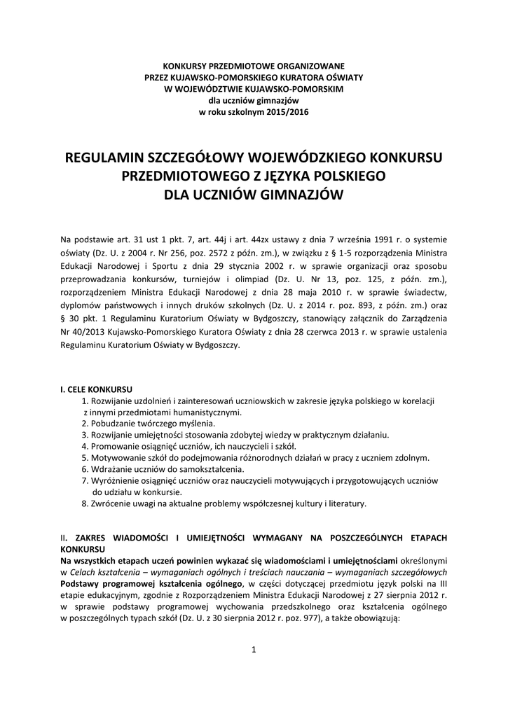 KONKURSY PRZEDMIOTOWE ORGANIZOWANE PRZEZ KUJAWSKO-POMORSKIEGO KURATORA OŚWIATY W WOJEWÓDZTWIE KUJAWSKO-POMORSKIM dla uczniów gimnazjów w roku szkolnym 2015/2016 REGULAMIN SZCZEGÓŁOWY WOJEWÓDZKIEGO KONKURSU PRZEDMIOTOWEGO Z JĘZYKA POLSKIEGO DLA UCZNIÓW GIMNAZJÓW Na podstawie art. 31 ust 1 pkt. 7, art. 44j i art. 44zx ustawy z dnia 7 września 1991 r. o systemie oświaty (Dz. U. z 2004 r. Nr 256, poz. 2572 z późn. zm.), w związku z § 1-5 rozporządzenia Ministra Edukacji Narodowej i Sportu z dnia 29 stycznia 2002 r. w sprawie organizacji oraz sposobu przeprowadzania konkursów, turniejów i olimpiad (Dz. U. Nr 13, poz. 125, z późn. zm.), rozporządzeniem Ministra Edukacji Narodowej z dnia 28 maja 2010 r. w sprawie świadectw, dyplomów państwowych i innych druków szkolnych (Dz. U. z 2014 r. poz. 893, z późn. zm.) oraz § 30 pkt. 1 Regulaminu Kuratorium Oświaty w Bydgoszczy, stanowiący załącznik do Zarządzenia Nr 40/2013 Kujawsko-Pomorskiego Kuratora Oświaty z dnia 28 czerwca 2013 r. w sprawie ustalenia Regulaminu Kuratorium Oświaty w Bydgoszczy. I. CELE KONKURSU 1. Rozwijanie uzdolnień i zainteresowań uczniowskich w zakresie języka polskiego w korelacji z innymi przedmiotami humanistycznymi. 2. Pobudzanie twórczego myślenia. 3. Rozwijanie umiejętności stosowania zdobytej wiedzy w praktycznym działaniu. 4. Promowanie osiągnięć uczniów, ich nauczycieli i szkół. 5. Motywowanie szkół do podejmowania różnorodnych działań w pracy z uczniem zdolnym. 6. Wdrażanie uczniów do samokształcenia. 7. Wyróżnienie osiągnięć uczniów oraz nauczycieli motywujących i przygotowujących uczniów do udziału w konkursie. 8. Zwrócenie uwagi na aktualne problemy współczesnej kultury i literatury. II. ZAKRES WIADOMOŚCI I UMIEJĘTNOŚCI WYMAGANY NA POSZCZEGÓLNYCH ETAPACH KONKURSU Na wszystkich etapach uczeń powinien wykazać się wiadomościami i umiejętnościami określonymi w Celach kształcenia – wymaganiach ogólnych i treściach nauczania – wymaganiach szczegółowych Podstawy programowej kształcenia ogólnego, w części dotyczącej przedmiotu język polski na III etapie edukacyjnym, zgodnie z Rozporządzeniem Ministra Edukacji Narodowej z 27 sierpnia 2012 r. w sprawie podstawy programowej wychowania przedszkolnego oraz kształcenia ogólnego w poszczególnych typach szkół (Dz. U. z 30 sierpnia 2012 r. poz. 977), a także obowiązują: 1 1. Wiadomości i umiejętności z zakresu historii i teorii literatury, poetyki, współczesnego życia kulturalnego, z uwzględnieniem wydarzeń kulturalnych województwa kujawsko-pomorskiego; 2. Zasada kumulatywności, zadania mogą odnosić się do wymagań wpisanych w I, II i III etapie edukacyjnym; 3. Literatura z poprzednich etapów konkursu, ujętych w tym Regulaminie szczegółowym. Arkusz konkursowy na każdym etapie będzie się składał z części testowej i części sprawdzającej umiejętność redagowania krótkiej lub / i dłuższej wypowiedzi pisemnej. Uczestnicy konkursu powinni, na poszczególnych etapach, wykazać się wiadomościami i umiejętnościami obejmującymi wskazane treści Podstawy programowej kształcenia ogólnego w części dotyczącej przedmiotu język polski na III etapie edukacyjnym, zgodnie z rozporządzeniem Ministra Edukacji Narodowej z 27 sierpnia 2012 r. w sprawie podstawy programowej wychowania przedszkolnego oraz kształcenia ogólnego w poszczególnych typach szkół (Dz.U. z 30 sierpnia 2012 r. poz. 977) oraz wskazanymi wiadomościami i umiejętnościami poszerzającymi treści nauczania podstawy programowej, jak również z uwzględnieniem korelacji w zakresie przedmiotów humanistycznych i z zachowaniem zasady kumulatywności. ETAP I (szkolny) Obowiązuje zakres merytoryczny z podstawy programowej, łącznie z zasadą kumulatywności, poszerzony o literaturę: 1. Jan Parandowski Mitologia, R. Graves Mity greckie (mit o wojnie trojańskiej, mit o Narcyzie, mit o Prometeuszu, mit o Demeter i Korze) 2. Jan Parandowski Przygody Odyseusza 3. H. Ch. Andersen Ciotka Fluksja, Cudowna, Bzowa Babuleńka 4. Dorota Terakowska Tam gdzie spadają Anioły ETAP II (rejonowy) Na etapie II konkursu obowiązuje zakres wiadomości i umiejętności z podstawy programowej, łącznie z zasadą kumulatywności oraz literatura z I etapu konkursu. Zakres merytoryczny zostaje poszerzony o: 1. T. Różewicz tom poezji Wyjście 2. J. Tuwim- wiersze dla dzieci: Lokomotywa, Ptasie radio, Warzywa, Dwa wiatry, Pan Maluśkiewicz i wieloryb 3. A. Mickiewicz Pan Tadeusz, ballady: Lilie, Świteź, Pani Twardowska 4. S. Mrożek opowiadania: Dzieci, Poezja, Wiosna w Polsce, Półpancerze praktyczne 5. K. I. Gałczyński Teatrzyk Zielona gęś: Ballada «Lilie», Nagły koniec P. Twardowskiej, Pan Tadeusz, Poranek Mickiewiczowski, Pomysł Zeusa, Skutki gry Orfeusza 6. M. Musierowicz Opium w rosole 7. G. H. Wells Wehikuł czasu Ponadto: - znajomość faktów z biografii A. Mickiewicza 2 - środki stylistyczne (fonetyczne i leksykalne), inne niż wskazane w Podstawie programowej I.3.1, II 2.4. ETAP III (wojewódzki) Na etapie III konkursu obowiązuje zakres wiadomości i umiejętności z podstawy programowej, łącznie z zasadą kumulatywności oraz literatura z I i II etapu konkursu. Zakres merytoryczny zostaje poszerzony o: 1. W. Szekspir Kupiec wenecki 2. A. Huxley Nowy wspaniały świat 3. J. Słowacki Balladyna 4. J. Verne Wokół Księżyca 5. Ida Fink tom Podróż 6. H. Sienkiewicz Potop 7. A. Zagajewski tom poezji Asymetria Ponadto: - znajomość faktów z biografii J. Słowackiego, - rodzaje stylizacji (także: scjentystyczna). III. Źródła informacji pomocne w pracy ucznia i nauczyciela, stanowiące podstawę rozstrzygania wszelkich wątpliwości 1. Okresy literackie, praca zbiorowa, WSiP 2. Słownik rodzajów i gatunków literackich, red. G. Gazda, Wydawnictwo Universitas 3. A. Kulawik Poetyka, Wydawnictwo Antykwa 4. Słownik terminów literackich , Wydawnictwo Ossolineum 5. Nauka o język
