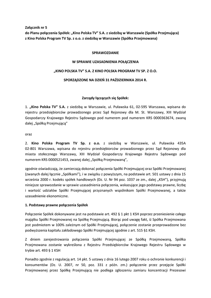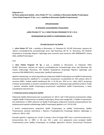 Załącznik nr 5 do Planu połączenia Spółek: „Kino Polska TV” S.A. z siedzibą w Warszawie (Spółka Przejmująca) z Kino Polska Program TV Sp. z o.o. z siedzibą w Warszawie (Spółka Przejmowana) SPRAWOZDANIE W SPRAWIE UZASADNIENIA POŁĄCZENIA „KINO POLSKA TV” S.A. Z KINO POLSKA PROGRAM TV SP. Z O.O. SPORZĄDZONE NA DZIEŃ 31 PAŹDZIERNIKA 2014 R. Zarządy łączących się Spółek: 1. „Kino Polska TV” S.A. z siedzibą w Warszawie, ul. Puławska 61, 02-595 Warszawa, wpisana do rejestru przedsiębiorców prowadzonego przez Sąd Rejonowy dla M. St. Warszawy, XIII Wydział Gospodarczy Krajowego Rejestru Sądowego pod numerem pod numerem KRS 0000363674, zwaną dalej „Spółką Przejmującą” oraz 2. Kino Polska Program TV Sp. z o.o. z siedzibą w Warszawie, ul. Puławska 435A 02-801 Warszawa, wpisana do rejestru przedsiębiorców prowadzonego przez Sąd Rejonowy dla miasta stołecznego Warszawy, XIII Wydział Gospodarczy Krajowego Rejestru Sądowego pod numerem KRS 0000521453, zwanej dalej „Spółką Przejmowaną”, zgodnie oświadczają, że zamierzają dokonać połączenia Spółki Przejmującej oraz Spółki Przejmowanej (zwanych dalej łącznie „Spółkami”), i w związku z powyższym, na podstawie art. 501 ustawy z dnia 15 września 2000 r. kodeks spółek handlowych (Dz. U. Nr 94 poz. 1037 ze zm., dalej „KSH”), przyjmują niniejsze sprawozdanie w sprawie uzasadnienia połączenia, wskazujące jego podstawy prawne, liczbę i wartość udziałów Spółki Przejmującej przyznanych wspólnikom Spółki Przejmowanej, a także uzasadnienie ekonomiczne. 1. Podstawy prawne połączenia Spółek Połączenie Spółek dokonywane jest na podstawie art. 492 § 1 pkt 1 KSH poprzez przeniesienie całego majątku Spółki Przejmowanej na Spółkę Przejmującą. Biorąc pod uwagę fakt, iż Spółka Przejmowana jest podmiotem w 100% zależnym od Spółki Przejmującej, połączenie zostanie przeprowadzone bez podwyższenia kapitału zakładowego Spółki Przejmującej zgodnie z art. 515 §1 KSH. Z dniem zarejestrowania połączenia Spółki Przejmującej ze Spółką Przejmowaną, Spółka Przejmowana zostanie wykreślona z Rejestru Przedsiębiorców Krajowego Rejestru Sądowego w trybie art. 493 § 1 KSH Ponadto zgodnie z regulacją art. 14 pkt. 5 ustawy z dnia 16 lutego 2007 roku o ochronie konkurencji i konsumentów (Dz. U. 2007, nr 50, poz. 331 z późn. zm.) połączenie przez przejęcie Spółki Przejmowanej przez Spółkę Przejmującą nie podlega zgłoszeniu zamiaru koncentracji Prezesowi Urzędu Ochrony Konkurencji i Konsumentów, gdyż spółki łączące się należą do tej samej Grupy Kapitałowej. 2. Określenie liczby i wartości udziałów Spółki Przejmującej przyznanych wspólnikom Spółki Przejmowanej Przejęcie Spółki Przejmowanej przez Spółkę Przejmującą nastąpi bez podwyższenia kapitału zakładowego Spółki Przejmującej. Spółka Przejmująca nie obejmie własnych akcji w wyniku przejęcia majątku Spółki Przejmowanej. 3. Uzasadnienie ekonomiczne połączenia Spółek Celem połączenia jest uproszczenie struktur Grupy Kapitałowej „Kino Polska TV” S.A. (zwana dalej: „Grupa”) w ramach prowadzonej działalności gospodarczej w Polsce, oraz uzyskanie efektów synergii operacyjnej i kosztowej. Przewiduje się, że połączenie przyniesie szereg korzyści operacyjnych i oszczędności finansowych, w tym: - umocnienie pozycji rynkowej, finansowej i negocjacyjnej wobec dostawców „Kino Polska TV” S.A. poprzez powstanie jednego silnego podmiotu gospodarczego, którego główną działalnością jest emisja i produkcja kanałów telewizyjnych, - skumulowanie działań marketingowych w podmiocie dominującym Grupy, tj. w „Kino Polska TV” S.A., a także centralizacja w nim funkcji realizowanych obecnie przez dwa odrębne podmioty i uzyskanie jednolitego przekazu marketingowego, - zapewnienie konsolidacji składników majątku łączących się Spółek, w tym środków trwałych, zapasów, materiałów oraz wiedzy fachowej (know-how), - uproszczenie struktury organizacyjnej i sposobu działania Grupy, a co za tym idzie zwiększenie efektywności jej funkcjonowania, uproszczenie przepływów, redukcja ilości dokumentów, eliminacja wzajemnych rozliczeń Spółek łączących się, - oszczędności finansowe w obszarze administracyjnym i organizacyjnym, a tym samym zmniejszenie kosztów działalności dzięki uproszeniu struktury Grupy. Niniejsze Sprawozdanie zostało przyjęte i podpisane przez Zarządy łączących się spółek, tj. „Kino Polska TV” S.A. i Kino Polska Program TV Sp. z o.o. w dniu 31 października 2014 roku. W imieniu Kino Polska TV S.A. _______________________________ podpisy W imieniu Kino Polska Program TV Sp. z o.o. _______________________________ podpisy