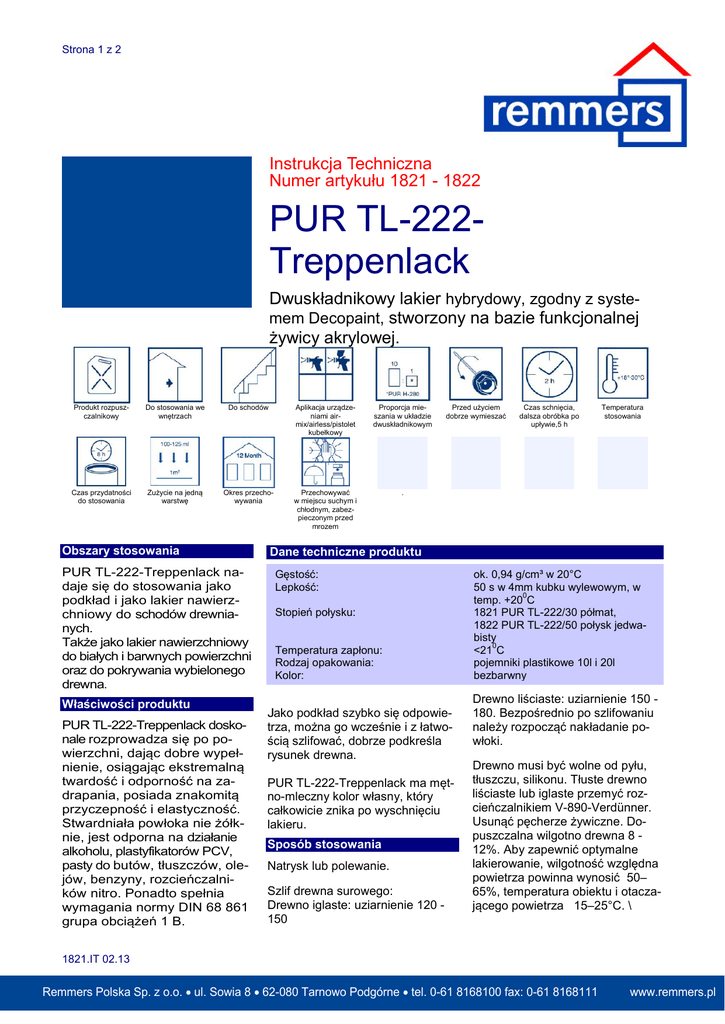 Strona 1 z 2 Instrukcja Techniczna Numer artykułu 1821 - 1822 PUR TL-222Treppenlack Dwuskładnikowy lakier hybrydowy, zgodny z systemem Decopaint, stworzony na bazie funkcjonalnej żywicy akrylowej. Produkt rozpuszczalnikowy Do stosowania we wnętrzach Do schodów Aplikacja urządzeniami airmix/airless/pistolet kubełkowy Proporcja mieszania w układzie dwuskładnikowym Czas przydatności do stosowania Zużycie na jedną warstwę Okres przechowywania Przechowywać w miejscu suchym i chłodnym, zabezpieczonym przed mrozem . Obszary stosowania PUR TL-222-Treppenlack nadaje się do stosowania jako podkład i jako lakier nawierzchniowy do schodów drewnianych. Także jako lakier nawierzchniowy do białych i barwnych powierzchni oraz do pokrywania wybielonego drewna. Właściwości produktu PUR TL-222-Treppenlack doskonale rozprowadza się po powierzchni, dając dobre wypełnienie, osiągając ekstremalną twardość i odporność na zadrapania, posiada znakomitą przyczepność i elastyczność. Stwardniała powłoka nie żółknie, jest odporna na działanie alkoholu, plastyfikatorów PCV, pasty do butów, tłuszczów, olejów, benzyny, rozcieńczalników nitro. Ponadto spełnia wymagania normy DIN 68 861 grupa obciążeń 1 B. Przed użyciem dobrze wymieszać Czas schnięcia, dalsza obróbka po upływie,5 h Temperatura stosowania Dane techniczne produktu Gęstość: Lepkość: Stopień połysku: Temperatura zapłonu: Rodzaj opakowania: Kolor: Jako podkład szybko się odpowietrza, można go wcześnie i z łatwością szlifować, dobrze podkreśla rysunek drewna. PUR TL-222-Treppenlack ma mętno-mleczny kolor własny, który całkowicie znika po wyschnięciu lakieru. Sposób stosowania Natrysk lub polewanie. Szlif drewna surowego: Drewno iglaste: uziarnienie 120 150 ok. 0,94 g/cm³ w 20°C 50 s w 4mm kubku wylewowym, w 0 temp. +20 C 1821 PUR TL-222/30 półmat, 1822 PUR TL-222/50 połysk jedwabisty 0 <21 C pojemniki plastikowe 10l i 20l bezbarwny Drewno liściaste: uziarnienie 150 180. Bezpośrednio po szlifowaniu należy rozpocząć nakładanie powłoki. Drewno musi być wolne od pyłu, tłuszczu, silikonu. Tłuste drewno liściaste lub iglaste przemyć rozcieńczalnikiem V-890-Verdünner. Usunąć pęcherze żywiczne. Dopuszczalna wilgotno drewna 8 12%. Aby zapewnić optymalne lakierowanie, wilgotność względna powietrza powinna wynosić 50– 65%, temperatura obiektu i otaczającego powietrza 15–25°C. \ 1821.IT 02.13 Remmers Polska Sp. z o.o. • ul. Sowia 8 • 62-080 Tarnowo Podgórne • tel. 0-61 8168100 fax: 0-61 8168111 www.remmers.pl Strona 2 z 2 PUR TL-222-Treppenlack zmieszać z utwardzaczem H-280Härter w stosunku 10:1 (lakier: utwardzacz). W połączeniu z utwardzaczem lakier osiąga wymaganą konsystencję. Czas przydatności mieszanki do użycia wynosi 8 godzin. Stare mieszanki mają niewielkie właściwości użytkowe! Pistolet kubełkowy : średnica dyszy: 1,8mm do 2,0 mm ciśnienie powietrza: 2 do 3 bar Urządzenie lakiernicze airmix: średnica dyszy: 0,23 do 0,28 mm ciśnienie materiału: 0,8 do 1,3 bar Spody: 2 warstwy Wierzchy: 3 warstwy Międzyszlif wykonać papierem ściernym o uziarnieniu 240-320. Wskazówki Narzędzia lakiernicze i wszelkie materiały robocze mogą być wykonane wyłącznie z materiałów nie rdzewiejących (stal nierdzewna, tworzywa sztuczne). Dwuskładnikowe lakiery poliuretanowe twardnieją optymalnie tylko w temperaturze co najmniej18°C, przy czym w ciągu twardnienia minimalna temperatura musi się utrzymywać przez co najmniej 2 dni. Dwuskładnikowe powłoki PUR należy zawsze na krótko przed nałożeniem następnej powłoki przeszlifować, aby zapewnić jej optymalną przyczepność. Naruszone opakowanie utwardzacza należy przechowywać zawsze szczelnie zamknięte. Utwardzacz reaguje z wilgocią z powietrza. Odradza się posługiwanie się tym materiałem alergikom i astmatykom. Do pakowania polakierowanych na gotowo elementów należy używać materiałów przepuszczających powietrze. Kolor i wzajemną tolerancję z podłożem należy sprawdzić przez wykonanie próbnego malowania. Narzędzia, czyszczenie Urządzenia ciśnieniowe, airless lub polewarki, wanny zanurzeniowe. Narzędzia czyścić za pomocą rozcieńczalnika WV-891-Waschverdünnung. Brudną ciecz usunąć zgodnie z przepisami. Zużycie, ilość nanoszonego materiału W zależności od rodzaju podłoża około.100 - 125 g/m². Schnięcie Pyłosuchość powłoka osiąga po 20 - 30 minutach. Warstwa jest sucha, nadaje się do szlifowania i do kolejnego lakierowania po około 2 godzinach. Międzyszlif wykonać papierem ściernym o ziarnistości 240 - 320. Elementy polakierowane na gotowo mogą być układane jeden na drugim po przeschnięciu przez noc. Wartości sprawdzone w praktyce 0 dla temperatury pokojowej +20 C i wilgotności względnej powietrza 65%. Niższe temperatury i wyższa wilgotność wydłużają czas wysychania. Rozcieńczanie W razie potrzeby za pomocą maks. 2% V-890-Verdünnung. Składowanie Bezpieczeństwo Identyfikacja zagrożeń Produkt wysoce łatwopalny. Powtarzające się narażenie może powodować wysychanie lub pękanie skóry. Pary mogą powodować uczucie senności i zawroty głowy. Wskazówki dotyczące bezpiecznego obchodzenia się z preparatem Nie przechowywać w pobliżu źródeł zapłonu - nie palić tytoniu. Nie wdychać pary/rozpylonej cieczy. Unikać zanieczyszczenia skóry. Nosić odpowiednią odzież ochronną, rękawice ochronne i okulary lub ochronę twarzy. Stosować wyłącznie w dobrze wentylowanych pomieszczeniach. W razie aplikacji natryskowej niezbędne jest noszenie indywidualnych środków ochrony. Ochrona dróg oddechowych; filtr kombinowany, co najmniej A2/P2 (np. firmy Dräger). Odpowiednie rękawice ochronne – patrz karta charakterystyki. Nosić zamkniętą odzież roboczą. Usuwanie Resztki produktu usuwać zgodnie z obowiązującymi przepisami. Puste opakowania oddać do recyklingu. Oznaczenie GefStoffV: WGK: ADR