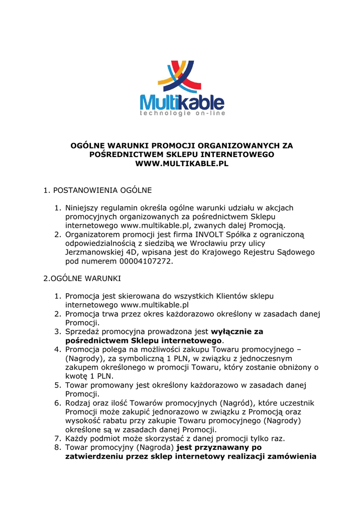 OGÓLNE WARUNKI PROMOCJI ORGANIZOWANYCH ZA POŚREDNICTWEM SKLEPU INTERNETOWEGO WWW.MULTIKABLE.PL 1. POSTANOWIENIA OGÓLNE 1. Niniejszy regulamin określa ogólne warunki udziału w akcjach promocyjnych organizowanych za pośrednictwem Sklepu internetowego www.multikable.pl, zwanych dalej Promocją. 2. Organizatorem promocji jest firma INVOLT Spółka z ograniczoną odpowiedzialnością z siedzibą we Wrocławiu przy ulicy Jerzmanowskiej 4D, wpisana jest do Krajowego Rejestru Sądowego pod numerem 00004107272. 2.OGÓLNE WARUNKI 1. Promocja jest skierowana do wszystkich Klientów sklepu internetowego www.multikable.pl 2. Promocja trwa przez okres każdorazowo określony w zasadach danej Promocji. 3. Sprzedaż promocyjna prowadzona jest wyłącznie za pośrednictwem Sklepu internetowego. 4. Promocja polega na możliwości zakupu Towaru promocyjnego – (Nagrody), za symboliczną 1 PLN, w związku z jednoczesnym zakupem określonego w promocji Towaru, który zostanie obniżony o kwotę 1 PLN. 5. Towar promowany jest określony każdorazowo w zasadach danej Promocji. 6. Rodzaj oraz ilość Towarów promocyjnych (Nagród), które uczestnik Promocji może zakupić jednorazowo w związku z Promocją oraz wysokość rabatu przy zakupie Towaru promocyjnego (Nagrody) określone są w zasadach danej Promocji. 7. Każdy podmiot może skorzystać z danej promocji tylko raz. 8. Towar promocyjny (Nagroda) jest przyznawany po zatwierdzeniu przez sklep internetowy realizacji zamówienia 9. Do zakupu Towaru promocyjnego (Nagrody) znajdują zastosowanie wszystkie zasady sprzedaży określone w Regulaminie Sklepu internetowego, z wyłączeniem prawa zwrotu. 10. Towar promowany nie podlega zwrotowi. 11. Warunkiem uczestnictwa w akcji promocyjnej jest dobrowolne zapisanie się do newslettera sklepu internetowego. 12. Każdy uczestnik akcji promocyjnej akceptuje regulamin sklepu oraz regulamin promocji. Promocja trwa do odwołania lub wyczerpania zapasów.