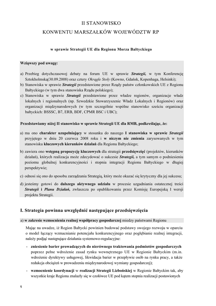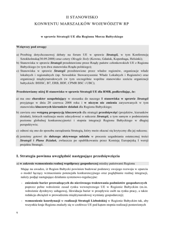 II STANOWISKO KONWENTU MARSZAŁKÓW WOJEWÓDZTW RP w sprawie Strategii UE dla Regionu Morza Bałtyckiego Wziąwszy pod uwagę: a) Przebieg dotychczasowej debaty na forum UE w sprawie Strategii, w tym Konferencję Sztokholmską(30.09.2008) oraz cztery Okrągłe Stoły (Kowno, Gdańsk, Kopenhaga, Helsinki); b) Stanowiska w sprawie Strategii przedstawione przez Rządy państw członkowskich UE z Regionu Bałtyckiego (w tym dwa stanowiska Rządu polskiego); c) Stanowiska w sprawie Strategii przedstawione przez władze regionów, organizacje władz lokalnych i regionalnych (np. Szwedzkie Stowarzyszenie Władz Lokalnych i Regionów) oraz organizacji międzynarodowych (w tym szczególnie wspólne stanowisko sześciu organizacji bałtyckich: BSSSC, B7, ERB, BDF, CPMR BSC i UBC); Przedstawiamy niżej II stanowisko w sprawie Strategii UE dla RMB, podkreślając, że: a) ma ono charakter uzupełniający w stosunku do naszego I stanowiska w sprawie Strategii przyjętego w dniu 20 czerwca 2008 roku i w niczym nie zmienia zarysowanych w tym stanowisku kluczowych kierunków działań dla Regionu Bałtyckiego; b) zawiera ono wstępną propozycję kluczowych dla strategii przedsięwzięć (projektów, kierunków działań), których realizacja może zdecydować o sukcesie Strategii, a tym samym o podniesieniu poziomu globalnej konkurencyjności i stopnia integracji Regionu Bałtyckiego w długiej perspektywie; c) odnosi się ono do sposobu zarządzania Strategią, który może okazać się krytyczny dla jej sukcesu; d) jesteśmy gotowi do dalszego aktywnego udziału w procesie uzgadniania ostatecznej treści Strategii i Planu Działań, zwłaszcza po opublikowaniu przez Komisję Europejską I wersji projektu Strategii. I. Strategia powinna uwzględnić następujące przedsięwzięcia a) w zakresie wzmocnienia realnej współpracy gospodarczej miedzy państwami Regionu Mając na uwadze, iż Region Bałtycki powinien budować podstawy swojego rozwoju w oparciu o model łączący wzmacnianie potencjału konkurencyjnego oraz pogłębianie realnej integracji, należy podjąć następujące działania systemowo-regulacyjne: - zniesienie barier prowadzących do nierównego traktowania podmiotów gospodarczych poprzez pełne wdrożenie zasad rynku wewnętrznego UE w Regionie Bałtyckim (m.in. wdrożenie dyrektywy usługowej, likwidacja barier w przepływie osób na rynku pracy, a także redukcja obciążeń w prowadzeniu międzynarodowej wymiany gospodarczej); - wzmocnienie koordynacji w realizacji Strategii Lizbońskiej w Regionie Bałtyckim tak, aby wszystkie kraje Regionu znalazły się w czołówce UE pod kątem stopnia realizacji postawionych 1 w Strategii Lizbońskiej celów; należy rozważyć opracowanie i uzgodnienie Bałtyckiego Programu Reform, który były monitorowany i sterowany przez nieformalną Bałtycką Radę Strategii Lizbońskiej (Bałtycką Radę Konkurencyjności) na poziomie szefów rządów. b) w zakresie pogłębiania współpracy uniwersyteckiej (w tym badawczo-rozwojowej) Należy dążyć do stworzenia Bałtyckiego Rynku Wiedzy (wdrożenie tzw. piątej swobody, czyli swobody przepływu wiedzy) poprzez m.in.: - uruchomienie wieloletniego programu stypendiów i staży dla studentów i naukowców, obejmującego wszystkie kraje UE w Regionie Bałtyckim, ze szczególnym uwzględnieniem relacji między starymi i nowymi państwami członkowskimi UE; program ten powinien obejmować przede wszystkim te dziedziny wiedzy, w których Region Bałtycki dysponuje kompetencjami w skali europejskiej lub globalnej; - mocniejszą koordynację współpracy na rzecz efektywniejszego wykorzystania zasobów i infrastruktury nauki w Regionie Bałtyckim, co może prowadzić do utworzenia Bałtyckiej Infrastruktury Wiedzy; - ulokowanie we Wrocławiu jednej ze Wspólnot Wiedzy i Innowacji w ramach Europejskiego Instytutu Technologicznego; - uruchomienie inicjatywy Baltic Brain Bridge (rekomendowanej w ramach projektu PolyMETREXplus) obejmującej wszystkie (nie tylko stołeczne) obszary metropolitalne w Regionie Bałtyckim i będącej próbą stworzenia przeciwwagi dla obszaru Pentagonu w zachodniej części UE. c) w zakresie pobudzania rozwoju współpracy w dziedzinie przedsiębiorczości i innowacji Należy uruchomić serię pogłębionych projektów pilotażowych, których celem będzie identyfikacja partnerów oraz potencjału gospodarczego i innowacyjnego, a także ekonomicznych korzyści i realnych barier tworzenia transnarodowych klastrów bałtyckich w takich obszarach, jak: biotechnologia, ekologia, energetyka, informatyka, przemysł farmaceutyczny, spożywczy i drzewny oraz w innych obszarach (np. obróbka bursztynu, design), w których Region Bałtycki ma unikalne kompetencje, doświadczenie i znaczenie gospodarcze w skali europejskiej i światowej. d) w zakresie poprawa dostępności i spójności transportowej Regionu - pilna realizacja priorytetowych inwestycji TEN-t w Regionie Bałtyckim; w przypadku Polski oznacza to realizację następujących przedsięwzięć (patrz: mapa w Załączniku): • realizacja autostrady Al (Gdańsk - Łódź - Katowice - granica) na całej długości; • modernizacja linii E 65 (Gdynia - Warszawa - Katowice - granica) na całej długości; • budowa Raił Baltica (granica - Suwałki - Ełk - Białystok - Warszawa) na całej długości; - uzupełnienie sieci TEN-t w Regionie Bałtyckim o nowe odcinki, które przyczynią się do wzmocnienia powiązań gospodarczych; w przypadku Polski oznacza to skupienie wysiłków inwestycyjnych na następujących korytarzach transportowych i tworzących się wokół nich stref rozwojowych (patrz: mapa w Załączniku): • Nadmorski (Północny) korytarz transportowy: droga krajowa nr 6 na odcinku: Szczecin - Koszalin - Słupsk - Gdańsk (Al); droga krajowa nr 16 na odcinku: (Al) Grudziądz - Olsztyn - Ełk (Via Baltica); linia kolejowa: Stargard Szczeciński - Koszalin - Słupsk - Gdynia; 2 linia kolejowa: Elbląg - Olsztyn; lini