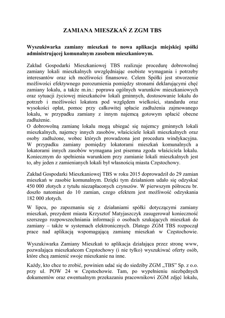 ZAMIANA MIESZKAŃ Z ZGM TBS Wyszukiwarka zamiany mieszkań to nowa aplikacja miejskiej spółki administrującej komunalnym zasobem mieszkaniowym. Zakład Gospodarki Mieszkaniowej TBS realizuje procedurę dobrowolnej zamiany lokali mieszkalnych uwzględniając osobiste wymagania i potrzeby interesantów oraz ich możliwości finansowe. Celem Spółki jest stworzenie możliwości efektywnego porozumienia pomiędzy stronami deklarującymi chęć zamiany lokalu, a także m.in.: poprawa ogólnych warunków mieszkaniowych oraz sytuacji życiowej mieszkańców lokali gminnych, dostosowanie lokalu do potrzeb i możliwości lokatora pod względem wielkości, standardu oraz wysokości opłat, pomoc przy całkowitej spłacie zadłużenia zajmowanego lokalu, w przypadku zamiany z innym najemcą gotowym spłacić obecne zadłużenie. O dobrowolną zamianę lokalu mogą ubiegać się najemcy gminnych lokali mieszkalnych, najemcy innych zasobów, właściciele lokali mieszkalnych oraz osoby zadłużone, wobec których prowadzona jest procedura windykacyjna. W przypadku zamiany pomiędzy lokatorami mieszkań komunalnych a lokatorami innych zasobów wymagana jest pisemna zgoda właściciela lokalu. Koniecznym do spełnienia warunkiem przy zamianie lokali mieszkalnych jest to, aby jeden z zamienianych lokali był własnością miasta Częstochowy. Zakład Gospodarki Mieszkaniowej TBS w roku 2015 doprowadził do 29 zamian mieszkań w zasobie komunalnym. Dzięki tym działaniom udało się odzyskać 450 000 złotych z tytułu niezapłaconych czynszów. W pierwszym półroczu br. doszło natomiast do 10 zamian, czego efektem jest możliwość odzyskania 182 000 złotych. W lipcu, po zapoznaniu się z działaniami spółki dotyczącymi zamiany mieszkań, prezydent miasta Krzysztof Matyjaszczyk zasugerował konieczność szerszego rozpowszechniania informacji o osobach szukających mieszkań do zamiany – także w systemach elektronicznych. Dlatego ZGM TBS rozpoczął prace nad aplikacją wspomagającą zamianę mieszkań w Częstochowie. Wyszukiwarka Zamiany Mieszkań to aplikacja działająca przez stronę www, pozwalająca mieszkańcom Częstochowy (i nie tylko) wyszukiwać oferty osób, które chcą zamienić swoje mieszkanie na inne. Każdy, kto chce to zrobić, powinien udać się do siedziby ZGM „TBS” Sp. z o.o. przy ul. POW 24 w Częstochowie. Tam, po wypełnieniu niezbędnych dokumentów oraz ewentualnym przekazaniu pracownikowi ZGM zdjęć lokalu, oferta zostanie bezpłatnie zamieszczona w internetowej wyszukiwarce dostępnej na stronie Spółki. Oferty mieszkańców, których lokale znajdują się w zasobach komunalnych są połączone z systemem informatycznym spółki. Dzięki takiemu rozwiązaniu, każda oferta będzie posiadała zawsze aktualne dane dotyczące m.in. ewentualnego zadłużenia lokalu. Wysokość zadłużenia będzie widoczna tylko w przypadku, gdy mieszkaniec zadeklarował chęć zamiany takiego mieszkania. Ponadto podczas wyszukiwania odpowiedniego mieszkania nie zostaną ujawnione żadne szczegółowe informacje. Dostępne będą tylko informacje o ulicy, przy której dany lokal się znajduje (pokazane na wygodnej mapce), piętrze, liczbie pokoi oraz inne podstawowe dane, które jednak nie umożliwią bezpośredniej identyfikacji właścicieli/najemców lub samego lokalu. System daje możliwość nie tylko dodania ofert dotyczących mieszkań spoza zasobu komunalnego – np. mieszkań spółdzielczych lub całkowicie prywatnych. Wyszukiwarka pozwala również na dodanie ofert z różnych miast oraz na zamianę mieszkań pomiędzy różnymi miastami. Więcej informacji o procedurze zamiany mieszkań komunalnych w zakładce: ZAMIANA MIESZKAŃ - na stronie http://zgm-tbs.czest.pl Link do wyszukiwarki zamiany http://mieszkania.zgm-tbs.czest.pl/ mieszkań na stronie ZGM TBS: Źródło informacji: ZGM TBS sp. zo.o.