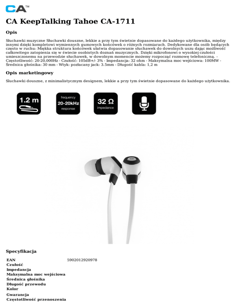 CAKeepTalkingTahoeCA-1711 Opis SłuchawkimuzyczneSłuchawkidouszne,lekkieaprzytymświetniedopasowanedokażdegoużytkownika,między innymidziękikompletowiwymiennychgumowychkońcówekoróżnychrozmiarach.Dedykowanedlaosóbbędących częstowruchu:Miękkastrukturakońcówekułatwiadopasowaniesłuchawekdodowolnychuszudającmożliwość całkowitegozatopieniasięwświecieosobistychdoznańmuzycznych.Dziękimikrofonowiowysokiejczułości umieszczonemunaprzewodziesłuchawek,wdowolnymmomenciemożemyrozpocząćrozmowętelefoniczną.Częstotliwość:20-20,000Hz-Czułość:105dB+/-3%-Impedancja:32ohm-Maksymalnamocwejściowa:100MWŚrednicagłośnika:30mm-Wtyk:pozłacanyjack:3.5mm-Długośćkabla:1,2m Opismarketingowy Sluchawkidouszne,zminimalistycznymdesignem,lekkieaprzytymświetniedopasowanedokażdegoużytkownika. Specyfikacja EAN 5902012920978 Czułość Impedancja Maksymalnamocwejściowa Średnicagłośnika Długośćprzewodu Kolor Gwarancja Częstotliwośćprzenoszenia Złącza e-mail:[email protected] ©2015-2017CaliforniaAccessWszystkieprawazastrzeżone