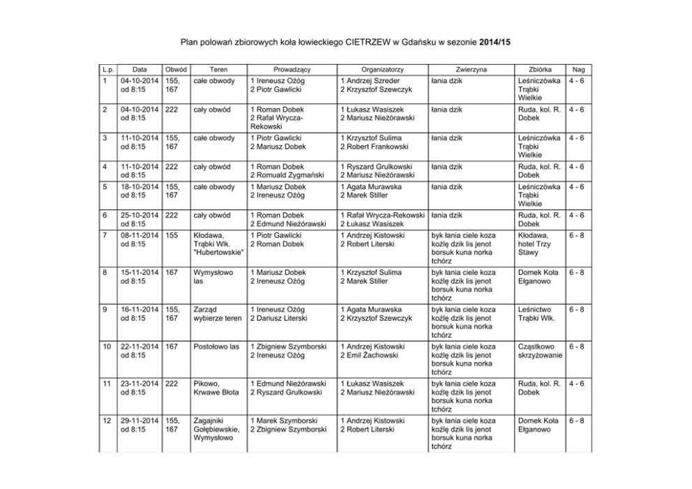 Plan polowań zbiorowych koła łowieckiego CIETRZEW w Gdańsku w sezonie 2014/15 L.p. Data Obwód Teren Prowadzący Organizatorzy Zwierzyna Zbiórka Nag 1 04-10-2014 155, od 8:15 167 całe obwody 1 Ireneusz Ożóg 2 Piotr Gawlicki 1 Andrzej Szreder 2 Krzysztof Szewczyk łania dzik Leśniczówka Trąbki Wielkie 4-6 2 04-10-2014 222 od 8:15 cały obwód 1 Roman Dobek 2 Rafał WryczaRekowski 1 Łukasz Wasiszek 2 Mariusz Nieżórawski łania dzik Ruda, kol. R. Dobek 4-6 3 11-10-2014 155, od 8:15 167 całe obwody 1 Piotr Gawlicki 2 Mariusz Dobek 1 Krzysztof Sulima 2 Robert Frankowski łania dzik Leśniczówka Trąbki Wielkie 4-6 4 11-10-2014 222 od 8:15 cały obwód 1 Roman Dobek 2 Romuald Zygmański 1 Ryszard Grulkowski 2 Mariusz Nieżórawski łania dzik Ruda, kol. R. Dobek 4-6 5 18-10-2014 155, od 8:15 167 całe obwody 1 Mariusz Dobek 2 Ireneusz Ożóg 1 Agata Murawska 2 Marek Stiller łania dzik Leśniczówka Trąbki Wielkie 4-6 6 25-10-2014 222 od 8:15 cały obwód 1 Roman Dobek 2 Edmund Nieżórawski 1 Rafał Wrycza-Rekowski łania dzik 2 Łukasz Wasiszek Ruda, kol. R. Dobek 4-6 7 08-11-2014 155 od 8:15 Kłodawa, 1 Piotr Gawlicki Trąbki Wlk. 2 Roman Dobek "Hubertowskie" 1 Andrzej Kistowski 2 Robert Literski byk łania ciele koza koźlę dzik lis jenot borsuk kuna norka tchórz Kłodawa, hotel Trzy Stawy 6-8 8 15-11-2014 167 od 8:15 Wymysłowo las 1 Mariusz Dobek 2 Ireneusz Ożóg 1 Krzysztof Sulima 2 Marek Stiller byk łania ciele koza koźlę dzik lis jenot borsuk kuna norka tchórz Domek Koła Ełganowo 6-8 9 16-11-2014 155, od 8:15 167 Zarząd wybierze teren 1 Ireneusz Ożóg 2 Dariusz Literski 1 Agata Murawska 2 Krzysztof Szewczyk byk łania ciele koza koźlę dzik lis jenot borsuk kuna norka tchórz Leśnictwo Trąbki Wlk. 6-8 10 22-11-2014 167 od 8:15 Postołowo las 1 Zbigniew Szymborski 2 Ireneusz Ożóg 1 Andrzej Kistowski 2 Emil Żachowski byk łania ciele koza koźlę dzik lis jenot borsuk kuna norka tchórz Cząstkowo 6-8 skrzyżowanie 11 23-11-2014 222 od 8:15 Pikowo, Krwawe Błota 1 Edmund Nieżórawski 2 Ryszard Grulkowski 1 Łukasz Wasiszek 2 Mariusz Nieżórawski byk łania ciele koza koźlę dzik lis jenot borsuk kuna norka tchórz Ruda, kol. R. Dobek 4-6 12 29-11-2014 155, od 8:15 167 Zagajniki Gołębiewskie, Wymysłowo 1 Marek Szymborski 2 Zbigniew Szymborski 1 Andrzej Kistowski 2 Robert Literski byk łania ciele koza koźlę dzik lis jenot borsuk kuna norka tchórz Domek Koła Ełganowo 6-8 13 06-12-2014 222 od 8:15 cały obwód 1 Roman Dobek 2 Rafał WryczaRekowski 1 Ryszard Grulkowski 2 Romuald Zygmański byk łania ciele koza koźlę dzik lis jenot kuna norka tchórz Domek Koła Bartoszylas 4-6 14 13-12-2014 155 od 8:15 Trąbki Wlk., Kłodawa 1 Mariusz Dobek 2 Ireneusz Ożóg 1 Agata Murawska 2 Robert Frankowski byk łania ciele koza koźlę dzik lis jenot kuna norka tchórz Leśniczówka Trąbki Wlk. 6-8 15 20-12-2014 155, od 8:15 167 Polowanie "Wigilijne" 1 Piotr Gawlicki 2 Dariusz Literski 1 Henryk Tisler 2 Kazimierz Dułak byk łania ciele koza koźlę dzik lis jenot kuna norka tchórz Zarząd 6-8 poinformuje komunikatem 16 27-12-2014 222 od 8:15 cały obwód 1 Rafał WryczaRekowski 2 Roman Dobek 1 Łukasz Wasiszek 2 Mariusz Nieżórawski byk łania ciele koza koźlę dzik lis jenot kuna norka tchórz Domek Koła Bartoszylas 17 03-01-2015 167 od 8:15 Postołowo las 1 Paweł Caboń 2 Arkadiusz Szturo 1 Krzysztof Szewczyk 2 Emil Żachowski byk łania ciele koza koźlę dzik lis jenot kuna norka tchórz Cząstkowo 6-8 skrzyżowanie 18 10-01-2015 155 od 8:15 Kłodawa, Trąbki Wlk. 1 Piotr Gawlicki 2 Ireneusz Ożóg 1 Arkadiusz Szturo 2 Marek Stiller byk łania ciele koza koźlę dzik lis jenot kuna tchórz Kłodawa hotel "Trzy Stawy" 6-8 19 10-01-2015 222 od 8:15 cały obwód 1 Edmund Nieżórawski 2 Rafał WryczaRekowski 1 Mariusz Nieżórawski 2 Ryszard Grulkowski byk łania ciele koza koźlę dzik lis jenot kuna norka tchórz Ruda, kol. R. Dobek 2-4 20 11-01-2015 155, od 8:15 167 Zarząd wybierze teren 1 Mariusz Dobek 2 Piotr Gawlicki 1 Kazimierz Dułak 2 Krzysztof Sulima byk łania ciele koza koźlę dzik lis jenot kuna norka tchórz Leśniczówka Trąbki Wielkie 6-8 21 11-01-2015 222 od 8.15 caly obwód 1 Romuald Zygmański 2 Edmund Nieżórawski 1 Ryszard Grulkowski 2 Mariusz Nieżórawski byk łania ciele koza koźlę dzik lis jenot kuna norka tchórz Ruda, kol. R. Dobek 2-4 22 17-01-2015 155, od 8:15 167 Zarząd wybierze teren 1 Zbigniew Szymborski 2 Dariusz Literski 1 Robert Literski byk ciele dzik lis jenot kuna norka tchórz Leśniczówka Trąbki Wielkie 2-4 23 24-01-2015 155, od 8:15 167 Zarząd wybierze teren 1 Arkadiusz Szturo 2 Marek Łagowski 1 Emil Żachowski byk ciele dzik lis jenot kuna norka tchórz Leśniczówka Trąbki Wielkie 2-4 24 31-01-2015 222 od 8:15 cały obwód 1 Roman Dobek 2 Rafał WryczaRekowski 1 Łukasz Wasiszek byk ciele dzik lis jenot kuna norka tchórz Domek Koła Bartoszylas 2-4 4-6