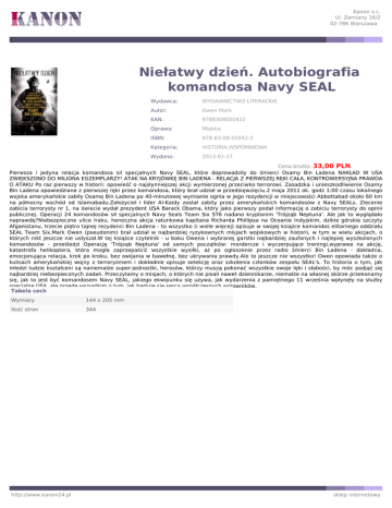 Kanon s.c. Ul. Zamiany 16/2 02-786 Warszawa Niełatwy dzień. Autobiografia komandosa Navy SEAL Wydawca: WYDAWNICTWO LITERACKIE Autor: Owen Mark EAN: 9788308050422 Oprawa: Miękka ISBN: 978-83-08-05042-2 Kategoria: HISTORIA,WSPOMNIENIA Wydano: 2013-01-17 Cena brutto: 33,00 PLN Pierwsza i jedyna relacja komandosa sił specjalnych Navy SEAL, które doprowadziły do śmierci Osamy Bin Ladena NAKŁAD W USA ZWIĘKSZONO DO MILIONA EGZEMPLARZY! ATAK NA KRYJÓWKĘ BIN LADENA - RELACJA Z PIERWSZEJ RĘKI CAŁA, KONTROWERSYJNA PRAWDA O ATAKU Po raz pierwszy w historii: opowieść o najsłynniejszej akcji wymierzonej przeciwko terrorowi. Zasadzka i unieszkodliwienie Osamy Bin Ladena opowiedziane z pierwszej ręki przez komandosa, który brał udział w przedsięwzięciu.2 maja 2011 ok. godz 1:00 czasu lokalnego wojska amerykańskie zabiły Osamę Bin Ladena po 40-minutowej wymianie ognia w jego rezydencji w miejscowości Abbottabad około 60 km na północny wschód od Islamabadu.Założyciel i lider Al-Kaidy został zabity przez amerykańskich komandosów z Navy SEALs. Zlecenie zabicia terrorysty nr 1. na świecie wydał prezydent USA Barack Obama, który jako pierwszy podał informację o zabiciu terrorysty do opinii publicznej. Operacji 24 komandosów sił specjalnych Navy Seals Team Six ST6 nadano kryptonim 'Trójząb Neptuna'. Ale jak to wyglądało naprawdę?Niebezpieczne ulice Iraku, heroiczna akcja ratunkowa kapitana Richarda Phillipsa na Oceanie Indyjskim, dzikie górskie szczyty Afganistanu, trzecie piętro tajnej rezydenci Bin Ladena - to wszystko (i wiele więcej) opisuje w swojej książce komandos elitarnego oddziału SEAL Team Six.Mark Owen (pseudonim) brał udział w najbardziej ryzykownych misjach wojskowych w historii, w tym w wielu akcjach, o których nikt jeszcze nie usłyszał.W tej książce czytelnik - u boku Owena i wybranej garstki najbardziej zaufanych i najlepiej wyszkolonych komandosów - prześledzi Operację 'Trójząb Neptuna' od samych początków: mordercze i wyczerpujące treningi,wyprawa na akcję, katastrofa helikoptera, która mogła zaprzepaścić wszystkie wysiłki, aż po ogłoszenie przez radio śmierci Bin Ladena - dokładna, emocjonująca relacja, krok po kroku, bez owijania w bawełnę, bez ukrywania prawdy.Ale to jeszcze nie wszystko! Owen opowiada także o kulisach amerykańskiej wojny z terroryzmem i dokładnie opisuje selekcję oraz szkolenia członków zespołu SEAL's. To historia o tym, jak młodzi ludzie kształceni są naniemalże super-jednostki, herosów, którzy muszą pokonać wszystkie swoje lęki i słabości, by móc podjąć się najbardziej niebezpiecznych zadań. Przeczytamy o misjach, o których nie pisali nawet dziennikarze, niemalże na własnej skórze przekonamy się, jak to jest być komandosem Navy SEAL, jakiego ekwipunku się używa, jak wydarzenia z pamiętnego 11 września wpłynęły na służby specjalne USA, ale przede wszystkim o tym, jak hartuje się serca współczesnych wojowników. Tabela cech Wymiary 144 x 205 mm Ilość stron 344 http://www.kanon24.pl sklep internetowy