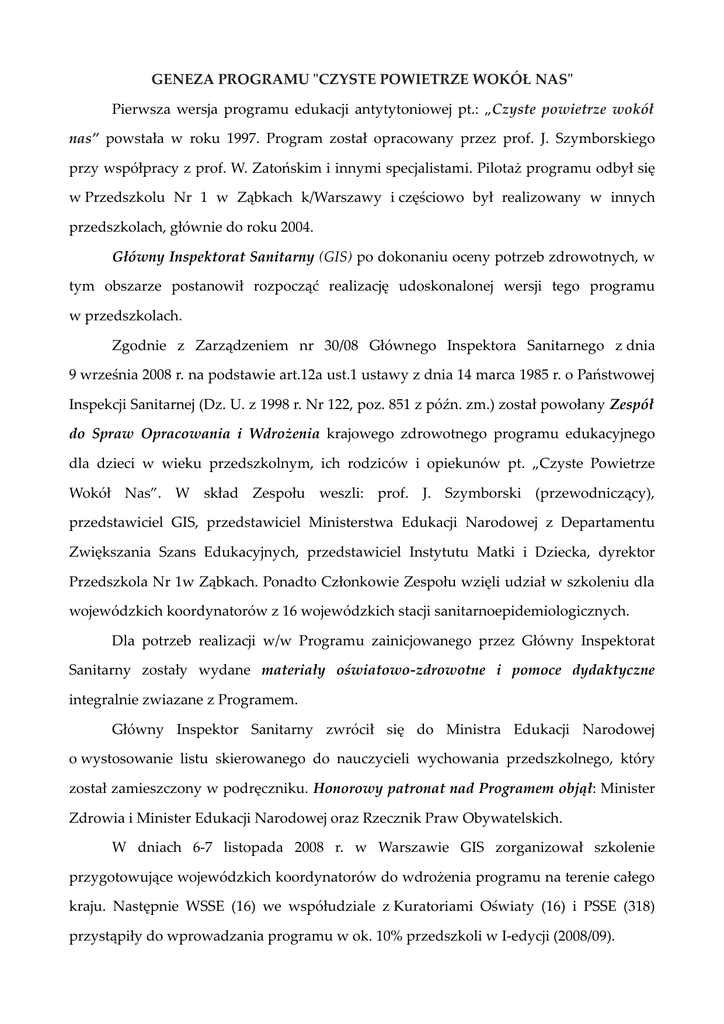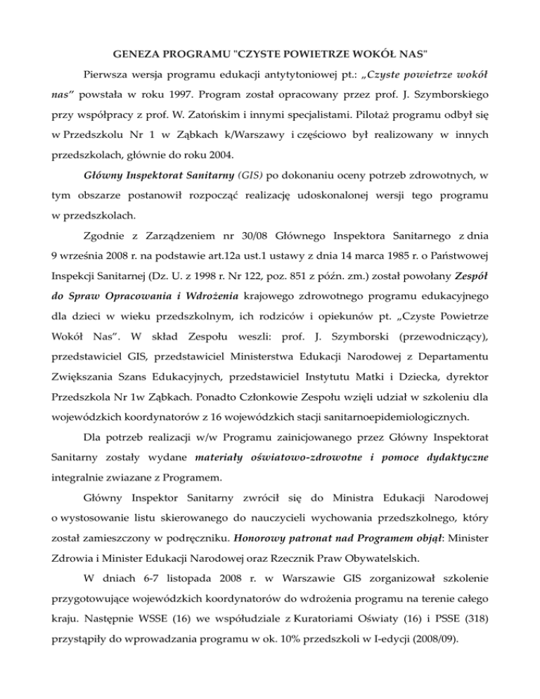 GENEZA PROGRAMU "CZYSTE POWIETRZE WOKÓŁ NAS" Pierwsza wersja programu edukacji antytytoniowej pt.: „Czyste powietrze wokół nas” powstała w roku 1997. Program został opracowany przez prof. J. Szymborskiego przy współpracy z prof. W. Zatońskim i innymi specjalistami. Pilotaż programu odbył się w Przedszkolu Nr 1 w Ząbkach k/Warszawy i częściowo był realizowany w innych przedszkolach, głównie do roku 2004. Główny Inspektorat Sanitarny (GIS) po dokonaniu oceny potrzeb zdrowotnych, w tym obszarze postanowił rozpocząć realizację udoskonalonej wersji tego programu w przedszkolach. Zgodnie z Zarządzeniem nr 30/08 Głównego Inspektora Sanitarnego z dnia 9 września 2008 r. na podstawie art.12a ust.1 ustawy z dnia 14 marca 1985 r. o Państwowej Inspekcji Sanitarnej (Dz. U. z 1998 r. Nr 122, poz. 851 z późn. zm.) został powołany Zespół do Spraw Opracowania i Wdrożenia krajowego zdrowotnego programu edukacyjnego dla dzieci w wieku przedszkolnym, ich rodziców i opiekunów pt. „Czyste Powietrze Wokół Nas”. W skład Zespołu weszli: prof. J. Szymborski (przewodniczący), przedstawiciel GIS, przedstawiciel Ministerstwa Edukacji Narodowej z Departamentu Zwiększania Szans Edukacyjnych, przedstawiciel Instytutu Matki i Dziecka, dyrektor Przedszkola Nr 1w Ząbkach. Ponadto Członkowie Zespołu wzięli udział w szkoleniu dla wojewódzkich koordynatorów z 16 wojewódzkich stacji sanitarnoepidemiologicznych. Dla potrzeb realizacji w/w Programu zainicjowanego przez Główny Inspektorat Sanitarny zostały wydane materiały oświatowo-zdrowotne i pomoce dydaktyczne integralnie zwiazane z Programem. Główny Inspektor Sanitarny zwrócił się do Ministra Edukacji Narodowej o wystosowanie listu skierowanego do nauczycieli wychowania przedszkolnego, który został zamieszczony w podręczniku. Honorowy patronat nad Programem objął: Minister Zdrowia i Minister Edukacji Narodowej oraz Rzecznik Praw Obywatelskich. W dniach 6-7 listopada 2008 r. w Warszawie GIS zorganizował szkolenie przygotowujące wojewódzkich koordynatorów do wdrożenia programu na terenie całego kraju. Następnie WSSE (16) we współudziale z Kuratoriami Oświaty (16) i PSSE (318) przystąpiły do wprowadzania programu w ok. 10% przedszkoli w I-edycji (2008/09).