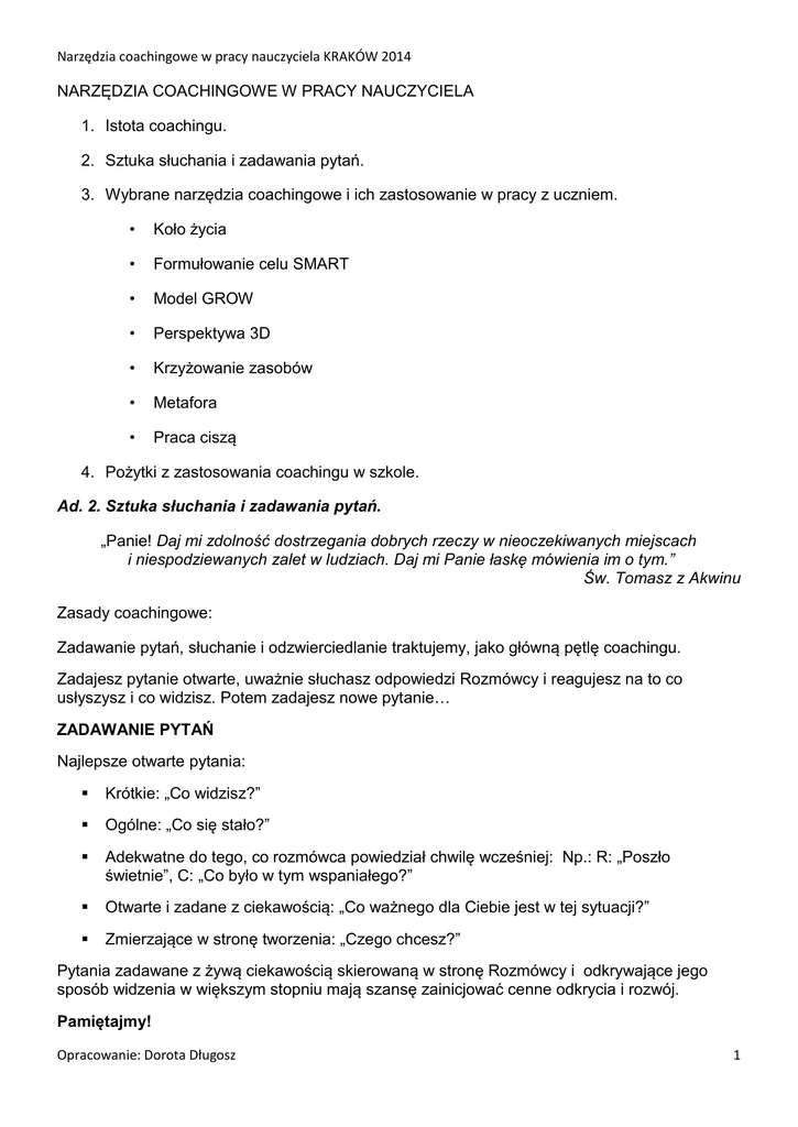 Narzędzia coachingowe w pracy nauczyciela KRAKÓW 2014 NARZĘDZIA COACHINGOWE W PRACY NAUCZYCIELA 1. Istota coachingu. 2. Sztuka słuchania i zadawania pytań. 3. Wybrane narzędzia coachingowe i ich zastosowanie w pracy z uczniem. • Koło życia • Formułowanie celu SMART • Model GROW • Perspektywa 3D • Krzyżowanie zasobów • Metafora • Praca ciszą 4. Pożytki z zastosowania coachingu w szkole. Ad. 2. Sztuka słuchania i zadawania pytań. „Panie! Daj mi zdolność dostrzegania dobrych rzeczy w nieoczekiwanych miejscach i niespodziewanych zalet w ludziach. Daj mi Panie łaskę mówienia im o tym.” Św. Tomasz z Akwinu Zasady coachingowe: Zadawanie pytań, słuchanie i odzwierciedlanie traktujemy, jako główną pętlę coachingu. Zadajesz pytanie otwarte, uważnie słuchasz odpowiedzi Rozmówcy i reagujesz na to co usłyszysz i co widzisz. Potem zadajesz nowe pytanie… ZADAWANIE PYTAŃ Najlepsze otwarte pytania: Krótkie: „Co widzisz?” Ogólne: „Co się stało?” Adekwatne do tego, co rozmówca powiedział chwilę wcześniej: Np.: R: „Poszło świetnie”, C: „Co było w tym wspaniałego?” Otwarte i zadane z ciekawością: „Co ważnego dla Ciebie jest w tej sytuacji?” Zmierzające w stronę tworzenia: „Czego chcesz?” Pytania zadawane z żywą ciekawością skierowaną w stronę Rozmówcy i odkrywające jego sposób widzenia w większym stopniu mają szansę zainicjować cenne odkrycia i rozwój. Pamiętajmy! Opracowanie: Dorota Długosz 1 Narzędzia coachingowe w pracy nauczyciela KRAKÓW 2014 Rozmowa coachingowa nie może zmienić się w przesłuchanie…. Czego unikać? Pytań zaczynających się od „Dlaczego…?” Pytania zaczynające się od „Dlaczego…” pociągają za sobą osąd, obronę, lub winę. Coach nie może oceniać, nie próbuje Rozmówcy „naprowadzić na dobrą drogę”. Nic nie sugeruje. Pytania zaczynające się od „Jak…”, „Co…” pociągają za sobą opis. „Co stało się w tej sytuacji? Jak to działa? Co zrobisz inaczej?” Czego unikać? Długich pytań. W sytuacji gdy coach ma swoją opinię na dany temat i wie, że powinien zadawać pytania, czasami przekształca swoją opinię w pytanie, które jest długie i sugerujące. Zamiast tego powiedzmy wprost: „Uważam, że…”. Rozmówca może się nie zgodzić. Widzi to inaczej. Bądź otwarty na odpowiedź swojego Rozmówcy. SŁUCHANIE Prawdziwe słuchanie oznacza całkowite nastawienie się na odbiór Rozmówcy. Musimy unikać zbyt pośpiesznej reakcji z naszej strony i opanować pokusę przerwania drugiej osobie. Do porozumiewania się są nam zawsze potrzebne: aktywne słuchanie, szczera ekspresja myśli i uczuć, a także gotowość na zmianę relacji. Aktywne słuchanie, czyli zrozumienie co Rozmówca chce nam przekazać ze swojego punktu widzenia. Musimy bardzo mocno upewniać się czy dobrze rozumiemy drugą osobę. Przykłady: „Rozumiem, że… Czy tak rzeczywiście jest?” „Mówisz, że… Czy to masz na myśli?” Kilka razy upewniamy się, czy dobrze rozumiemy poprzez zadawanie pytań podsumowujących wypowiedź. Dekalog aktywnego słuchania 1. Dokonaj szczerego postanowienia, że będziesz słuchać aktywnie. 2. Odpowiednio przygotuj się do tego, aby słuchać aktywnie. 3. Poczekaj cierpliwie, aż Rozmówca skończy mówić. 4. Pohamuj swoje skłonności analityczne. 5. Zwróć uwagę na sygnały pozawerbalne. 6. Upewnij się, czy dobrze zrozumiałeś Rozmówcę. 7. Utrzymuj kontakt wzrokowy. Opracowanie: Dorota Długosz 2 Narzędzia coachingowe w pracy nauczyciela KRAKÓW 2014 8. Nie przerywaj Rozmówcy w pół zdania. 9. Zwracaj uwagę na wszystkie informacje, które pojawią się w rozmowie. 10. Reaguj na to, co mówi Rozmówca, wtedy wie, że Go słuchasz. Mamy dwoje uszu, ale tylko jedne usta. Ad. 3. Formułowanie celu SMART Formułując cel nie od razu wiemy, jak go osiągnąć. Jednak na skutek określenia: co jest naszym celem, wiemy na czym ma polegać zmiana między stanem obecnym, a stanem pożądanym. Cel powinien być SMART. S - specyfik S - skonkretyzowany M - motivational M - mierzalny A - attainable A - ambitny R - revelant R - realny T - time T – terminowy, (konkretna data) CEL S – skonkretyzowany W sposób konkretny określony jest rezultat. Zdefiniowanie celu spowoduje, że widzimy do czego mamy dążyć. Np.: poprawić wynik z dyktanda z języka polskiego, - poprawić EWD szkoły, CEL M – mierzalny Mierzalność celu oznacza, że wiemy po czym poznaliśmy, że cel został osiągnięty. Np.: popełniłam tylko 3 błędy w kolejnym dyktandzie, - EWD przesunęło się w kierunku szkoły wspierającej, CEL A - ambitny Postawiony cel jest wyzwaniem wymuszającym wyjście w naszych działaniach poza schematy. W pierwszej chwili nie wiemy, jak osiągnąć rezultat. Jednak mamy motywację, aby go szukać. CEL R – realny Realność celu odnosi się do tego, że mamy zasoby, by go zrealizować. Zasoby: ludzie, nasze umiejętności, wiedza, motywacja, ale również czas, pieniądze, materiały. Opracowanie: Dorota Długosz 3 Narzędzia coachingowe w pracy nauczyciela KRAKÓW 2014 Realność celu nie oznacza, że od razu wiemy jak go osiągnąć, ale mamy wiarę, że jest on w zasięgu naszych możliwości. W języku angielskim relevant, to również istotny, ważny. Ważność – istotność celu oznacza, że jest powiązany z naszymi wartościami, utożsamiamy się z nim, mamy motywację wewnętrzną, która jest niezbędna do realizacji celu. CEL T terminowy, (konkretna data) Podany jest konkretny termin, który wyznacza czas realizacji celu. Czas możliwie krótki, by postawiony cel nie przepadł w niepamięci. Określamy również terminy monitorowania poszczególnych etapów realizacji. Procedura do weryfikacji postawionego celu: Co ma się zmienić? Jak wyobrażamy sobie nową jakość? Po co? Co dzięki temu się stanie? Co jest celem? (opis stanu docelowego) Jak to zmienimy? Po czym poznamy, że osiągnęl