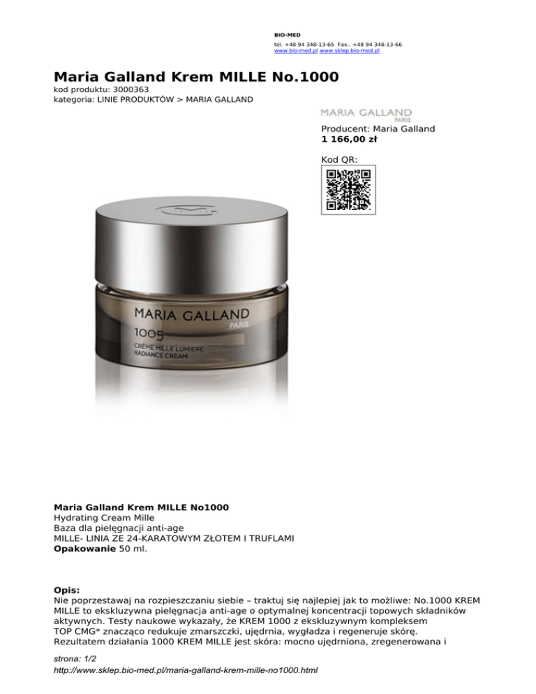 BIO-MED tel. +48 94 348-13-65 Fax.. +48 94 348-13-66 www.bio-med.pl www.sklep.bio-med.pl Maria Galland Krem MILLE No.1000 kod produktu: 3000363 kategoria: LINIE PRODUKTÓW > MARIA GALLAND Producent: Maria Galland 1 166,00 zł Kod QR: Maria Galland Krem MILLE No1000 Hydrating Cream Mille Baza dla pielęgnacji anti-age MILLE- LINIA ZE 24-KARATOWYM ZŁOTEM I TRUFLAMI Opakowanie 50 ml. Opis: Nie poprzestawaj na rozpieszczaniu siebie – traktuj się najlepiej jak to możliwe: No.1000 KREM MILLE to ekskluzywna pielęgnacja anti-age o optymalnej koncentracji topowych składników aktywnych. Testy naukowe wykazały, że KREM 1000 z ekskluzywnym kompleksem TOP CMG* znacząco redukuje zmarszczki, ujędrnia, wygładza i regeneruje skórę. Rezultatem działania 1000 KREM MILLE jest skóra: mocno ujędrniona, zregenerowana i strona: 1/2 http://www.sklep.bio-med.pl/maria-galland-krem-mille-no1000.html wygładzona. Jej gęstość jest przywrócona, jest nawilżona i odżywiona. Cera jest promienna. Cechy: - Ultra-komfortowa, migocząca, śnieżno biała tekstura. - Dla najbardziej wymagających skór powyżej 40 r.ż. Składniki aktywne: - Kompleks TOP CMG* - Nawilżanie, Rozświetlanie, Anti-age. - Ekstrakt roślinnych komórek macierzystych w liposomach - Zwiększanie witalności i żywotności komórek macierzystych skóry - spowolnienie starzenia się skóry. - Fitostymuliny** (izoflawony sojowe, ekstrakt soi.) - Zwiększanie syntezy włókien podporowych. - Kompleks cennych olejów z: pestek winogron, pestek moreli, babassu, makadamia Odżywienie, regeneracja - Kwas hialuronowy, Kompleks Urea - Nawilżanie, Ochrona funkcji barierowych skóry Sposób użycia: Stosować rano i wieczorem na skórę twarzy, szyi i dekoltu. Dla lepszych efektów stosować razem z serum no. 1010. *Kompleks TOP CMG - składa się z: trufli, 24-karatowego złota, odmładzających peptydów i aktywatora komórkowego. ** hormony roślinne, które wyrównują niekorzystne dla skóry oznaki niedoborów hormonalnych. strona: 2/2 http://www.sklep.bio-med.pl/maria-galland-krem-mille-no1000.html