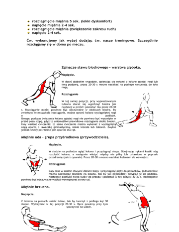 rozciągnięcie mięśnia 5 sek. (lekki dyskomfort) napięcie mięśnia 2-4 sek. rozciągnięcie mięśnia (zwiększenie zakresu ruch) napięcie 2-4 sek. Ćw. wykonujemy jak wyżej dodając ćw. nasze treningowe. Szczególnie rozciągamy się w domu po meczu. Zginacze stawu biodrowego - warstwa głęboka. Napięcie. W dosyć głębokim wypadzie, opierając się rękami o kolano zgiętej nogi lub inną podporę, przez 20-30 s mocno naciskać na podłogę wysuniętą do tyłu nogą. Rozciąganie W tej samej pozycji, przy wyprostowanym tułowiu starać się wypchnąć biodra jak najdalej w przód i pozostać tka przez 20-30 s. Rozciąganie mięśni powinno być odczuwalne w okolicach biodra. By zwiększyc intensywność rozciągania, można oprzeć kolano wyciągniętej nogi o podłoże. Uwaga: podczas ćwiczenia kolano zgiętej nogi nie powinno być wysunięte w przód poza stopę, gdyż to uniemożliwi prawidłowe rozciąganie okolic bioder. Inny wariant ćwiczenia: to samo ćwiczenie można wykonać z wyciągniętą nogą opartą o ławeczkę gimnastyczną, niskie krzesło lub taboret. Zwykle jednak wtedy potrzebne jest oparcie dla rąk. Mięśnie uda - grupa przyśrodkowa (przywodziciele). Napięcie. W siadzie na podłodze ugiąć kolana i przyciągnąć stopy. Obejmując rękami kostki nóg rozchylić kolana, a następnie włożyć między nie piłkę lub ustawione w poprzek przedramię (patrz rysunek). Przez 20-30 s mocno naciskać kolanami do wewnątrz. Rozciąganie Cały czas w siadzie chwycić dłońmi stopy i przyciągnąć pięty do pośladków, jednocześnie mocno naciskając łokciami na kolana, tak by jak najbardziej przygiąć je do podłoża. Następnie pochylić nieco tułów do przodu i pozostać w tej pozycji 20-30 s. Rozciąganie powinno być odczuwalne wzdłuż wewnętrznej strony ud. Mięśnie brzucha. Napięcie. Z leżenia na plecach unieść tułów, tak by tworzył z podłoga kąt 30 stopni. Wytrzymać w tej pozycji 20-30 s. Ręce powinny przy tym spoczywać na udach. Rozciąganie W staniu wygiąć się do tyłu, najlepiej opierając plecy o jakąś podporę ok. 10 cm nad linią pępka. Jeśli nie mamy podpory, należy oprzeć się o ścianę na wyciągniętych nad głową rękach i pozostać w tej pozycji 30 s. Mięśnie łydek. Napięcie. Trzymając ręce oparte na wysokości piersi o drążek, ścianę lub drzewo przesunąć jedną nogę do tyłu na odległości 60-70 cm od podpory. Opaść tułowiem nieco w przód i wyprostować cofniętą nogę aż odczuwalne będzie lekkie napięcie. Następnie 20-30 s mocno naciskać przednią częścią stopy na podłożę. Teraz unieść nogę wykroczną i jak najwyżej wspiąć się na palce nogi zakrocznej. Wytrzymać w tej pozycji 20-30 s. Wskazówka: oprzeć ręce niżej (niżej nawet niż pokazano na rysunku), ewentualnie użyć do oparcia ramion; pomaga to w rozluźnieniu ciała w trakcie rozciągania. Rozciąganie Przesunąć nogę jeszcze bardziej do tyłu, mocniej pochylając tułów i równocześnie przenosząc do przodu biodra. Czując rozciąganie mięśni łydki pozostać w tej pozycji 20-30 s. Mięśnie podudzia - grupa przednia. Napięcie. Zginać grzbietowo palce i stopy pokonując działający na nie opór (20-30 s). Inny wariant ćwiczenia: stojąc na piętach jak najmocniej naciskać palcami stóp w górę, pokonując opór drążka lub ciężkiego mebla. Rozciąganie Usiąść na pietach ( palce stóp obciągnięte) i pozostać w tej pozycji 20-30 s. By pogłębić rozciąganie, można odchylić tułów do tyłu. Wskazówka: ćwiczenie to można połączyć z napięciem mm. zginaczy stawu biodrowego i i prostowników kolana (ćwiczenie 20). Mięśnie uda i mięśnie biodrowo-lędźwiowe. Napięcie. W klęku, palce stóp obciągnięte, odchylić wyprostowany tułów do tyłu i pozostać tak przez 20-30 s aż w przedniej części uda odczuwalne będzie napięcie mięśni. Rozciąganie Odchylić tułów niżej, podpierając się z tyłu rękami. Biodra wypchnąć w przód. W przedniej części ud powinno być odczuwalne rozciąganie. Pozostać w tej pozycji 20-30 s. Mięśnie uda - grupa tylna. Napięcie. Klęcząc na jednym kolanie wyprostować drugą nogę w skos - w przód, opierając ją na pięcie. Przez 20-30 s mocno naciskać podłogę wyprostowaną nogą, w razie potrzeby podpierając się ręką. W tylnej części uda powinno być odczuwalne napięcie mięśni. Rozciąganie W tej samej pozycji, przy jak najbardziej wyprostowanych plecach, wykonać opad tułowia w przód. ręce mogą być splecione na plecach. Pozostać tak przez 20-30 s. W tylnej części uda powinno być odczuwalne rozciąganie mięśni. Mięśnie górnej części grzbietu i karku. Napięcie. W leżeniu tyłem ugiąć nogi, stopy oprzeć na podłożu. Spleść ręce na kakru, unieść nieco głowę i przez ok. 20 s mocno naciskać głową do tyłu, pokonując opór rąk. Rozciąganie W dalszym ciągu w leżeniu tyłem przy pomocy rak splecionych na karku przyciągnąć głowę do przodu aż w górnej części grzbietu odczuwalne będzie napięcie. Wytrzymać ok 20 s. Boczne mięśnie tułowia. Napięcie. Stanąć w rozkroku na szerokość barków bokiem do ściany, wyciągnąć w górę rękę i przez 10-15 s mocno naciskać na ścianę zewnętrzną stroną dłoni, ramienia i boczną stroną klatki piersiowej. Rozciąganie Stojąc w dalszym ciągu w rozkroku wolno wykonać skłon tułowia w bok, trzymając przy tym rękę od strony ściany nad głową, drugą położyć na biodrze. Wytrzymać tak 10-15 s. Uwaga: do pozycji wyjściowej powracać wolno i ostrożnie, nie wykonując żadnych ruchów do tyłu. Mięśnie prostowniki grzbietu - warstwa głęboka. Napięcie. Stanąć tyłem do ściany w pozycji lekko pochylonej do przodu, z zaokrąglonym grzbietem, nieco ugiętymi kolanami, opierając się o ścianę częścią lędźwiową kręgosłupa. Spleść ręce na karku i przez 20-30 s mocno naciskać plecami ścianę. Rozciągani