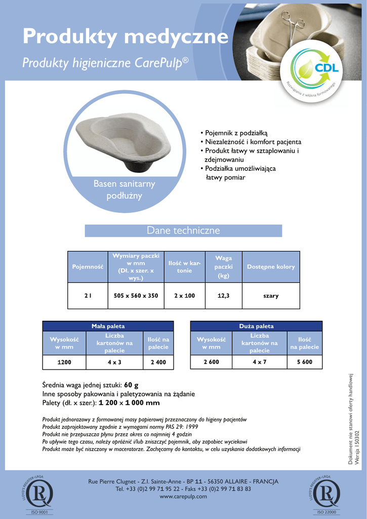 Produkty medyczne Produkty higieniczne CarePulp® • Pojemnik z podziałką • Niezależność i komfort pacjenta • Produkt łatwy w sztaplowaniu i zdejmowaniu • Podziałka umożliwiająca łatwy pomiar Basen sanitarny podłużny Dane techniczne Pojemność Wymiary paczki w mm (Dł. x szer. x wys.) Ilość w kartonie Waga paczki (kg) Dostępne kolory 2l 505 x 560 x 350 2 x 100 12,3 szary Duża paleta Wysokość w mm Liczba kartonów na palecie Ilość na palecie Wysokość w mm Liczba kartonów na palecie Ilość na palecie 1200 4x3 2 400 2 600 4x7 5 600 Średnia waga jednej sztuki: 60 g Inne sposoby pakowania i paletyzowania na żądanie Palety (dł. x szer.): 1 200 x 1 000 mm Produkt jednorazowy z formowanej masy papierowej przeznaczony do higieny pacjentów Produkt zaprojektowany zgodnie z wymogami normy PAS 29: 1999 Produkt nie przepuszcza płynu przez okres co najmniej 4 godzin Po upływie tego czasu, należy opróżnić i/lub zniszczyć pojemnik, aby zapobiec wyciekowi Produkt może być niszczony w maceratorze. Zachęcamy do kontaktu, w celu uzyskania dodatkowych informacji Rue Pierre Clugnet - Z.I. Sainte-Anne - BP 11 - 56350 ALLAIRE - FRANCJA Tel. +33 (0)2 99 71 95 22 - Faks +33 (0)2 99 71 83 83 www.carepulp.com Dokument nie stanowi oferty handlowej Wersja 150302 Mała paleta Produkty medyczne Produkty higieniczne CarePulp® • Zaprojektowane w taki sposób, aby można było łatwo wsunąć pod pacjenta. • Odpowiednie dla pacjentów wymagających opieki lub niepełnosprawnych. • Łatwe w użyciu przez personel, nie trzeba podnosić pacjenta. Basen sanitarny płaski średni Dane techniczne Pojemność Wymiary paczki w mm (dł. x szer. x wys.) Ilość w kartonie Waga paczki (kg) Dostępne kolory 1,5 l 510 x 605 x 350 2 x 100 11 szary Duża paleta Wysokość w mm Liczba kartonów na palecie Ilość na palecie Wysokość w mm Liczba kartonów na palecie Ilość na palecie 1200 4x3 2400 2600 4x7 5 600 Średnia waga jednej sztuki: 55 g Inne sposoby pakowania i paletyzowania na żądanie Palety (dł. x szer.): 1 200 x 1 000 mm Produkt jednorazowy z formowanej masy papierowej przeznaczony do higieny pacjentów Produkt zaprojektowany zgodnie z wymogami normy PAS 29: 1999 Produkt nie przepuszcza płynu przez okres co najmniej 4 godzin Po upływie tego czasu, należy opróżnić i/lub zniszczyć pojemnik, aby zapobiec wyciekowi Produkt może być niszczony w maceratorze. Zachęcamy do kontaktu, w celu uzyskania dodatkowych informacji Rue Pierre Clugnet - Z.I. Sainte-Anne - BP 11 - 56350 ALLAIRE - FRANCJA Tel. +33 (0)2 99 71 95 22 - Faks +33 (0)2 99 71 83 83 www.carepulp.com Dokument nie stanowi oferty handlowej Wersja 150302 Mała paleta Produkty medyczne Produkty higieniczne CarePulp® • Zaprojektowane w taki sposób, aby można było łatwo wsunąć pod pacjenta. • Odpowiednie dla pacjentów wymagających opieki lub niepełnosprawnych. • Łatwe w użyciu przez personel, nie trzeba podnosić pacjenta. Basen sanitarny płaski duży Dane techniczne Pojemność Wymiary paczki w mm (dł. x szer. x wys.) Ilość w kartonie Waga paczki (kg) Dostępne kolory 2l 505 x 580 x 380 2 x 100 13 szary Duża paleta Wysokość w mm Liczba kartonów na palecie Ilość na palecie Wysokość w mm Liczba kartonów na palecie Ilość na palecie 1290 4x3 2 400 2 8 10 4x7 1500 Średnia waga jednej sztuki: 65 g Inne sposoby pakowania i paletyzowania na żądanie Palety (dł. x szer.): 1 200 x 1 000 mm Produkt jednorazowy z formowanej masy papierowej przeznaczony do higieny pacjentów Produkt zaprojektowany zgodnie z wymogami normy PAS 29: 1999 Produkt nie przepuszcza płynu przez okres co najmniej 4 godzin Po upływie tego czasu, należy opróżnić i/lub zniszczyć pojemnik, aby zapobiec wyciekowi Produkt może być niszczony w maceratorze. Zachęcamy do kontaktu, w celu uzyskania dodatkowych informacji Rue Pierre Clugnet - Z.I. Sainte-Anne - BP 11 - 56350 ALLAIRE - FRANCJA Tel. +33 (0)2 99 71 95 22 - Faks +33 (0)2 99 71 83 83 www.carepulp.com Dokument nie stanowi oferty handlowej Wersja 150302 Mała paleta Produkty medyczne Produkty opieki piel gniarskiej CarePulp® • Pojemnik z podziałką • Produkt uniwersalny. • Zoptymalizowany kształt do przelewania płynów. • Produkt stabilny, wyposażony w twarde brzegi, nawet po osiągnięciu maksymalnego poziomu. Miska uniwersalna Dane techniczne Pojemność Wymiary paczki w mm (dł. x szer. x wys.) Ilość w kartonie Waga paczki (kg) Dostępne kolory 1l 505 x 595 x 200 3 x 85 8,2 szary Duża paleta Wysokość w mm Liczba kartonów na palecie Ilość na palecie Wysokość w mm Liczba kartonów na palecie Ilość na palecie 1350 4x6 6 120 2 750 4 x 13 13260 Średnia waga jednej sztuki: 32,2 g Inne sposoby pakowania i paletyzowania na żądanie Palety (dł. x szer.): 1 200 x 1 000 mm Produkt jednorazowy z formowanej masy papierowej przeznaczony do higieny pacjentów Produkt zaprojektowany zgodnie z wymogami normy PAS 29: 1999 Produkt nie przepuszcza płynu przez okres co najmniej 4 godzin Po upływie tego czasu, należy opróżnić i/lub zniszczyć pojemnik, aby zapobiec wyciekowi Produkt może być niszczony w maceratorze. Zachęcamy do kontaktu, w celu uzyskania dodatkowych informacji Rue Pierre Clugnet - Z.I. Sainte-Anne - BP 11 - 56350 ALLAIRE - FRANCJA Tel. +33 (0)2 99 71 95 22 - Faks +33 (0)2 99 71 83 83 www.carepulp.com Dokument nie stanowi oferty handlowej Wersja 150302 Mała paleta Produkty medyczne Produkty opieki piel gniarskiej CarePulp® • Lekki i solidny pojemnik uniwersalny, przeznaczony do odkładania zabrudzo nych opatrunków i wszelkich odpadów medycznych. • Ergonomiczny kształt umożliwiający postawienie pojemnika przy ciele pacjenta. Nerka sanitarna Dane techniczne Pojemność Wymiary paczki w mm (dł. x szer. x wys.) Ilość w kartonie Waga paczki (kg) Dostępne kolory 750 ml 590 x 400 x 265 320 7 szary Duża paleta Wysokość w mm Liczba kartonów na palecie Ilość na palecie Wysokość w mm Liczba kartonów na pale