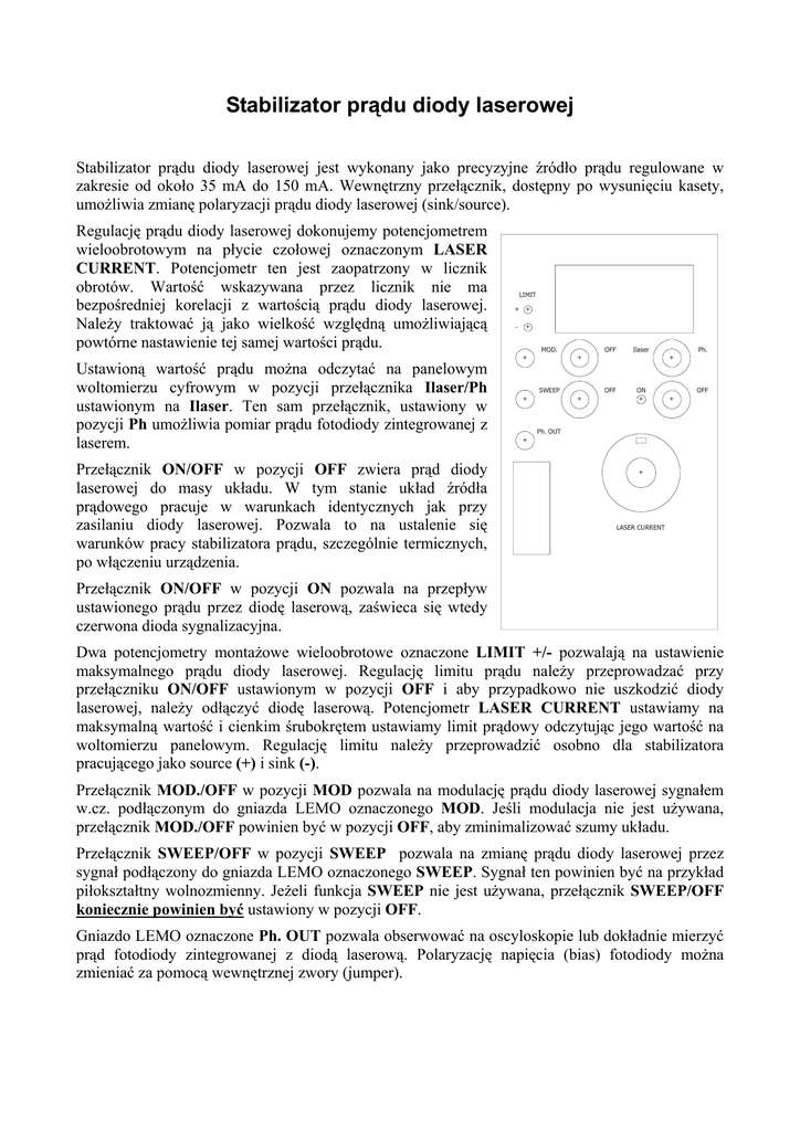 Stabilizator prądu diody laserowej Stabilizator prądu diody laserowej jest wykonany jako precyzyjne źródło prądu regulowane w zakresie od około 35 mA do 150 mA. Wewnętrzny przełącznik, dostępny po wysunięciu kasety, umożliwia zmianę polaryzacji prądu diody laserowej (sink/source). Regulację prądu diody laserowej dokonujemy potencjometrem wieloobrotowym na płycie czołowej oznaczonym LASER CURRENT. Potencjometr ten jest zaopatrzony w licznik obrotów. Wartość wskazywana przez licznik nie ma bezpośredniej korelacji z wartością prądu diody laserowej. Należy traktować ją jako wielkość względną umożliwiającą powtórne nastawienie tej samej wartości prądu. Ustawioną wartość prądu można odczytać na panelowym woltomierzu cyfrowym w pozycji przełącznika Ilaser/Ph ustawionym na Ilaser. Ten sam przełącznik, ustawiony w pozycji Ph umożliwia pomiar prądu fotodiody zintegrowanej z laserem. Przełącznik ON/OFF w pozycji OFF zwiera prąd diody laserowej do masy układu. W tym stanie układ źródła prądowego pracuje w warunkach identycznych jak przy zasilaniu diody laserowej. Pozwala to na ustalenie się warunków pracy stabilizatora prądu, szczególnie termicznych, po włączeniu urządzenia. LIMIT + + - + MOD. + + SWEEP + + OFF Ilaser OFF ON + + Ph. OFF + Ph. OUT + + LASER CURRENT Przełącznik ON/OFF w pozycji ON pozwala na przepływ ustawionego prądu przez diodę laserową, zaświeca się wtedy czerwona dioda sygnalizacyjna. Dwa potencjometry montażowe wieloobrotowe oznaczone LIMIT +/- pozwalają na ustawienie maksymalnego prądu diody laserowej. Regulację limitu prądu należy przeprowadzać przy przełączniku ON/OFF ustawionym w pozycji OFF i aby przypadkowo nie uszkodzić diody laserowej, należy odłączyć diodę laserową. Potencjometr LASER CURRENT ustawiamy na maksymalną wartość i cienkim śrubokrętem ustawiamy limit prądowy odczytując jego wartość na woltomierzu panelowym. Regulację limitu należy przeprowadzić osobno dla stabilizatora pracującego jako source (+) i sink (-). Przełącznik MOD./OFF w pozycji MOD pozwala na modulację prądu diody laserowej sygnałem w.cz. podłączonym do gniazda LEMO oznaczonego MOD. Jeśli modulacja nie jest używana, przełącznik MOD./OFF powinien być w pozycji OFF, aby zminimalizować szumy układu. Przełącznik SWEEP/OFF w pozycji SWEEP pozwala na zmianę prądu diody laserowej przez sygnał podłączony do gniazda LEMO oznaczonego SWEEP. Sygnał ten powinien być na przykład piłokształtny wolnozmienny. Jeżeli funkcja SWEEP nie jest używana, przełącznik SWEEP/OFF koniecznie powinien być ustawiony w pozycji OFF. Gniazdo LEMO oznaczone Ph. OUT pozwala obserwować na oscyloskopie lub dokładnie mierzyć prąd fotodiody zintegrowanej z diodą laserową. Polaryzację napięcia (bias) fotodiody można zmieniać za pomocą wewnętrznej zwory (jumper).