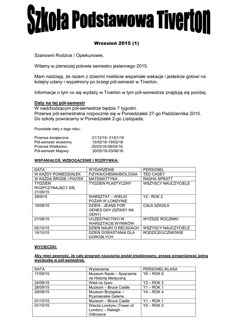 Wrzesień 2015 (1) Szanowni Rodzice / Opiekunowie, Witamy w pierwszej połowie semestru jesiennego 2015. Mam nadzieję, że razem z dziećmi mieliście wspaniałe wakacje i jesteście gotowi na kolejny udany i wypełniony po brzegi pół-semestr w Tiverton. Informacje o tym co się wydaży w Tiverton w tym pół-semestrze znajdują się poniżej. Daty na tej pół-semestr W nadchodzącym pół-semestrze będzie 7 tygodni. Przerwa pół-semestralna rozpocznie się w Poniedziałek 27-go Pażdziernika 2015. Do szkoły powracamy w Poniedziałek 2-go Listopada. Pozostałe daty z tego roku: Przerwa świąteczna Pół-semestr wiosenny Przerwa Wielkanoc Pół-semestr Majowy 21/12/15- 01/01/16 15/02/16-19/02/16 25/03/16-08/04/16 30/05/16-03/06/16 WSPANIAŁOŚ, WZBOGACENIE I ROZRYWKA: DATA W KAŻDY PONIEDZIAŁEK W KAŻDĄ ŚRODE I PIĄTEK TYDZIEŃ ROZPCZYNAJĄCY SIĘ 21/09/15 280915 19/09/15 21/09/15 02/10/15 16/10/15 WYDARZENIE FIZYKA/CHEMIA/BIOLOGIA MATEMATTYKA TYDZIEŃ PLASTYCZNY PERSONEL TED CASEY RADHA SPRATT WSZYSCY NAUCZYCIELE WARSZTAT – WIELKI POŻAR W LONDYNIE DZIEŃ - JEANS FOR GENES DAY (DŻINSY NA GENY) UCZESTNICTWO W WARSZTACIE WYNIKÓW DZIEŃ NAUKI O RELIGIACH DZIEŃ DORASTANIA DLA DOROSŁYCH Y2 - ROK 2 CAŁA SZKOŁA WYŻSZE ROCZNIKI WSZYSCY NAUCZYCIELE RODZICE/UCZNIOWIE WYCIECZKI: Aby mieć pewność, że cały program nauczania został zrealizowany, proszę zorganizować jedną wycieczkę w pół-semestrze. DATA 17/09/15 24/09/15 28/09/15 29/09/15 01/10/15 01/10/15 Wydarzenie Muzeum Nauki – Spojrzenie na Historię Medyczną Wieś na żywo Muzeum – Bruce Castle Muzeum Brytyjskie – Rzymianskie Galerie Muzeum – Bruce Castle Wierza Londynu (Tower of London) – Raleigh Odkrywca PERSONEL/KLASA Y6 – ROK 6 Y3 – ROK 3 Y1 – ROK 1 Y4 – ROK 4 Y1 – ROK 1 Y5 – ROK 5 Nowy wygląd Gazetki Szkolnej Dążymy do tego aby zmienić wydląd gazetki szkolnej. Jeżeli macie jakiekolwiek pomysły w jaki sposób chcielibyście aby gazetka wyglądała lub jakiego rodzaju informacje znajdują się w gazetce, prosimy o pozostawienie waszych opinii z panią Andrea Theophilou, która zarządz biurem szkolnym i będzie się zajmować tą sprawą. Attendance and punctuality Prosimy aby wszystkie dzieci przyszły do szkoły każdego dnia i na czas. W ten sposób będą one w stanie skorzystać z wspaniałego nauczania i innych wzbogacających zajęć, które oferuje nasza szkoła. Serdecznie dziękujemy wszystkim rodzicom oraz opiekunom za nie kończące się wsparcie. Jeżeli macie jakiekolwiek pytania, obawy lub sugestie proszę się ze mną skonkaktować. Dyrektor Szkoły Resham Mirza Strój Szkolny Przypomnienie o Recyklingu Prośimy pamiętać, że nadal zbieramy nastepujące rzeczy; Stare telefony komórkowe: W ten sposó wspieramy organizacje dla bezdomnych . Zużyte tusze do drukarek: Wysyłamy je do organizacji charytatywnej Starlight Kupony zakupowe z Tesco: Pomagają one nam w zakupie sprzętu sportowego dla szkoły Biała koszula/Koszulka Polo Granatowy sweter Szare spodnie /Spódnica /Sukienka fartuszek Czarne/Szare/Granatowe/Białe skarpetki /Rajstopy Czarne/Szare/Granatowe/Białe nakrycie głowy Strój na – W-F Granatowe/czarne spodenki Biała koszulka Granatowy/czarny dres Tenisówki