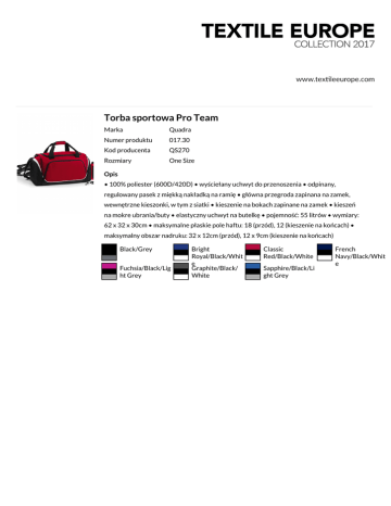Torba sportowa Pro Team Marka Quadra Numer produktu 017.30 Kod producenta QS270 Rozmiary One Size Opis • 100% poliester (600D/420D) • wyściełany uchwyt do przenoszenia • odpinany, regulowany pasek z miękką nakładką na ramię • główna przegroda zapinana na zamek, wewnętrzne kieszonki, w tym z siatki • kieszenie na bokach zapinane na zamek • kieszeń na mokre ubrania/buty • elastyczny uchwyt na butelkę • pojemność: 55 litrów • wymiary: 62 x 32 x 30cm • maksymalne płaskie pole haftu: 18 (przód), 12 (kieszenie na końcach) • maksymalny obszar nadruku: 32 x 12cm (przód), 12 x 9cm (kieszenie na końcach) Black/Grey Fuchsia/Black/Lig ht Grey Bright Royal/Black/Whit e Graphite/Black/ White Classic Red/Black/White Sapphire/Black/Li ght Grey French Navy/Black/Whit e