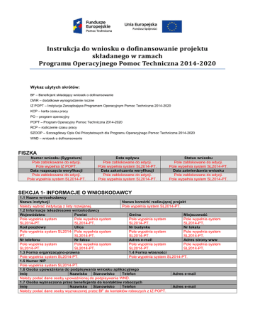 Instrukcja do wniosku o dofinansowanie projektu składanego w ramach Programu Operacyjnego Pomoc Techniczna 2014-2020 Wykaz użytych skrótów: BF – Beneficjent składający wniosek o dofinansowanie DWR – dodatkowe wynagrodzenie roczne IZ POPT – Instytucja Zarządzająca Programem Operacyjnym Pomoc Techniczna 2014-2020 KCP – karta czasu pracy PO – program operacyjny POPT – Program Operacyjny Pomoc Techniczna 2014-2020 RCP – rozliczenie czasu pracy SZOOP – Szczegółowy Opis Osi Priorytetowych dla Programu Operacyjnego Pomoc Techniczna 2014-2020 WND – wniosek o dofinansowanie FISZKA Numer wniosku (Sygnatura) Pole zablokowane do edycji. Pole wypełnia IZ POPT. Data rozpoczęcia weryfikacji Pole zablokowane do edycji. Pole wypełnia system SL2014-PT. Data wpływu Pole zablokowane do edycji. Pole wypełnia system SL2014-PT. Data zakończenia weryfikacji Pole zablokowane do edycji. Pole wypełnia system SL2014-PT. Status wniosku Pole zablokowane do edycji. Pole wypełnia system SL2014-PT. Data zatwierdzenia wniosku Pole zablokowane do edycji. Pole wypełnia system SL2014-PT. SEKCJA 1- INFORMACJE O WNIOSKODAWCY 1.1 Nazwa wnioskodawcy Nazwa instytucji Nazwa komórki realizującej projekt Należy wybrać instytucję z listy rozwijanej. Pole wypełnia system SL2014-PT. 1.2 Informacje teleadresowe wnioskodawcy Województwo Powiat Gmina Miejscowość Pole wypełnia system Pole wypełnia system Pole wypełnia system Pole wypełnia system SL2014-PT. SL2014-PT. SL2014-PT. SL2014-PT. Kod pocztowy Ulica Nr budynku Nr lokalu Pole wypełnia system SL2014- Pole wypełnia system Pole wypełnia system Pole wypełnia system PT. SL2014-PT. SL2014-PT. SL2014-PT. Nr telefonu Nr faksu Adres e-mail Adres strony www Pole wypełnia system Pole wypełnia system Pole wypełnia system Pole wypełnia system SL2014-PT. SL2014-PT. SL2014-PT. SL2014-PT. 1.3 Forma organizacyjno-prawna 1.4 Forma własności Pole wypełnia system SL2014-PT. Pole wypełnia system SL2014-PT. 1.5 Numer NIP Pole wypełnia system SL2014-PT. 1.6 Osoba upoważniona do podpisywania wniosku aplikacyjnego Imię Nazwisko Stanowisko Telefon Adres e-mail Należy podać dane osoby upoważnionej do podpisywania WND. 1.7 Osoba wyznaczona przez beneficjenta do kontaktów roboczych Imię Nazwisko Stanowisko Telefon Adres e-mail Należy podać dane osoby wyznaczonej przez BF do kontaktów roboczych z IZ POPT. SEKCJA 2 - INFORMACJE O PROJEKCIE 2.1 Program Operacyjny Pole wypełnia system SL2014-PT. 2.2 Oś priorytetowa 2.2.1 Numer 2.2.2 Nazwa Należy wybrać z numer osi priorytetowej w ramach której składany jest Pole wypełnia system SL2014-PT. WND. 2.3 Działanie 2.3.1 Numer 2.3.2 Nazwa Należy wybrać numer działania w ramach którego składany jest WND. Pole wypełnia system SL2014-PT. 2.4.Poddziałanie 2.4.1 Numer 2.4.2 Nazwa W ramach POPT 2014-2020 nie wyodrębniono poddziałań. Pole system SL2014-PT pozostawia niewypełnione. 2.5 Tytuł projektu Pole opisowe. Należy podać tytuł projektu określony przez BF. Tytuł powinien być unikalny i pozwolić na jednoznaczną identyfikację projektu. Powinien zawierać skrót instytucji będącej Beneficjentem oraz lata realizacji projektu. Jednocześnie należy unikać zbyt rozbudowanych tytułów. Przykładowe tytuły: Kadry w instytucji X w 2016 r. Wsparcie stanowisk pracy w instytucji X w 2016 r. Wsparcie funkcjonowania IP POY w instytucji X w latach 2016 -2017. 2.6.Cel oraz krótki opis projektu Pole opisowe. Pole ma ograniczenie wyłącznie do 2000 znaków. Należy wskazać główny cel projektu, który powinien być spójny z celami szczegółowymi określonymi w POPT oraz SZOOP dla osi priorytetowej oraz działania w ramach którego składany jest WND. Należy też krótko opisać zadania, które będą realizowane w ramach projektu. Nie należy bardzo szczegółowo opisywać zadań (np. podawać szczegółowych tematów szkoleń lub tematyki ekspertyzy albo badania ewaluacyjnego). Bardziej szczegółowy opis zadań (w tym kategorie wydatków) powinny zostać zawarte w Sekcji 5 w pkt.5.1 Plan rzeczowo-finansowy. Należy też zwrócić uwagę aby opis projektu był zgodny z Typami projektów opisanymi w SZOOP dla działania w ramach którego składany jest WND. 2.7 Planowany termin realizacji projektu 2.7.1 Planowana data rozpoczęcia realizacji 2.7.2 Planowana data zakończenia realizacji Należy wybrać datę z kalendarza. Należy wybrać datę z kalendarza. Co do zasady projekt powinien zaczynać się 1 stycznia danego Co do zasady projekt powinien kończyć się 31 grudnia roku budżetowego. danego roku budżetowego. Podana data nie może być wcześniejsza niż 1 stycznia 2014 r. W przypadku WND składanych w działaniu 1.1 gdy grudniowe pochodne płacone są w styczniu roku następnego datą końcową projektu może być 31 stycznia roku następnego. Podana data nie może być późniejsza niż 31 grudnia 2023r. Okres realizacji projektu powinien zawierać się w okresie wskazanym dla projektu w Wykazie Projektów Zidentyfikowanych stanowiącym Załącznik nr 5 do SZOOP. 2.8 Wartość projektu 2.8.1 Wartość ogółem 2.8.2 Wydatki kwalifikowalne Pole numeryczne. Pole numeryczne. Należy wskazać całkowitą wartość projektu, obejmującą wydatki Należy wpisać wartość wydatków kwalifikowanych. kwalifikowalne i niekwalifikowalne (jeżeli takie zostały w ramach Wydatki kwalifikowalne nie mogą być wyższe od wydatków projektu zidentyfikowane). Wydatki ogółem nie mogą być niższe ogółem. od wydatków kwalifikowalnych. Co do zasady wartość projektu powinna być zgodna z wartością środków zaplanowanych na realizację POPT w części budżetu państwa właściwej dla beneficjenta bądź zapewnionych z rezerwy celowej budżetu państwa. 2|S tr o na 2.8.3 % dofinansowania ze środków publicznych 2.8.5 % dofinansowania ze środków UE Pole procentowe. Pole numeryczne. Pole procentowe. Co do zasady projekt jest Jeżeli w pkt. 2.8.3 wpisano Co do zasady projekty dofi