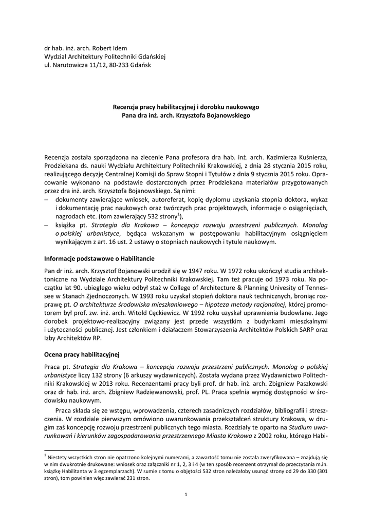 dr hab. inż. arch. Robert Idem Wydział Architektury Politechniki Gdańskiej ul. Narutowicza 11/12, 80-233 Gdańsk Recenzja pracy habilitacyjnej i dorobku naukowego Pana dra inż. arch. Krzysztofa Bojanowskiego Recenzja została sporządzona na zlecenie Pana profesora dra hab. inż. arch. Kazimierza Kuśnierza, Prodziekana ds. nauki Wydziału Architektury Politechniki Krakowskiej, z dnia 28 stycznia 2015 roku, realizującego decyzję Centralnej Komisji do Spraw Stopni i Tytułów z dnia 9 stycznia 2015 roku. Opracowanie wykonano na podstawie dostarczonych przez Prodziekana materiałów przygotowanych przez dra inż. arch. Krzysztofa Bojanowskiego. Są nimi: − dokumenty zawierające wniosek, autoreferat, kopię dyplomu uzyskania stopnia doktora, wykaz i dokumentację prac naukowych oraz twórczych prac projektowych, informacje o osiągnięciach, nagrodach etc. (tom zawierający 532 strony1), − książka pt. Strategia dla Krakowa – koncepcja rozwoju przestrzeni publicznych. Monolog o polskiej urbanistyce, będąca wskazanym w postępowaniu habilitacyjnym osiągnięciem wynikającym z art. 16 ust. 2 ustawy o stopniach naukowych i tytule naukowym. Informacje podstawowe o Habilitancie Pan dr inż. arch. Krzysztof Bojanowski urodził się w 1947 roku. W 1972 roku ukończył studia architektoniczne na Wydziale Architektury Politechniki Krakowskiej. Tam też pracuje od 1973 roku. Na początku lat 90. ubiegłego wieku odbył staż w College of Architecture & Planning Univesity of Tennessee w Stanach Zjednoczonych. W 1993 roku uzyskał stopień doktora nauk technicznych, broniąc rozprawę pt. O architekturze środowiska mieszkaniowego – hipoteza metody racjonalnej, której promotorem był prof. zw. inż. arch. Witold Cęckiewicz. W 1992 roku uzyskał uprawnienia budowlane. Jego dorobek projektowo-realizacyjny związany jest przede wszystkim z budynkami mieszkalnymi i użyteczności publicznej. Jest członkiem i działaczem Stowarzyszenia Architektów Polskich SARP oraz Izby Architektów RP. Ocena pracy habilitacyjnej Praca pt. Strategia dla Krakowa – koncepcja rozwoju przestrzeni publicznych. Monolog o polskiej urbanistyce liczy 132 strony (6 arkuszy wydawniczych). Została wydana przez Wydawnictwo Politechniki Krakowskiej w 2013 roku. Recenzentami pracy byli prof. dr hab. inż. arch. Zbigniew Paszkowski oraz dr hab. inż. arch. Zbigniew Radziewanowski, prof. PL. Praca spełnia wymóg dostępności w środowisku naukowym. Praca składa się ze wstępu, wprowadzenia, czterech zasadniczych rozdziałów, bibliografii i streszczenia. W rozdziale pierwszym omówiono uwarunkowania przekształceń struktury Krakowa, w drugim zaś koncepcję rozwoju przestrzeni publicznych tego miasta. Rozdziały te oparto na Studium uwarunkowań i kierunków zagospodarowania przestrzennego Miasta Krakowa z 2002 roku, którego Habi1 Niestety wszystkich stron nie opatrzono kolejnymi numerami, a zawartość tomu nie została zweryfikowana – znajdują się w nim dwukrotnie drukowane: wniosek oraz załączniki nr 1, 2, 3 i 4 (w ten sposób recenzent otrzymał do przeczytania m.in. książkę Habilitanta w 3 egzemplarzach). W sumie z tomu o objętości 532 stron należałoby usunąć strony od 29 do 330 (301 stron), tom powinien więc zawierać 231 stron. 1 litant był współautorem. W rozdziale trzecim, na przykładzie projektów autorskich, omówiono narzędzia i procedury związane z realizacją koncepcji rozwoju przestrzeni publicznych. Rozdział czwarty poświęcono komunikacji społecznej, tzn. relacjom stron uczestniczących w procesie projektowania urbanistycznego. Ten rozdział oparty został na doświadczeniu zawodowym Autora i jego działalności w SARP-ie. Ustawa daje możliwość wskazania jako osiągnięcia w postępowaniu habilitacyjnym m.in. dzieła opublikowanego w całości, cyklu publikacji powiązanych tematycznie lub zrealizowanego oryginalnego osiągnięcia projektowego. Habilitant słusznie wybrał ścieżkę pierwszą (jego inne publikacje trudno byłoby uznać za znaczący cykl, a Studium uwarunkowań i kierunków zagospodarowania przestrzennego Miasta Krakowa zaliczyć do zrealizowanych oryginalnych osiągnięć projektowych). Wybór ten skutkuje koniecznością sprostania wysokim wymaganiom stawianym rozprawom habilitacyjnym: sformułowania, analizy i próby rozwiązania nowego lub nierozstrzygniętego problemu naukowego przy pomocy metod badawczych oraz znacznego wkładu dzieła w rozwój dyscypliny naukowej. Kandydat przedstawił oczekiwane w habilitacji uogólnienie szerszego zakresu problemowego ─ jest to jednak uogólnienie dość subiektywne, oparte w przeważającym stopniu na doświadczeniu zawodowym, a nie pracy naukowo-badawczej. Ukazał nie tyle swoje osiągnięcia badawcze na szerokim tle, co raczej osiągnięcia zawodowe i kontekst naukowy (niejako równolegle). Przegląd literatury zawarty w pracy stanowi wątek niezależny od treści. Zasadniczym trzonem jego koncepcji jest Studium uwarunkowań i kierunków zagospodarowania przestrzennego Miasta Krakowa. Studium tego typu jest rutynowym opracowaniem wymaganym dla każdej gminy. Aby wyłonić z niego wartość naukowo-badawczą, potrzebne jest porównanie alternatyw i wyciągnięcie wniosków. Kolejna kwestia to wybór problematyki szczegółowej, czyli koncepcja rozwoju przestrzeni publicznych. Każde studium uwzględnia tę problematykę. Dopiero sposób rozwiązania tego zagadnienia i uznanie go za strategię może świadczyć o jego wartości. I znów, pod względem naukowym, wobec braku możliwości porównań, trudno ocenić przedstawioną propozycję. Podsumowując, w pracy nie przeprowadzono pogłębionego studium literaturowego czy komparatywnego studium przypadków, które pozwoliłyby przesądzić o istotnym wkładzie do nauki czy udziale w jej tworzeniu (np. poprzez stawianie nowych pytań, wyznaczanie nowych kierunków badawczych, gromadzenie i systematyzowanie wiedzy). Za teorie w architekturze i urbanisty