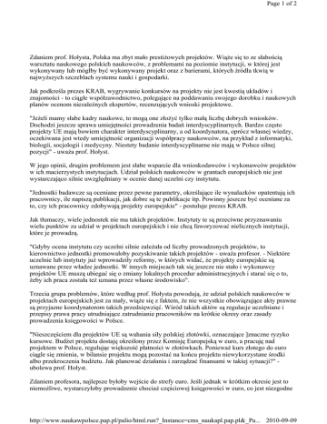Page 1 of 2 Zdaniem prof. Hołysta, Polska ma zbyt mało prestiżowych projektów. Wiąże się to ze słabością warsztatu naukowego polskich naukowców, z problemami na poziomie instytucji, w której jest wykonywany lub mógłby być wykonywany projekt oraz z barierami, których źródła tkwią w najwyższych szczeblach systemu nauki i gospodarki. Jak podkreśla prezes KRAB, wygrywanie konkursów na projekty nie jest kwestią układów i znajomości - to ciągłe współzawodnictwo, polegające na poddawaniu swojego dorobku i naukowych planów ocenom niezależnych ekspertów, recenzujących wnioski projektowe. "Jeżeli mamy słabe kadry naukowe, to mogą one złożyć tylko małą liczbę dobrych wniosków. Dochodzi jeszcze sprawa umiejętności prowadzenia badań interdyscyplinarnych. Bardzo często projekty UE mają bowiem charakter interdyscyplinarny, a od koordynatora, oprócz własnej wiedzy, oczekiwana jest wtedy umiejętność organizacji współpracy naukowców, na przykład z informatyki, biologii, socjologii i medycyny. Niestety badanie interdyscyplinarne nie mają w Polsce silnej pozycji" - uważa prof. Hołyst. W jego opinii, drugim problemem jest słabe wsparcie dla wnioskodawców i wykonawców projektów w ich macierzystych instytucjach. Udział polskich naukowców w grantach europejskich nie jest wystarczająco silnie uwzględniany w ocenie danej uczelni czy instytutu. "Jednostki badawcze są oceniane przez pewne parametry, określające ile wynalazków opatentują ich pracownicy, ile napiszą publikacji, jak dobre są te publikacje itp. Powinny jeszcze być oceniane za to, czy ich pracownicy zdobywają projekty europejskie" - postuluje prezes KRAB. Jak tłumaczy, wiele jednostek nie ma takich projektów. Instytuty te są przeciwne przyznawaniu wielu punktów za udział w projektach europejskich i nie chcą faworyzować nielicznych instytucji, które je prowadzą. "Gdyby ocena instytutu czy uczelni silnie zależała od liczby prowadzonych projektów, to kierownictwo jednostki promowałoby pozyskiwanie takich projektów - uważa profesor. - Niektóre uczelnie lub instytuty już wprowadziły reformy, w których widać, że projekty europejskie są uznawane przez władze jednostki. W innych miejscach tak się jeszcze nie stało i wykonawcy projektów UE muszą ubiegać się o zmiany lokalnych procedur administracyjnych i starać się o to, żeby ich praca została też uznana przez własne środowisko". Trzecia grupa problemów, które według prof. Hołysta powodują, że udział polskich naukowców w projektach europejskich jest za mały, wiąże się z faktem, że nie wszystkie obowiązujące akty prawne są przyjazne koordynatorom takich przedsięwzięć. Wśród takich aktów są regulacje uczelniane i przepisy prawa pracy utrudniające zatrudnianie pracowników na krótkie okresy oraz zasady prowadzenia księgowości w Polsce. "Nieszczęściem dla projektów UE są wahania siły polskiej złotówki, oznaczające ]znaczne ryzyko kursowe. Budżet projektu dostaję określony przez Komisję Europejską w euro, a pracuję nad projektem w Polsce, regulując większość płatności w złotówkach. Ponieważ kurs złotego do euro ciągle się zmienia, w bilansie projektu mogą pozostać na końcu projektu niewykorzystane środki albo przekroczenia budżetu. Jak planować działania i zarządzać finansami w takiej sytuacji?" ubolewa prof. Hołyst. Zdaniem profesora, najlepsze byłoby wejście do strefy euro. Jeśli jednak w krótkim okresie jest to niemożliwe, wystarczyłoby prowadzenie chociaż częściowej księgowości w euro, co jest niezgodne http://www.naukawpolsce.pap.pl/palio/html.run?_Instance=cms_naukapl.pap.pl&_Pa... 2010-09-09 Page 2 of 2 z polskimi przepisami. "Kolejną sprawą jest brak pieniędzy +na zapłon+. Naukowiec, który nie ma jeszcze projektu, powinien pojechać na 2-3 konferencje, gdzie są dyskutowane możliwe przyszłe projekty europejskie lub założenia konkursu. Tam mógłby porozumieć się z ewentualnymi partnerami. Nie zawsze takie środki rzędu kilku czy kilkunastu tysięcy złotych są w instytucie czy na wydziale. Przygotowanie projektu mogłaby wspomagać specjalistyczna firma konsultingowa. To jest znowu wydatek przynajmniej kilkunastu tysięcy" - wylicza doświadczony w prowadzeniu dwóch projektów koordynator. Zaznacza, że ministerstwo nauki i szkolnictwa wyższego dostrzegło już ten problem i ogłasza specjalne konkursy na tzw. Granty na granty, czyli fundusze na napisanie wniosku do UE. "Prawdopodobieństwo sukcesu to z reguły tylko kilka, rzadziej kilkanaście procent. Z porażką większości wniosków trzeba się więc liczyć, ale jeżeli nie będziemy ich składali, to z pewnością żadnego projektu nie otrzymamy do koordynacji" - uświadamia prof. Hołyst. Stowarzyszenie KRAB opiniowało założenia takich konkursów. Zdaniem koordynatorów, nie uwzględniają one specyfiki wszystkich problemów. Typowe negocjacje projektu wiążą się z podróżami i wymagają m.in. zatrudnienia na uczelni menedżera projektu, który przygotowuje porozumienia konsorcjum, sprawdza szczegóły budżetu, przesyła dokumenty. W tym okresie naukowiec nie może korzystać ani z budżetu projektu przydzielonego przez Brukselę (projekt jest na etapie negocjacji), ani też ze środków rządowych. Projekt "Granty na granty" nie pozwala bowiem beneficjentom finansować kosztów prowadzenia negocjacji, rozliczanie wydatków kończy się w momencie składania projektu. Sukces negocjacji może zależeć nie od jakości projektu, a od możliwości i dobrej woli dziekana wydziału. KOL PAP - Nauka w Polsce agt/ kap/ Opublikowano: Uwaga! Artykuł pochodzi z portalu internetowego Nauka w Polsce. http://www.naukawpolsce.pap.pl/palio/html.run?_Instance=cms_naukapl.pap.pl&_Pa... 2010-09-09
