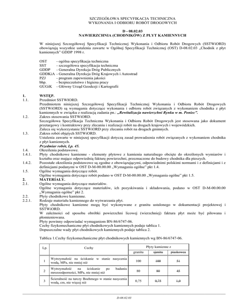 SZCZEGÓŁOWA SPECYFIKACJA TECHNICZNA WYKONANIA I ODBIORU ROBÓT DROGOWYCH D - 08.02.03 NAWIERZCHNIA (CHODNIKÓW) Z PŁYT KAMIENNYCH W niniejszej Szczegółowej Specyfikacji Technicznej Wykonania i Odbioru Robót Drogowych (SSTWiORD) obowiązują wszystkie ustalenia zawarte w Ogólnej Specyfikacji Technicznej (OST) D-08.02.03 „Chodnik z płyt kamiennych” GDDP 1998 r. OST SST GDDP GDDKiA PZJ bhp. GUGiK 1. 1.1. 1.2. 1.3. 1.4. 1.4.1. 1.4.2. 1.5. 2. 2.1. 2.2. 2.2.1. - ogólna specyfikacja techniczna - szczegółowa specyfikacja techniczna - Generalna Dyrekcja Dróg Publicznych - Generalna Dyrekcja Dróg Krajowych i Autostrad - program zapewnienia jakości - bezpieczeństwo i higiena pracy - Główny Urząd Geodezji i Kartografii WSTĘP. Przedmiot SSTWIORD. Przedmiotem niniejszej Szczegółowej Specyfikacji Technicznej Wykonania i Odbioru Robót Drogowych (SSTWiORD) są wymagania dotyczące wykonania i odbioru robót związanych z wykonaniem chodnika z płyt kamiennych w związku z realizacją zadania pn.: „Rewitalizacja nawierzchni Rynku w m. Poniec”. Zakres stosowania SSTWiORD. Szczegółowa Specyfikacja Techniczna Wykonania i Odbioru Robót Drogowych jest stosowana jako dokument przetargowy i kontraktowy przy zlecaniu i realizacji robót na drogach krajowych i wojewódzkich. Zaleca się wykorzystanie SSTWiORD przy zlecaniu robót na drogach gminnych. Zakres robót objętych SSTWiORD. Ustalenia zawarte w niniejszej specyfikacji dotyczą zasad prowadzenia robót związanych z wykonaniem chodnika z płyt kamiennych. Przedmiar robót, Lp. 45. Określenia podstawowe. Płyty chodnikowe kamienne - elementy płytowe z kamienia naturalnego obcięte do określonych wymiarów i kształtu oraz mające odpowiednią fakturę powierzchni, przeznaczone do budowy chodnika dla pieszych. Pozostałe określenia podstawowe są zgodne z obowiązującymi, odpowiednimi polskimi normami i z definicjami i z definicjami podanymi w OST D-M-00.00.00 „Wymagania ogólne” pkt 1.4. Ogólne wymagania dotyczące robót. Ogólne wymagania dotyczące robót podano w OST D-M-00.00.00 „Wymagania ogólne” pkt 1.5. MATERIAŁY. Ogólne wymagania dotyczące materiałów. Ogólne wymagania dotyczące materiałów, ich pozyskiwania i składowania, podano w OST D-M-00.00.00 „Wymagania ogólne” pkt 2. Płyty chodnikowe kamienne. Rodzaje materiału kamiennego do wytwarzania płyt. Płyty chodnikowe kamienne mogą być wykonywane z granitu ustalonego w dokumentacji projektowej i SSTWiORD. W zależności od sposobu obróbki powierzchni licowej (wierzchniej) faktura płyt może być piłowana i płomieniowana. Płyty powinny odpowiadać wymaganiom BN-86/6747-06. Cechy fizykomechaniczne płyt chodnikowych kamiennych podaje tablica 1. Dopuszczalne wady płyt chodnikowych kamiennych podaje tablica 2. Tablica 1.Cechy fizykomechaniczne płyt chodnikowych kamiennych wg BN-86/6747-06. Lp. Płyty kamienne z Cechy granitu sjenitu piaskowca 1 Wytrzymałość na ściskanie w stanie nasycenia wodą, MPa, nie mniej niż 100 100 51 2 Wytrzymałość na ściskanie po mrozoodporności, MPa, nie mniej niż 80 80 45 3 Ścieralność na tarczy Boehmego w stanie nasycenia wodą, cm, nie więcej niż 0,75 0,75 1,0 badaniu _____________________________________________________________________________________________________________________________________________________________ D-08.02.03 4 5 6 Nasiąkliwość wodą, %, nie więcej niż Odporność na zamrażanie, w cyklach, nie więcej niż 0,5 0,5 5,0 25 25 25 Odporność na niszczące działanie atmosfery przemysłowej w środowisku o zawartości SO2, w mg/m3 od 0,5 do 10 od 10 do 200 Tablica 2. Dopuszczalne wady płyt chodnikowych kamiennych wg BN-86/6747-06. Lp. Faktura płyty Nazwa wady łupana 2.2.2. 2.3. 2.4. 2.5. 3. 3.1. 3.2. 4. 4.1. 4.2. 1 Skrzywienie wichrowatość powierzchni licowej, mm 2 piłowana, groszkowana płomieniowana 3 1,5 2 Odchyłki kątowe powierzchni bocznych (stykowych), mm/m ±3 ±2 ±2 3 Dopuszczalne zmiany materiałowe wg BN-84/671603 p. 3.1 jak dla gatunków bloków z płyt surowych III III III 4 Występowanie rdzawych plam 5 Szczerby na krawędziach ograniczających powierzchnię licową - liczba na każde 100 cm długości krawędzi płyty z: a) granitu i sjenitu b) piaskowca - długość, mm, dla płyty z: a) granitu i sjenitu b) piaskowca - głębokość, mm, dla płyty z: a) granitu i sjenitu b) piaskowca dopuszcza się na powierzchni do 20% powierzchni płyty 4 5 6 8 3 4 Składowanie płyt. Płyty kamienne powinny być składowane na podłożu wyrównanym i odwodnionym. Płyty powinny być posegregowane według rodzajów, odmian, typów i wymiarów. Płyty prostokątne powinny być ustawione na jednym z dłuższych boków, powierzchniami obrobionymi do siebie. Płyty należy ustawiać na podkładkach drewnianych i zabezpieczyć krawędzie przed uszkodzeniem przekładkami. Piasek. Piasek na podsypkę i do wypełnienia spoin powinien odpowiadać wymaganiom PN-B-06712. Piasek do zaprawy cementowo-piaskowej powinien odpowiadać wymaganiom PN-B-06711. Cement. Cement do zaprawy cementowo-piaskowej powinien być cementem portlandzkim klasy „32,5” i odpowiadać wymaganiom PN-B-19701. Przechowywanie cementu powinno być zgodne z BN-88/6731-08. Woda. Woda powinna być odmiany „1” i odpowiadać wymaganiom PN-B-32250. SPRZĘT. Ogólne wymagania dotyczące sprzętu. Ogólne wymagania dotyczące sprzętu podano w OST D-M-00.00.00 „Wymagania ogólne” pkt.3. Sprzęt do wykonania chodnika. Wykonawca przystępujący do wykonania chodnika z kostki kamiennej powinien wykazać się możliwością korzystania z następującego sprzętu: − betoniarek do wytworzenia zapraw i podsypki cementowo-piaskowej, − wibratorów płytowych, ubijaków ręcznych lub mechanicznych, − drobnego sprzętu pomocniczego. TRANSPORT. Ogólne wymagania dotyczące transportu. Ogólne wymagania dotyczące transportu podano w OST D-M-00.00.00 „Wymagania ogólne” pkt 4. Transport pł