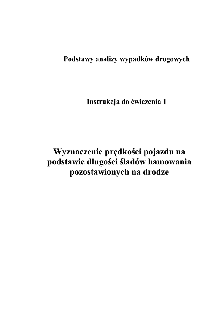 Podstawy analizy wypadków drogowych Instrukcja do ćwiczenia 1 Wyznaczenie prędkości pojazdu na podstawie długości śladów hamowania pozostawionych na drodze Spis treści 1. CEL ĆWICZENIA ................................................................................................................................ 3 2. WPROWADZENIE ............................................................................................................................... 3 2.1. Siły działające na pojazd podczas hamowania............................................................................ 3 2.2. Maksymalna siła hamowania ...................................................................................................... 4 2.3. Rekonstrukcja procesu hamowania ............................................................................................. 5 3. PRZEBIEG ĆWICZENIA ....................................................................................................................... 6 4. ZADANIA DO ROZWIĄZANIA .............................................................................................................. 6 5. WYTYCZNE DO SPRAWOZDANIA ....................................................................................................... 7 2 1. Cel ćwiczenia Celem ćwiczenia jest poznanie metod analitycznych wyznaczania prędkości poruszania się samochodu na podstawie śladów hamowania pozostawionych na jezdni. Przeprowadzenie próby hamowania samochodu osobowego i na podstawie pozostawionych śladów hamowania wyznaczenie prędkości początkowej samochodu. 2. Wprowadzenie Poruszający się pojazd ma znaczną energię kinetyczną (ruchu postępowego i obrotowego) mv 2 I k 2 Ek = + ω , 2 2 która zaleŜna jest od kwadratu prędkości jazdy samochodu. Podczas hamowania energię tę naleŜy przekształcić w pracę sił tarcia w hamulcach i ogumienia po jezdni. 2.1. Siły działające na pojazd podczas hamowania Podczas hamowania konieczne jest oddziaływanie na pojazd sił zewnętrznych, hamujących jego ruch. Na rysunku 1 pokazano główne siły działające na pojazd podczas hamowania na drodze poziomej. Wówczas siły hamowania FHi i siły oporu ruchu łącznie uczestniczą w zmniejszeniu prędkości samochodu. Cechą szczególną procesu hamowania jest oddziaływanie znacznych sił bezwładności. Rys.1. Siły hamowania na osiach kół pojazdu Z sumy rzutów sił na kierunek poziomy wynika FH 1 + FH 2 = FH = FB − FP − FT gdzie: FH1, FH2 - siły hamowania, FB – siła bezwładności, FP, FT – siła oporów ruchu (powietrza i toczenia). 3 Siła bezwładności obejmuje opór bezwładności ruchu postępowego (dotyczy całej masy pojazdu) oraz opór bezwładności elementów w ruchu obrotowym, np. koła jezdne i niektóre elementy układu napędowego związane z kołami. Zatem FB = δ ⋅ m ⋅ aH Analizując proces intensywnego hamowania zwykle pomija się siły oporów powietrza, toczenia oraz wzniesienia, jako siły o małych wartościach w porównaniu z siła hamowania. Wówczas siła hamowania FH = FH 1 + FH 2 ≈ FB Na poszczególnych kołach i osiach kół jezdnych siły hamowania są ograniczone wartością sił przyczepności, czyli FHi ≤ Fµ i gdzie: Fµ i = µ ⋅ Z i µ - siła przyczepności do podłoŜa dla i-tej osi. - współczynnik przyczepności do podłoŜa. Zi – reakcja podłoŜa na i-tą oś samochodu. 2.2. Maksymalna siła hamowania Przebieg procesu hamowania jest ściśle związany ze zjawiskami fizycznymi, które zachodzą na styku ogumienia z nawierzchnią jezdni. Wynika to przede wszystkim z faktu, Ŝe siły hamowania, jako zewnętrzne oddziaływanie na pojazd od drogi są zaleŜne od reakcji stycznych obwodowych na kaŜdym kole. Reakcje styczne są ograniczone przez przyczepności kół do podłoŜa. Stąd w dalszych rozwaŜaniach naleŜy mieć na uwadze, Ŝe dla kaŜdego koła FHk ,max = Fµk = µZ k lub ogólnie FH ≤ Fµ . Dla i-tej osi kół jezdnych FHi ,max = Fµi = µZ i FH 1,max + FH 2,max = Fµ1 + Fµ 2 = µ (Z1 + Z 2 ) . oraz dla samochodu dwuosiowego Sumując siły hamowania na osich kół, otrzymano wartość maksymalnej siły hamowania samochodu w najbardziej korzystnej sytuacji hamowania wszystkich kół pojazdu w takich samych warunkach i do osiągnięcia ich przyczepności na drodze poziomej FH 1,max + FH 2,max = FH ,max = µQ = µ ⋅ m ⋅ g . PoniewaŜ FH ,max FH ≈ FB , to = FB = δ ⋅ m ⋅ aH ,max Przyjmując w procesie hamowania Stąd δ = 1 , otrzymano µ ⋅ m ⋅ g = m ⋅ aH ,max . 4 aH ,max = µ ⋅ g Zatem największa wartość opóźnienia, jaką moŜna osiągnąć podczas hamowania, zaleŜy od wartości współczynnika przyczepności kół do nawierzchni. 2.3. Rekonstrukcja procesu hamowania Jednym z waŜniejszych celów procesu rekonstrukcji wypadku jest ustalenie prędkości jazdy samochodu (samochodów, pojazdów) przed wypadkiem drogowym. Podczas ustalania wartości tej prędkości moŜna wykorzystać rezultaty zapisane przez tachograf lub rejestrator danych wypadkowych UDS (Unfalldatenspreicher, Accident Data Recorder). W razie braku takich urządzeń, podstawę do obliczeń mogą stanowić ślady hamowania. Odtworzenie prędkości jazdy samochodu przed rozpoczęciem procesu hamowania jest moŜliwe na podstawie śladów pozostawionych przez samochód na jezdni. Zwykle proces hamowania moŜna podzielić na dwa etapy: — hamowanie bez blokowania kół jezdnych w czasie narastania siły hamowania do osiągnięcia wartości maksymalnej; — hamowanie z zablokowanymi kołami, które zwykle pozostawia wyraźne ślady startej gumy na jezdni. Wykorzystanie długości pomierzonych śladów hamowania moŜe praktycznie prowadzić tylko do oszacowania najmniejszej z moŜliwych wartości prędkości jazdy przed hamowaniem. Korzystając z zaleŜności podanych w p. 2.2, moŜna przeprowadzić następujące obliczenia: — wyznaczenie prędkości jazdy samochodu na początku śladów hamowani