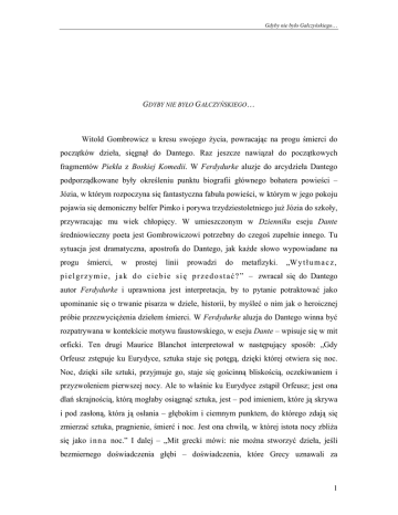 Gdyby nie było Gałczyńskiego… GDYBY NIE BYŁO GAŁCZYŃSKIEGO… Witold Gombrowicz u kresu swojego życia, powracając na progu śmierci do początków dzieła, sięgnął do Dantego. Raz jeszcze nawiązał do początkowych fragmentów Piekła z Boskiej Komedii. W Ferdydurke aluzje do arcydzieła Dantego podporządkowane były określeniu punktu biografii głównego bohatera powieści – Józia, w którym rozpoczyna się fantastyczna fabuła powieści, w którym w jego pokoju pojawia się demoniczny belfer Pimko i porywa trzydziestoletniego już Józia do szkoły, przywracając mu wiek chłopięcy. W umieszczonym w Dzienniku eseju Dante średniowieczny poeta jest Gombrowiczowi potrzebny do czegoś zupełnie innego. Tu sytuacja jest dramatyczna, apostrofa do Dantego, jak każde słowo wypowiadane na progu śmierci, w prostej linii prowadzi do metafizyki. „W y t ł u m a c z , p i e l g r z y m i e , j a k d o c i e b i e s i ę p r z e d o s t a ć ? ” – zwracał się do Dantego autor Ferdydurke i uprawniona jest interpretacja, by to pytanie potraktować jako upominanie się o trwanie pisarza w dziele, historii, by myśleć o nim jak o heroicznej próbie przezwyciężenia dziełem śmierci. W Ferdydurke aluzja do Dantego winna być rozpatrywana w kontekście motywu faustowskiego, w eseju Dante – wpisuje się w mit orficki. Ten drugi Maurice Blanchot interpretował w następujący sposób: „Gdy Orfeusz zstępuje ku Eurydyce, sztuka staje się potęgą, dzięki której otwiera się noc. Noc, dzięki sile sztuki, przyjmuje go, staje się gościnną bliskością, oczekiwaniem i przyzwoleniem pierwszej nocy. Ale to właśnie ku Eurydyce zstąpił Orfeusz; jest ona dlań skrajnością, którą mogłaby osiągnąć sztuka, jest – pod imieniem, które ją skrywa i pod zasłoną, która ją osłania – głębokim i ciemnym punktem, do którego zdają się zmierzać sztuka, pragnienie, śmierć i noc. Jest ona chwilą, w której istota nocy zbliża się jako i n n a noc.” I dalej – „Mit grecki mówi: nie można stworzyć dzieła, jeśli bezmiernego doświadczenia głębi – doświadczenia, które Grecy uznawali za 1 Gdyby nie było Gałczyńskiego… konieczne dla dzieła, doświadczenia, w którym dzieło staje się odporne na brak miary – nie szuka się dla niego samego. Głębia nie ukazuje się wprost, objawia się jedynie kryjąc się w dziele. Bezlitosna i rozstrzygająca odpowiedź. Mit pokazuje jednak także i to, że przeznaczeniem Orfeusza nie jest podporządkowanie się temu prawu: Orfeusz, odwracając się do Eurydyki, niweczy dzieło, dzieło natychmiast obraca się w nicość a Eurydyka powraca w mrok; istota nocy, pod jego spojrzeniem, ukazuje swoją nieistotność. Tak oto zdradza on dzieło, Eurydykę i noc.”1 Gombrowicz zaś mówi tak: „Czym ma być dla mnie przeszłość rodzaju ludzkiego? Spoczywam na olbrzymiej górze trupów – to ci, co już przeminęli. Na czym tedy spoczywam? Co to jest, ta miazga pode mną, to mrowie istnień wykończonych poza mną? Czy w przeszłości szukać mam ludzi, czy też tylko pewnej oderwanej dialektyki rozwoju? Co od razu rzuca się w oczy: z przeszłości przedostają się do mnie najważniejsi ludzie. Trzeba, w Historii, stać się, by zostać… Wszystkie cmentarze starożytnej Grecji streszczają się do kilkuset osób, jak Aleksander, Solon, Perykles… A z Florencji średniowiecznej iluż pozostało, prócz Danta? W wielkiej defiladzie wszystkich zmarłych świata nie rozpoznałbym nikogo, prócz Wielkich. Lubię arytmetykę, ona ustawia mnie jakoś wobec zagadnień. Ilu ludzi wymiera dziennie? Dwieście, trzysta tysięcy? Codziennie armia cała, ze dwadzieścia dywizji, idzie do grobu. Nie znam, nie wiem, nie jestem au courant… nic… nic… wszystko poza mną. (…) Śmierć jest powszechna, niewyraźna, zamazująca. Ale ja? Ja w tych warunkach? Ja z moimi koniecznościami, z koniecznościami mego ja? Im mniej mogę rozróżnić w tych tłumach cmentarnych, tym bardziej czepiam się Wielkich. Tych znam osobiście. Historia, to oni. Żadne panopticum z okruchów mi ich nie zastąpi. Czy jednak mój stosunek do nich jest dostatecznie osobisty?”2 Jako, że wiele Konstantego Ildefonsa Gałczyńskiego z Gombrowiczem łączy, szczególnie na płaszczyźnie szeroko rozumianego autorskiego podmiotu i – inaczej – podmiotowości, spróbuję tu jakby w imieniu autora Niobe zadać podobne pytanie, 1 M. B l a n c h o t : Spojrzenie Orfeusza. Przeł. M. P. M a r k o w s k i . „Literatura na świecie” nr 10(303)/1996, s. 36-37. 2 W. G o m b r o w i c z : Dziennik 1961-1966. Dzieła tom IX. Red. J. B ł o ń s k i , Kraków 1986, s. 234-235. 2 Gdyby nie było Gałczyńskiego… jakie w Dantem stawiał Gombrowicz. Co do takiego zabiegu uprawnia? Z całą pewnością nie „ranga” pisarstwa obu, choć tak naprawdę – czy w przestrzeni cywilizacji oraz humanistyki „ponowoczesnej” i „poststrukturalnej” potrafimy jeszcze konstruować wiarygodne i obiektywne aksjologie? Na przykład czy hierarchia wartości „literackich”, nawet jeśli jest jeszcze możliwa, to czy jest wiarygodna? Wątpię. Gombrowicz to w Dantem dostrzegał – ten esej to nie tylko heroiczne pytanie o trwanie autorskiego „ja” w dziele i historii, to jest też tekst napisany przeciwko Michelowi Foucaultowi… Gałczyński koncepcji autora Słów i rzeczy nie znał, znać nie mógł radykalizmu postawionego przez niego pytania „kim jest autor?”3 Ale droga, jaką konsekwentnie w swojej twórczości szedł – kreowania własnej legendy, „rozmnażania” podmiotu autorskiego, konstruowania „podmiotu sylleptycznego”4, autoironii lirycznego „ja” (i ironii w stosunku do „Konstantego Ildefonsa Gałczyńskiego – poety” – „Koń też by pisał wiersze…”5) oraz budowania ram tekstualnych, w których aż roi się od – by sparafrazować podtytuł Końca świata – „wizji świętego Ildefonsa” – stanowi 