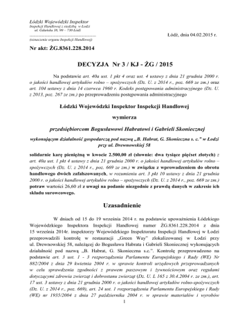 Łódzki Wojewódzki Inspektor Inspekcji Handlowej z siedzibą w Łodzi ul. Gdańska 38, 90 – 730 Łódź Łódź, dnia 04.02.2015 r. ..................................................... (oznaczenie organu Inspekcji Handlowej) Nr akt: ŻG.8361.228.2014 DECYZJA Nr 3 / KJ - ŻG / 2015 Na podstawie art. 40a ust. 1 pkt 4 oraz ust. 4 ustawy z dnia 21 grudnia 2000 r. o jakości handlowej artykułów rolno – spożywczych (Dz. U. z 2014 r., poz. 669 ze zm.) oraz art. 104 ustawy z dnia 14 czerwca 1960 r. Kodeks postępowania administracyjnego (Dz. U. z 2013, poz. 267 ze zm.) po przeprowadzeniu postępowania administracyjnego Łódzki Wojewódzki Inspektor Inspekcji Handlowej wymierza przedsiębiorcom Bogusławowi Habratowi i Gabrieli Skoniecznej wykonującym działalność gospodarczą pod nazwą „B. Habrat, G. Skonieczna s. c.” w Łodzi przy ul. Drewnowskiej 58 solidarnie karę pieniężną w kwocie 2.500,00 zł (słownie: dwa tysiące pięćset złotych) z art. 40a ust. 1 pkt 4 ustawy z dnia 21 grudnia 2000 r. o jakości handlowej artykułów rolno – spożywczych (Dz. U. z 2014 r., poz. 669 ze zm.) w związku z wprowadzeniem do obrotu handlowego dwóch zafałszowanych, w rozumieniu art. 3 pkt 10 ustawy z dnia 21 grudnia 2000 r. o jakości handlowej artykułów rolno – spożywczych (Dz. U. z 2014 r., poz. 669 ze zm.) potraw wartości 26,60 zł z uwagi na podanie niezgodnie z prawdą danych w zakresie ich składu surowcowego. Uzasadnienie W dniach od 15 do 19 września 2014 r. na podstawie upoważnienia Łódzkiego Wojewódzkiego Inspektora Inspekcji Handlowej numer ŻG.8361.228.2014 z dnia 15 września 2014r. inspektorzy Wojewódzkiego Inspektoratu Inspekcji Handlowej w Łodzi przeprowadzili kontrolę w restauracji „Green Way” zlokalizowanej w Łodzi przy ul. Drewnowskiej 58, należącej do Bogusława Habrata i Gabrieli Skoniecznej wykonujących działalność pod nazwą „B. Habrat, G. Skonieczna s.c.”. Kontrolę przeprowadzono na podstawie art. 3 ust. 1 - 3 rozporządzenia Parlamentu Europejskiego i Rady (WE) Nr 882/2004 z dnia 29 kwietnia 2004 r. w sprawie kontroli urzędowych przeprowadzanych w celu sprawdzenia zgodności z prawem paszowym i żywnościowym oraz regułami dotyczącymi zdrowia zwierząt i dobrostanu zwierząt (Dz. U. L 165 z 30.4.2004 r. ze zm.), art. 17 ust. 3 ustawy z dnia 21 grudnia 2000 r. o jakości handlowej artykułów rolno-spożywczych (Dz. U. z 2014 r., poz. 669), art. 24 ust. 1 rozporządzenia Parlamentu Europejskiego i Rady (WE) nr 1935/2004 z dnia 27 października 2004 r. w sprawie materiałów i wyrobów 1 przeznaczonych do kontaktu z żywnością oraz uchylającego dyrektywy 80/590/EWG (Dz. U. z 27.10.2004 s. 4 ze zm.) w związku z art. 3 ust. 1 pkt 6 oraz art. 3 ust. 1 pkt 1, 2 ustawy z dnia 15 grudnia 2000 r. o Inspekcji Handlowej (Dz. U. z 2014, poz. 148) w obecności osoby upoważnionej (…) oraz wspólnika Gabrieli Skoniecznej. Celem sprawdzenia prawidłowości oznakowania wyrobów gastronomicznych oraz rzetelności przekazywanych informacji o danych produktach, inspektorzy występując w charakterze nabywców zakupili potrawy deklarowane w miejscu sprzedaży (karta menu, umieszczona przy wejściu) jako „pulpety greckie (pulpety z ziemniaków i sera feta w sosie ziołowym) z kaszą gryczaną i kapustą zasmażaną” w cenie 12,50 zł oraz „spaghetti (makaron pełnoziarnisty z sosem pomidorowo – sojowym z dodatkiem bazylii i parmezanu) z zestawem surówek (surówka z marchwi, surówka z czerwoną kapustą, surówka z kalafiora)” w cenie 14,10 zł wartości łącznej 26,60 zł. Przedmiotowe potrawy zostały przygotowane na zamówienie w dniu 15 września 2014 r. w restauracji „Green Way” zlokalizowanej w Łodzi przy ul. Drewnowskiej 58, należącej do Bogusława Habrata i Gabrieli Skoniecznej wykonujących działalność pod nazwą „B. Habrat, G. Skonieczna s.c.”. W trakcie kontroli stwierdzono, że na stanie restauracji nie było sera feta oraz sera parmezan, znajdował się natomiast ser sałatkowo-kanapkowy półtłusty „Favita” wyprodukowany przez Spółdzielnię Mleczarską „Mlekovita”, ul. Ludowa 122, 18-200 Wysokie Mazowieckie oraz ser dojrzewający, podpuszczkowy, twardy, tarty pakowany przez „TMT” Sp. z o.o., ul. Wojska Polskiego 161, 18-402 Łomża. Sprawdzenie zgodności rzeczywistego składu surowcowego zakupionych potraw z deklaracją zawartą w karcie menu dostępnej w placówce, wykazało że do ich przygotowania użyto sera sałatkowo-kanapkowego „Favita”, a nie deklarowanego sera feta oraz sera twardego, tartego, a nie deklarowanego sera parmezan. O stosowaniu innych surowców niż podano w oznakowaniu inspektorzy nie zostali poinformowani. Ustaleń dotyczących składu potraw dokonano na podstawie okazanych receptur, oświadczenia osoby upoważnionej … (pismo z dnia 16.09.2014 r.), wyjaśnienia wspólnika Gabrieli Skoniecznej (pismo z dnia 18.09.2014 r.), a także dokumentów potwierdzających zakup surowców i półproduktów wykorzystywanych do przygotowania potraw. Na podstawie okazanych dokumentów (faktura VAT numer 0/0(003)0049/244056 (049-463353) wystawiona przez hurtownię należącą do „Makro Cash and Carry Polska” S.A. zlokalizowaną w Łodzi przy ul. Kasprzaka 8) ustalono, że ostatniego zakupu sera sałatkowo-kanapkowego „Favita” strony dokonały w ilości 6 sztuk, zaś sera twardego tartego w ilości jednego opakowania o masie 600g w dniu 01 września 2014 r. W przedmiotowej fakturze ser twardy tarty został wykazany pod nazwą „Spaghettino ser twardy 600G”. Strony nie przedłożyły żadnych dokumentów świadczących o zakupie serów feta i parmezan. W trakcie kontroli wspólnik Gabriela Skonieczna wyjaśniła (pismo z dnia 18.09.2014 r.), że restauracja „Green Way” należy do ogólnopolskiej sieci franczyzowej, działającej według ujednoliconych zasad, w których receptury i dostawcy surowców są ściśle 2 określone. Receptury według których są 