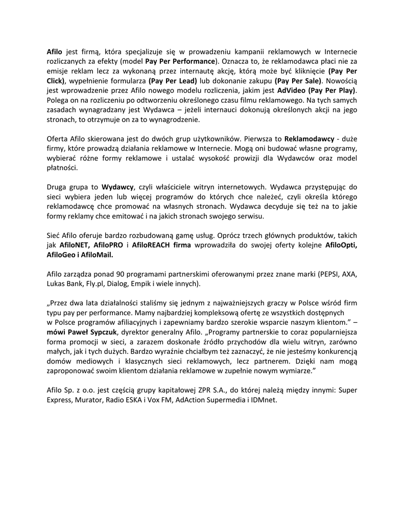 Afilo jest firmą, która specjalizuje się w prowadzeniu kampanii reklamowych w Internecie rozliczanych za efekty (model Pay Per Performance). Oznacza to, że reklamodawca płaci nie za emisje reklam lecz za wykonaną przez internautę akcję, którą może byd kliknięcie (Pay Per Click), wypełnienie formularza (Pay Per Lead) lub dokonanie zakupu (Pay Per Sale). Nowością jest wprowadzenie przez Afilo nowego modelu rozliczenia, jakim jest AdVideo (Pay Per Play). Polega on na rozliczeniu po odtworzeniu określonego czasu filmu reklamowego. Na tych samych zasadach wynagradzany jest Wydawca – jeżeli internauci dokonują określonych akcji na jego stronach, to otrzymuje on za to wynagrodzenie. Oferta Afilo skierowana jest do dwóch grup użytkowników. Pierwsza to Reklamodawcy - duże firmy, które prowadzą działania reklamowe w Internecie. Mogą oni budowad własne programy, wybierad różne formy reklamowe i ustalad wysokośd prowizji dla Wydawców oraz model płatności. Druga grupa to Wydawcy, czyli właściciele witryn internetowych. Wydawca przystępując do sieci wybiera jeden lub więcej programów do których chce należed, czyli określa którego reklamodawcę chce promowad na własnych stronach. Wydawca decyduje się też na to jakie formy reklamy chce emitowad i na jakich stronach swojego serwisu. Sied Afilo oferuje bardzo rozbudowaną gamę usług. Oprócz trzech głównych produktów, takich jak AfiloNET, AfiloPRO i AfiloREACH firma wprowadziła do swojej oferty kolejne AfiloOpti, AfiloGeo i AfiloMail. Afilo zarządza ponad 90 programami partnerskimi oferowanymi przez znane marki (PEPSI, AXA, Lukas Bank, Fly.pl, Dialog, Empik i wiele innych). „Przez dwa lata działalności staliśmy się jednym z najważniejszych graczy w Polsce wśród firm typu pay per performance. Mamy najbardziej kompleksową ofertę ze wszystkich dostępnych w Polsce programów afiliacyjnych i zapewniamy bardzo szerokie wsparcie naszym klientom.” – mówi Paweł Sypczuk, dyrektor generalny Afilo. „Programy partnerskie to coraz popularniejsza forma promocji w sieci, a zarazem doskonałe źródło przychodów dla wielu witryn, zarówno małych, jak i tych dużych. Bardzo wyraźnie chciałbym też zaznaczyd, że nie jesteśmy konkurencją domów mediowych i klasycznych sieci reklamowych, lecz partnerem. Dzięki nam mogą zaproponowad swoim klientom działania reklamowe w zupełnie nowym wymiarze.” Afilo Sp. z o.o. jest częścią grupy kapitałowej ZPR S.A., do której należą między innymi: Super Express, Murator, Radio ESKA i Vox FM, AdAction Supermedia i IDMnet.
