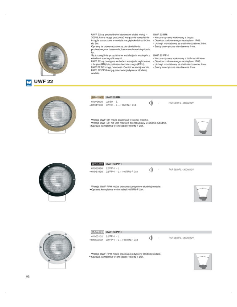 UWF 22 sć podwodnymi oprawami duŧej mocy – 300W, które mogć pracowaþ wyãćcznie kompletnie i cićgle zanurzone w wodzie na gãĕbokoŋci od 0,3m do 5m. Oprawy te przeznaczone sć do oŋwietlenia podwodnego w basenach, fontannach wodotryskach itp. Sć szczególnie przydatne w instalacjach wodnych z efektami scenograficznymi. UWF 22 sć dostĕpne w dwóch wersjach: wykonane z brćzu (BR) lub polimeru technicznego (PPH). UWF 22 BR mogć pracowaþ równieŧ w sãonej wodzie. UWF 22 PPH mogć pracowaþ jedynie w sãodkiej wodzie. UWF 22 BR: - Korpus oprawy wykonany z brćzu. - Dãawica z niklowanego mosićdzu - IP68. - Uchwyt montaŧowy ze stali nierdzewnej Inox. - Ŋruby zewnĕtrzne nierdzewne Inox. UWF 22 PPH: - Korpus oprawy wykonany z technopolimeru. - Dãawica z niklowanego mosićdzu - IP68. - Uchwyt montaŧowy ze stali nierdzewnej Inox. - Ŋruby zewnĕtrzne nierdzewne Inox. UWF 22 40 BRONZE 01979998 • 01941998 UWF 22/BR 22/BR - L 22/BR - L + H07RN-F 2x4 - PAR 56/WFL - 300W/12V Wersja UWF BR moŧe pracowaþ w sãonej wodzie. Wersja UWF BR nie jest moŧliwa do zabudowy w ŋcianie lub dnie. • Oprawa kompletna w 4m kabel H07RN-F 2x4. 80 RAL 9005 01980998 • 01981998 40° UWF 22/PPH 22/PPH - L 22/PPH - L + H07RN-F 2x4 - PAR 56/WFL - 300W/12V Wersja UWF PPH moŧe pracowaþ jedynie w sãodkiej wodzie. • Oprawa kompletna w 4m kabel H07RN-F 2x4. 85 RAL 9010 01003102 • 01003202 40° UWF 22/PPH 22/PPH - L 22/PPH - L + H07RN-F 2x4 - PAR 56/WFL - 300W/12V Wersja UWF PPH moŧe pracowaþ jedynie w sãodkiej wodzie. • Oprawa kompletna w 4m kabel H07RN-F 2x4. 82 40° IK 08 0,5 J 0,5m 80 RAL 9005 CLASS III III 85 RAL 9010 IP 68 40 BRONZE Max 5,5Kg HMG 5m NO PG 16 Ø10÷Ø14 Max 5 m Min 0.3 m 255 235 OK 180 Min 0.3 m UWF22 / PPH - R 153 Max 2 m UWF22 / PPH 220 125 Ø320 UWF22 / BR UWF 22 300W H07RN-F 2x4 ARCHITEKTONICZNE 85 RAL 9010 UWF 22/PPH-Recessed PAR 56/WFL - 300W/12V NO OK 40° Oprawa UWF 22/PPH Recessed skãada siĕ z oprawy UWF 22/PPH ( IP68 ), 4. metrów kabla H07RN-F 2x4 mm2 oraz z puszki z technopolimeru do montaŧu w ŋcianie. Wersje PPH nadajć siĕ wyãćcznie do montaŧu w sãodkiej wodzie. - Max 2 m 22/PPH - R 85 + H07RN-F 2x4 Min 0.3 m 03003585 AKCESORIA A0132 A0236 A0130 A0129 Ø170 14000799 14417998 14451998 14410998 14411998 14412998 14422018 14413998 14018420 A0156 A0132/BR A0133/PPH A0130/T1 A0130/T2 A0130/T3 A0129 A0128 A0236 165 4XØ10 180 n°6 Ø9 40 310 245 Ø300 A0128 73÷87 A0156 Ø6÷Ø10 Ø25 90 4xØ5,8 Uchwyt ze stali nierdzewnej Inox AISI 304 , umoŧliwiajćcy montaŧ opraw UWF 22 na róŧnych wysokoŋciach. Komplet: ťródão ŋwiatãa plus uszczelka. Kaŧdorazowo konieczna jest wymiana uszczelki przy wymianie ťródãa ŋwiatãa. Obudowa w klasie I – IP 65 (nie do zanurzenia), z 1,2 lub 3 transformatorami o mocach 300VA 220/12V do zasilenia max 3 szt opraw UWF 22. Puszka do poãćczeĸ instalacji w klasie II – IP67, do montaŧu w ŋcianie lub ziemi (nie do zanurzenia). Transformator bezpieczeĸstwa 1x330VA 240/12V. Nie nadaje siĕ do montaŧu w A0126. Kabel specjalny gumowy H07RN-F 2x4 mm2 do zamówienia w metrach. 83