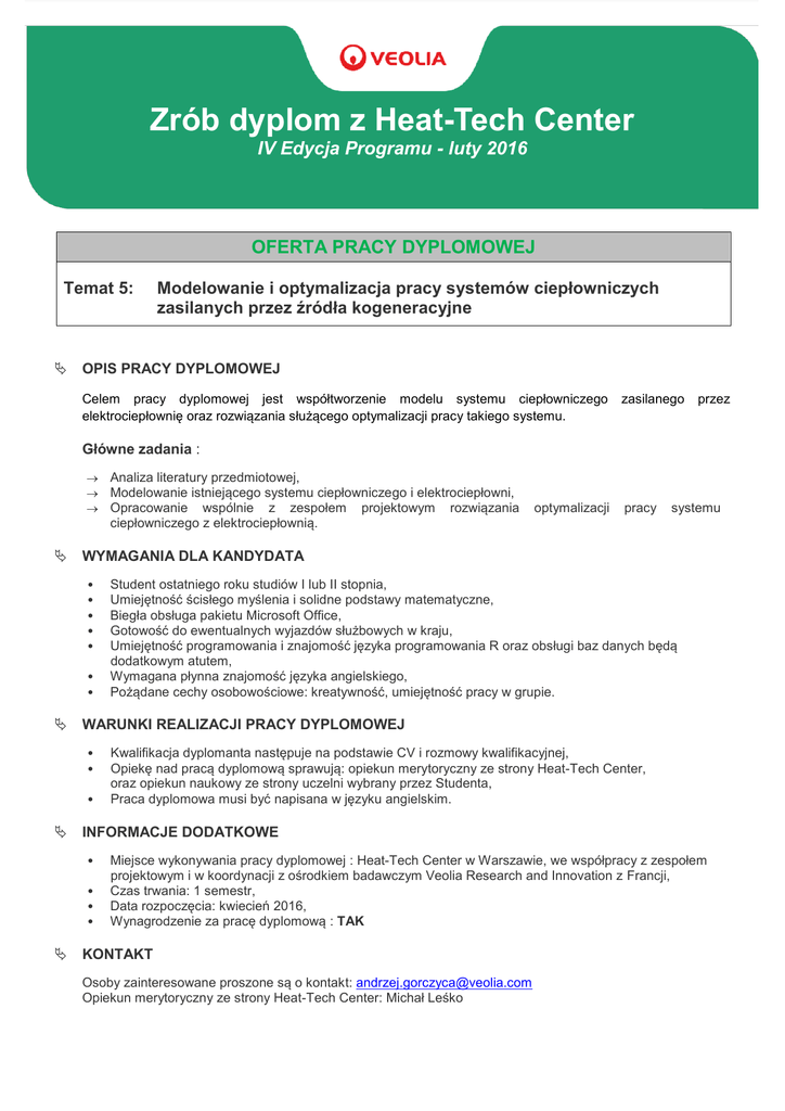 Zrób dyplom z Heat-Tech Center IV Edycja Programu - luty 2016 OFERTA PRACY DYPLOMOWEJ Temat 5:  Modelowanie i optymalizacja pracy systemów ciepłowniczych zasilanych przez źródła kogeneracyjne OPIS PRACY DYPLOMOWEJ Celem pracy dyplomowej jest współtworzenie modelu systemu ciepłowniczego elektrociepłownię oraz rozwiązania służącego optymalizacji pracy takiego systemu. zasilanego przez Główne zadania :     • • • systemu Student ostatniego roku studiów I lub II stopnia, Umiejętność ścisłego myślenia i solidne podstawy matematyczne, Biegła obsługa pakietu Microsoft Office, Gotowość do ewentualnych wyjazdów służbowych w kraju, Umiejętność programowania i znajomość języka programowania R oraz obsługi baz danych będą dodatkowym atutem, Wymagana płynna znajomość języka angielskiego, Pożądane cechy osobowościowe: kreatywność, umiejętność pracy w grupie. Kwalifikacja dyplomanta następuje na podstawie CV i rozmowy kwalifikacyjnej, Opiekę nad pracą dyplomową sprawują: opiekun merytoryczny ze strony Heat-Tech Center, oraz opiekun naukowy ze strony uczelni wybrany przez Studenta, Praca dyplomowa musi być napisana w języku angielskim. INFORMACJE DODATKOWE • • • •  pracy WARUNKI REALIZACJI PRACY DYPLOMOWEJ • •  optymalizacji WYMAGANIA DLA KANDYDATA • • • • •  Analiza literatury przedmiotowej, Modelowanie istniejącego systemu ciepłowniczego i elektrociepłowni, Opracowanie wspólnie z zespołem projektowym rozwiązania ciepłowniczego z elektrociepłownią. Miejsce wykonywania pracy dyplomowej : Heat-Tech Center w Warszawie, we współpracy z zespołem projektowym i w koordynacji z ośrodkiem badawczym Veolia Research and Innovation z Francji, Czas trwania: 1 semestr, Data rozpoczęcia: kwiecień 2016, Wynagrodzenie za pracę dyplomową : TAK KONTAKT Osoby zainteresowane proszone są o kontakt: [email protected] Opiekun merytoryczny ze strony Heat-Tech Center: Michał Leśko Zrób dyplom z Heat-Tech Center IV Edycja Programu - luty 2016 DISSERTATION OFFER Subject 5: Modeling and Optimization of district heating systems with combined heat and power production  DESCRIPTION OF THE DISSERTATION The goal of the diploma thesis is to co-develop a model of a DH system supplied by a CHP plant and a solution for optimization of such system’s operation. The diploma thesis will consist mainly in:     REQUIREMENTS FOR CANDIDATES • • • • • • •  • Candidates are qualified on the basis of their CV and an interview, The dissertation work will be supervised by: a technical supervisor delegated by Heat-Tech Center and a scientific supervisor chosen by the Student and delegated by the University, The dissertation must be written in English. ADDITIONAL INFORMATION • • • •  Graduate student Bachelor or Master level, Analytical thinking and strong mathematical skills, Strong ability of work with MS Office, Readiness for possible business trips within Poland, Programming skills and knowledge of R programming language as well as databases will be an additional advantage, The candidate must be fluent in English, Desired personality traits: creativity, ability to work in a team. TERMS AND CONDITIONS • •  Deep literature study, Modeling an existing DH system with a CHP plant, Development together with a project team of an optimization solution for optimization of a DH system supplied by a CHP plant. Place of conducting the research: Heat-Tech Center in Warsaw, integrated in a project team with strong coordination with Veolia Research and Innovation in France, Duration: 1 semester, Starting date: April 2016, Remuneration for the dissertation: YES CONTACT Interested persons are asked to contact us at: [email protected] Technical advisor in Heat-Tech Center: Michał Leśko