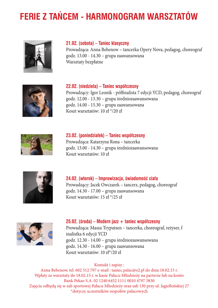 FERIE Z TAŃCEM - HARMONOGRAM WARSZTATÓW 21.02. (sobota) – Taniec klasyczny Prowadząca: Anna Bebenow – tancerka Opery Nova, pedagog, choreograf godz. 13.00 - 14.30 – grupa zaawansowana Warsztaty bezpłatne 22.02. (niedziela) – Taniec współczesny Prowadzący: Igor Leonik - półfinalista 7 edycji YCD, pedagog, choreograf godz. 12.00 - 13.30 – grupa średniozaawansowana godz. 14.00 - 15.30 – grupa zaawansowana Koszt warsztatów: 10 zł */20 zł 23.02. (poniedziałek) – Taniec współczesny Prowadząca: Katarzyna Rona – tancerka godz. 13.00 - 14.30 – grupa średniozaawansowana Koszt warsztatów: 10 zł 24.02. (wtorek) – Improwizacja, świadomość ciała Prowadzący: Jacek Owczarek – tancerz, pedagog, choreograf godz. 14.30 - 17.00 – grupa zaawansowana Koszt warsztatów: 15 zł */25 zł 25.02. (środa) – Modern jazz + taniec współczesny Prowadząca: Masza Tryputsen – tancerka, choreograf, reżyser, f inalistka 6 edycji YCD godz. 12.30 - 14.00 – grupa średniozaawansowana godz. 14.30 - 16.00 – grupa zaawansowana Koszt warsztatów: 10 zł*/20 zł Kontakt i zapisy : Anna Bebenow, tel: 602 512 797 e-mail : [email protected] do dnia 18.02.15 r. Wpłaty za warsztaty do 18.02.15 r. w kasie Pałacu Młodzieży na parterze lub na konto Bank Pekao S.A. 02 1240 6452 1111 0010 4797 5830 Zajęcia odbędą się w sali sportowej Pałacu Młodzieży oraz sali 130 przy ul. Jagiellońskiej 27 *dotyczy uczestników zespołów pałacowych