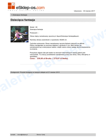 Utworzono : 03 marzec 2017 > Dziecięca fantazja Dziecięca fantazja Model : 60 Dziecięca fantazja w y t Producent : Obraz olejny namalowany ręcznie pt. "Dziecięca fantazja". Wymiary obrazu (szerokość x wysokość): 60x90 cm. k e Technika wykonania: Obraz namalowany ręcznie farbami olejnymi na płótnie. Płótno naciągnięte na sosnowy blejtram o grubości 2 cm. Boki obrazu są zamalowane są w kolorystyce całości, dzięki czemu obraz nadaje się do powieszenia na ścianie. p rs Powyższe zdjęcie (tak jak każde na stronach internetowych naszej galerii) jest rzeczywiste. To znaczy przedstawia namalowany przez nas obraz, który oferujemy w sprzedaży. e P a Cena : 339,00 zł Brutto ( 275,61 zł Netto) i r e Dostępność: Produkt dostępny w naszym sklepie od 21 marzec 2012 l a G kontakt : - [email protected] Strona 1/{nb}