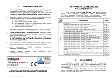 IV. 2. 3. 4. 5. 6. 7. INSTRUKCJA UŻYTKOWANIA Do mycia i dezynfekcji stosować należy łagodne preparaty posiadające atest Państwowego Zakładu Higieny. Nie używać środków ściernych! UWAGA: do mycia powierzchni miękkich nie wolno stosować środków na bazie benzyn, rozpuszczalników, kwasów, chloru, itp.! Cechowania wyrobów dokonano w postaci etykiety identyfikacyjnej, naklejonej na każdej sztuce. Znajdują się tam następujące dane: Dane producenta Nazwa i model wyrobu, np.: REF 01/MR Data produkcji w formacie: LOT RRRR-MM (gdzie RRRR oznacza rok, a MM oznacza miesiąc, np. 2014-07) Dopuszczalna masa użytkownika KUL ŁOKCIOWYCH Firma MIKIRAD produkuje kule łokciowe jako wyroby medyczne służące do poprawy mobilności osób niepełnosprawnych (wg Normy Zakładowej ZN-00/MK-01-2/2010 zharmonizowanej z Normą PN-EN ISO 9999 - klasa 12 03 oraz z DYREKTYWĄ RADY EUROPY 93/42/EEC). PN EN ISO 9999 Wszystkie wyroby (poza nasadkami) posiadają 2-letnią gwarancję. Używać wyroby zgodnie z ich przeznaczeniem! Ewentualne zagięcia elementów metalowych z widocznymi pęknięciami powierzchni eliminują wyrób z dalszego użytkowania. Nakazuje się sprawdzanie wyrobu przed i podczas użytkowania w celu upewnienia się, że podczas eksploatacji nie powstały zarysowania, pęknięcia itp. 12 03 06 1. UWAGI EKSPLOATACYJNE NAZWA WYROBU MODEL Kula łokciowa: - podwójna regulacja wysokości, podpórka odchylana -01/MR - podwójna regulacja wysokości, podpórka odchylana, miękki uchwyt -01/MR”M” - podwójna regulacja wysokości, podpórka stała -02/MR - podwójna regulacja wysokości, podpórka s tała, miękki uchwyt -02/MR”M” - regulowana dziecięca, miękki uchwyt -03/MR”M” - pojedyncza regulacja wysokości, podpórka stała -04/MR -04/MR.F - pojedyncza regulacja wysokości, podpórka stała, miękki uchwyt -04/MR”M” - pojedyncza regulacja wysokości, podpórka stała, ergonomiczny uchwyt -04/MR.E - pojedyncza regulacja wysokości, podpórka odchylana -05/MR - pojedyncza regulacja wysokości, podpórka odchylana, miękki uchwyt -05/MR”M” Serwis produkcyjny w okresie gwarancji (24 miesiące) obejmuje wymianę podzespołów lub wyrobów, w których stwierdzono wady produkcyjne. - pojedyncza regulacja wysokości, podpórka odchylana, ergonomi czny uchwyt -05/MR.E - pojedyncza regulacja wysokości, podpórka odchylana boczna -08/MR Serwis eksploatacyjny MIKIRAD w punktach sprzedaży wyrobów. - pojedyncza regulacja wysokości, podpórka odchylana boczna, miękki uchwyt -08/MR”M” - pojedyncza regulacja wysokości, podpórka odchylana boczna, ergonomiczny uchwyt -08/MR.E - podwójna regulacja wysokości, podpórka odchylana boczna -09/MR - podwójna regulacja wysokości, podpórka odchylana boczna, miękki uchwyt -09/MR”M” - pierścieniowa, miękki uchwyt -27/MR”M” MIKIRAD zapewnia produkcję 10 lat od daty wykonania wyrobu. funkcjonuje części bezpośrednio zamiennych przez I. Użytkownikom naszych wyrobów życzymy pełnej satysfakcji. Prosimy o ewentualne uwagi w celu dalszego ich doskonalenia. -data ostatniej aktualizacji: STYCZEŃ 2016 - UWAGI OGÓLNE Standardowe wyroby przeznaczone są dla użytkowników o wzroście do 185 cm i masie do 130 kg., a w przypadku kul dziecięcych dla osób o wzroście od 135 do 150 cm i wadze do 80 kg. Niezalecane przy braku jednej kończyny dolnej. Poszczególne wyroby dopasowuje się do wzrostu użytkownika poprzez przesunięcie połączonych ze sobą teleskopowo rurek do uzyskania żądanej wysokości, a następnie ich zablokowaniu. Ustalenie wysokości wyrobu uznaje się za właściwe, jeśli w czasie korzystania z wyrobu użytkownik przyjmuje wyprostowaną pozycję ciała, a wyrób pracuje pionowo, tj. w płaszczyźnie równoległej do osi ciała. Właściwa regulacja wysokości oraz poprawna eksploatacja naszych wyrobów znacznie wydłuża okres ich użytkowania oraz zapewnia uczucie bezpieczeństwa i zadowolenia użytkownika. II. W okresie zimowym należy stosować nasadkę zimową antypoślizgową), którą produkujemy w wersji uniwersalnej. KOLEJNOŚĆ CZYNNOŚCI PRZY SKOKOWEJ REGULACJI WYSOKOŚCI KUL ŁOKCIOWYCH - Rys. 2 1. 2. 3. 4. 5. III. 1. 2. 3. 4. 5. Odkręcić (poluzować) nakrętkę tulejki tłumiącej. Wypchnąć z otworów zatrzask podwójny w ten sposób, że dwoma kciukami naciskamy na obydwa czoła skrzydełek zatrzasku w kierunku grzbietu, co spowoduje ugięcie skrzydełek i wysunięcie stalowych kołków z otworów rurek. Zabrania się odginania skrzydełek zatrzasku, gdyż mogą ulec złamaniu lub utracą sprężystość. Przesunąć rurkę regulacyjną wzdłuż osi na odpowiadającą użytkownikowi wysokość pamiętając, że otwory rurki regulacyjnej muszą idealnie pokrywać się z otworami korpusu. Włożyć stalowe kołki zatrzasku w ustawione otwory i dłonią wcisnąć zatrzask do pełnego przylgnięcia wewnętrznej powierzchni zatrzasku do korpusu rurki. Dokręcić lekko nakrętkę tulejki tłumiącej. Rys.1 Rodzaje nasadek KOLEJNOŚĆ CZYNNOŚCI PRZY BEZSTOPNIOWEJ REGULACJI WYSOKOŚCI KUL ŁOKCIOWYCH - Rys. 3 Odkręcić (poluzować) w lewą stroną max. do dwóch obrotów nakrętkę blokady zewnętrznej [1] (nastąpi zwolnienie blokady zewnętrznej) Odkręcić (poluzować) w lewą stronę max. do jednego obrotu rurkę regulacyjną [2] do momentu, kiedy będzie wyczuwalna możliwość jej wzdłużnego przesuwania (zwolnienie blokady wewnętrznej) NIE ODKRĘCAĆ NADMIERNIE W LEWO RURKI REGULACYJNEJ, PONIEWAŻ ULEGNIE ONA NIEPOŻĄDANEMU ZABLOKOWANIU ! Przesunąć rurkę regulacyjną [2] wzdłuż osi na odpowiadającą użytkownikowi wysokość. Rurką regulacyjną [2] kręcić w prawo do czasu, aż wywołany opór spowoduje zablokowanie się rurek (nastąpi blokada mechanizmu wewnętrznego) Dokręcić nakrętkę blokady zewnętrznej [1] (blokada mechanizmu zewn.) Rys.2 Regulacja skokowa Rys.3 Regulacja bezstopniowa