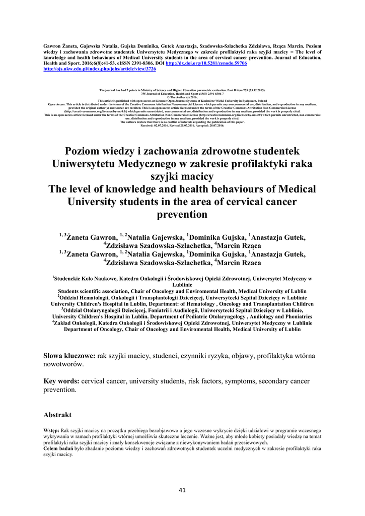 Gawron Żaneta, Gajewska Natalia, Gujska Dominika, Gutek Anastazja, Szadowska-Szlachetka Zdzisława, Rząca Marcin. Poziom wiedzy i zachowania zdrowotne studentek Uniwersytetu Medycznego w zakresie profilaktyki raka szyjki macicy = The level of knowledge and health behaviours of Medical University students in the area of cervical cancer prevention. Journal of Education, Health and Sport. 2016;6(8):41-53. eISSN 2391-8306. DOI http://dx.doi.org/10.5281/zenodo.59706 http://ojs.ukw.edu.pl/index.php/johs/article/view/3726 The journal has had 7 points in Ministry of Science and Higher Education parametric evaluation. Part B item 755 (23.12.2015). 755 Journal of Education, Health and Sport eISSN 2391-8306 7 © The Author (s) 2016; This article is published with open access at Licensee Open Journal Systems of Kazimierz Wielki University in Bydgoszcz, Poland Open Access. This article is distributed under the terms of the Creative Commons Attribution Noncommercial License which permits any noncommercial use, distribution, and reproduction in any medium, provided the original author(s) and source are credited. This is an open access article licensed under the terms of the Creative Commons Attribution Non Commercial License (http://creativecommons.org/licenses/by-nc/4.0/) which permits unrestricted, non commercial use, distribution and reproduction in any medium, provided the work is properly cited. This is an open access article licensed under the terms of the Creative Commons Attribution Non Commercial License (http://creativecommons.org/licenses/by-nc/4.0/) which permits unrestricted, non commercial use, distribution and reproduction in any medium, provided the work is properly cited. The authors declare that there is no conflict of interests regarding the publication of this paper. Received: 02.07.2016. Revised 25.07.2016. Accepted: 28.07.2016. Poziom wiedzy i zachowania zdrowotne studentek Uniwersytetu Medycznego w zakresie profilaktyki raka szyjki macicy The level of knowledge and health behaviours of Medical University students in the area of cervical cancer prevention 1, 3 Żaneta Gawron, 1, 2Natalia Gajewska, 1Dominika Gujska, 1Anastazja Gutek, 4 Zdzisława Szadowska-Szlachetka, 4Marcin Rząca 1, 3 Zaneta Gawron, 1, 2Natalia Gajewska, 1Dominika Gujska, 1Anastazja Gutek, 4 Zdzislawa Szadowska-Szlachetka, 4Marcin Rzaca 1 Studenckie Koło Naukowe, Katedra Onkologii i Środowiskowej Opieki Zdrowotnej, Uniwersytet Medyczny w Lublinie Students scientific association, Chair of Oncology and Enviromental Health, Medical University of Lublin 2 Oddział Hematologii, Onkologii i Transplantologii Dziecięcej, Uniwersytecki Szpital Dziecięcy w Lublinie University Children's Hospital in Lublin, Department: of Hematology , Oncology and Transplantation Children 3 Oddział Otolaryngologii Dziecięcej, Foniatrii i Audiologii, Uniwersytecki Szpital Dziecięcy w Lublinie, University Children's Hospital in Lublin. Department of Pediatric Otolaryngology , Audiology and Phoniatrics 4 Zakład Onkologii, Katedra Onkologii i Środowiskowej Opieki Zdrowotnej, Uniwersytet Medyczny w Lublinie Department of Oncology, Chair of Oncology and Enviromental Health, Medical University of Lublin Słowa kluczowe: rak szyjki macicy, studenci, czynniki ryzyka, objawy, profilaktyka wtórna nowotworów. Key words: cervical cancer, university students, risk factors, symptoms, secondary cancer prevention. Abstrakt Wstęp: Rak szyjki macicy na początku przebiega bezobjawowo a jego wczesne wykrycie dzięki udziałowi w programie wczesnego wykrywania w ramach profilaktyki wtórnej umożliwia skuteczne leczenie. Ważne jest, aby młode kobiety posiadały wiedzę na temat profilaktyki raka szyjki macicy i znały konsekwencje związane z niewykonywaniem badań przesiewowych. Celem badań było zbadanie poziomu wiedzy i zachowań zdrowotnych studentek uczelni medycznych w zakresie profilaktyki raka szyjki macicy. 41 Materiał i metody: Badania przeprowadzono wśród 110 studentek pielęgniarstwa i fizjoterapii na drugim stopniu kształcenia Uniwersytetu Medycznego w Lublinie. Ich wiek mieścił się w zakresie 21- 40 lat. Narzędzie badawcze stanowił autorski kwestionariusz ankiety. Wyniki badań poddano analizie statystycznej przy pomocy programu StatSoft Statistica 10.0 PL. Wyniki: Najczęściej wskazywanymi czynnikami ryzyka zwiększającymi prawdopodobieństwo zachorowania na raka szyjki macicy były: duża liczba partnerów seksualnych (96%), przewlekłe zakażenia wirusem HPV (94%), wczesny wiek inicjacji seksualnej (84) oraz częste i nieleczone stany zapalne pochwy (76%). Najczęściej wskazywanym objawem raka szyjki macicy było krwawienie, które pojawia się pomiędzy regularnymi krwawieniami miesięcznymi (85%). Połowa badanych zadeklarowała, że w przyszłości nie weźmie udziału w badaniach przesiewowych wczesnego wykrywania raka szyjki macicy. Wnioski: 1. Młode kobiety posiadają podstawową wiedzę dotyczącą profilaktyki raka szyjki macicy, ale nie zawsze przekłada się ona na pozytywne zachowania zdrowotne. 2. Należy podjąć zadania na rzecz zwiększenia zgłaszalności na badania przesiewowe wykrywające raka szyjki macicy. 3. W badaniach przesiewowych rzadziej biorą udział mieszkanki wsi oraz kobiety z niskim statusem socjoekonomicznym. Abstract Introduction: Cervical cancer is asymptomatic in its initial stages and its early detection due to participation in an early detection programme as part of secondary prevention enables its effective treatment. It is important for young women to be familiar with cervical cancer prevention and be aware of the consequences of failing to perform the screening tests. The objective of the study was to determine the level of knowledge and health behaviours of medical students in terms of cervical cancer prevention. Material and methods: The survey was conducted among 110 students of nursing and physiotherapy during their Master's degree studies at the Medical University of L